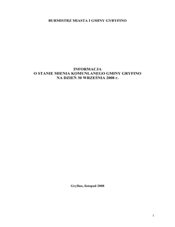 BURMISTRZ MIASTA I GMINY GYRYFINO INFORMACJA O STANIE MIENIA KOMUNLANEGO GMINY GRYFINO NA DZIEŃ 30 WRZEŚNIA 2008 r. Gryfino, listopad 2008 1 Zgodnie z art. 180 ustawy z dnia 30 czerwca 2005 r. o finansach publicznych, informacja o stanie mienia komunalnego winna zawierać dane dotyczące: przysługujących gminie praw własności, innych niż własność praw majątkowych, w tym w szczególności o ograniczonych prawach rzeczowych, użytkowaniu wieczystym, wierzytelnościach, udziałach w spółkach, akcjach oraz dane o zmianach w stanie mienia komunalnego od dnia złożenia poprzedniej informacji jak również wyszczególnienie dochodów uzyskanych z tytułu wykonywania prawa własności i innych praw majątkowych. 1. Prawa własności a/ grunty Według stanu na dzień 30.09.2008 r., Gmina Gryfino jest właścicielem i użytkownikiem wieczystym gruntów o łącznej powierzchni 1 190,7110 ha i łącznej wartości 112 451 767 zł. Struktura władania mieniem komunalnym: Lp. GRUNTY Powierzchnia w ha 1. stanowiące gminny zasób nieruchomości w a/ przekazane w trwały zarząd tym: b/ przekazane w użyczenie c/ przekazane w użytkowanie c/ będące w wieczystym użytkowaniu gminy 2. przekazane w użytkowanie wieczyste w tym: osobom fizycznym Razem Wartość w zł 1 071,0112 25,6756 31,3236 10,0283 22,4429 40 631 887,14 119,6998 22,3077 71 819 880,00 13 384 620,00 1 190,7110 112 451 767,14 2 Struktura gminnego zasobu nieruchomości: Miasto GRUNTY Wieś Powierzchnia / w ha / Tereny zabudowane 30,0175 59,5425 Tereny niezabudowane/Bp 26,2495 24,6299 Drogi 48,3010 242,4970 Tereny rolne 202,9726 346,0341 Pozostałe /rowy, wody, tereny różne, tereny przemysłowe, tereny rekreacyjne, cmentarz komunalny/ 41,0318 49,7353 348,5724 722,4388 RAZEM b/ Budynki budowle i lokale: Ogólna wartość budynków i budowli stanowiących własność Gminy Gryfino na dzień 30.09.2008 r. wynosi 88 800.303,70 złotych i przedstawia się następująco: Nazwa jednostki Urząd Miasta i Gminy Przedszkola W tym: Wartość budynków i budowli 1 246.714,77 Wartość ogółem 1 423.571,99 1 423.571,99 Przedszkole Nr 1 380.598,67 Przedszkole Nr 2 246.740,35 Przedszkole Nr 3 166.581,56 Przedszkole Nr 4 208.860,62 Przedszkole Nr 5 420.790,79 Szkoły 21 877.857,57 SP Nr 1 w Gryfinie 878.278,33 SP Nr 2 w Gryfinie 203.686,96 SP Nr 4 w Gryfinie 473.370,05 SP w Radziszewie SP Żabnicy Dom Nauczyciela w Żabnicy 1 246.714,77 21 877.857,57 1 229.558,93 149.863,00 11.539,96 Gimnazjum w Gryfinie 10 327.044,93 Zespół Szkół w Gardnie 2 674.984,73 Zespół Szkół w Chwarstnicy 3 766.708,68 3 Zespół Szkół Ogólnokształcących w Gryfinie ZEAS Gryfino Świetlica w Wełtyniu Gryfiński Dom Kultury Świetlice wiejskie 14.646,96 1 166.090,68 1 166.090,68 414.171,04 Świetlica w Wełtyniu 35.151,30 Świetlica w Daleszewie 35.720,00 51.906,24 Świetlica w Czepinie 4.216,92 Świetlica w Drzeninie 82.621,84 Świetlica w Krajniku 12.248,20 Świetlica w Krzypnicy 2.684,14 Świetlica w Mielenku Gryfińskim Świetlica w Sobiemyślu 76.976,60 Świetlica w Sobieradzu 17.523,90 49.147,90 314.012,32 Świetlica w Bartkowie 21.100,00 Świetlica w Borzymiu 9.069,78 Świetlica w Steklnie 15.200,00 Świetlica w Wysokiej Gryfińskiej 24.340,50 Ośrodek Pomocy Społecznej Biblioteka Publiczna 448.737,89 448.737,89 40.181,65 40.181,65 Pniewo 23.558,07 Chwarstnica 16.623,58 Ośrodek Sportu i Rekreacji w Gryfinie W tym|: 14.646,96 Świetlica w Nowym Czarnowie Świetlica w Dołgich Świetlica w Starych Brynkach W tym: 2 162.822,00 Budynki i budowle w części hotelowo rekreacyjnej Obiekty sportowe Pozostałe budynki i budowle 5 587.872,84 5 587.872,84 396.542,00 5 191.330,84 44 156.963,18 56 994.629,35 Razem: 88 800.303,70 c/ budynki i lokale mieszkalne i użytkowe: Gmina Gryfino jest właścicielem lub współwłaścicielem 183 budynków mieszkalnych, 918 lokali mieszkalnych oraz 59 lokali użytkowych. 4 d/ drogi Gmina Gryfino jest właścicielem łącznie 290,7980 ha gruntów stanowiących drogi, ciągi piesze i inne tereny komunikacyjne, o łącznej wartości: 16 018.814,13 zł 2. Inne niż własność prawa majątkowe a/ użytkowanie wieczyste gruntu: Gmina Gryfino, posiada w użytkowaniu wieczystym 22,4429 ha gruntów stanowiących własność Skarbu Państwa b/udziały w spółkach i akcje: Gmina Gryfino, posiada następujące udziały w spółkach: Nazwa spółki Kapitał zakładowy Wartość nominalna 1 udziału ( w zł ) Przedsiębiorstwo Usług Komunalnych Spółka z o.o. Gryfińskie Towarzystwo Budownictwa Społecznego Spółka z o.o. Przedsiębiorstwo Energetyki Cieplnej Spółka z o.o. Udział Gminy Wartość Ilość Ilość kapitału posiadanych udziałów udziałów składających zakładowego ( w zł ) się na kapitał zakładowy Wartość udziału Gminy ( w zł ) Udział w% 500,00 28.526 14.263.000 28.526 14.263.000 100 500,00 11.360 5.680.000 11.360 5.680.000 100 500,00 11.290 5.645.000 2.229 1.114.500 19,74 5 c/wierzytelności: Gmina Gryfino na dzień 30.09.2008 r., posiada wierzytelności na łączną kwotę 4 367 165,74 zł z następujących tytułów: L.p. 1. 2. 3. 4. 5. 6. 7. Tytuł wierzytelności Opłaty za użytkowane wieczyste nieruchomości Dzierżawy i najmy nieruchomości komunalnych Przekształcenia prawa użytkowania wieczystego Mandaty Opłaty adiacenckie Opłata eksploatacyjna Grzywna oświatowa 8. 9. Należności czynszowe w lokalach komunalnych Należności z tytułu kar Kwota / w zł / 151 173,31 115 490,27 27 422,70 176 514,13 9 477,00 3 831,75 9 819,65 679 657,93 3 193.779,00 Razem 3. Dane o zmianach w od 01.10.2007 r. do 30.09.2008 r. stanie 4 367 165,74 mienia komunalnego w okresie a/ zmniejszenie stanu mienia komunalnego: L.p. 1. Wyszczególnienie Powierzchnia Wartość w zł Grunty zabudowane i niezabudowane a/ zbyte w formie przetargu 12 1,2450 ha 633 543,00 b/ zbyte bezprzetargowo 14 0,4703 ha 169523,00 udziały 0,1612 ha 96 720,00 d/ przekształcenie prawa uż.wieczystego 17 1,0939 ha 656 340,00 e/ sprzedaż