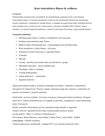 Kurs instruktora fitness & wellness Cel kursu: Profesjonalne przygotowanie uczestników do samodzielnego programowania i prowadzenia różnorodnych zajęć w wybranej specjalności ruchowej oraz przekazanie słuchaczom określonego zasobu wiadomości i umiejętności metodycznych, a następnie przygotowanie kadry instruktorskiej do pracy dydaktycznej, wychowawczej i rekreacyjnej w sekcjach, ośrodkach SPA, klubach fitness, szkołach - na różnych etapach kształcenia w ramach wychowania fizycznego i zajęć pozalekcyjnych. Tematyka szkolenia: • Definicja pojęć fitness, wellness, body&mind i ich znaczenie • Podstawy prowadzenia zajęć fitness • Budowa lekcji choreograficznej , wzmacniającej oraz prozdrowotnej • Rola instruktora w lekcji fitness - styl pracy • Podstawowe kroki stosowane w zajęciach fitness • Technika • Muzyka • Cueing - sposoby porozumiewania się instruktora z grupą • Metodyka nauczania - proces dydaktyczny • Streching i relaks w treningu • Trening funkcjonalny • Lekcje pokazowe – masterclass • Egzamin końcowy Zajęcia prowadzone będą w systemie weekendowym sobota - niedziela w jednostkach lekcyjnych 45 minutowych. Przerwy między zajęciami mogą ulec zmianie w zależności od potrzeb uczestników i potrzeb szkolenia. Każdy blok zawiera wykłady, ćwiczenia oraz pracę własną pod okiem instruktora. Program może być w trakcie modyfikowany ze względu na potrzeby, umiejętności i indywidualizację pracy ćwiczących. Każdy uczestnik zobowiązany jest do systematycznego udziału w zajęciach. Zasady zaliczeń i egzaminu końcowego zostaną podane podczas zjazdu. Liczba godzin: 140h ( w systemie weekendowym ) Prowadzący: Beata Burzawa, Anna Madej, Liliana Tkocz, Anna Zejler - Pędich Cena kursu: 1700,00 zł (brutto) Termin rozpoczęcia: październik - listopad 2013 ( po zebraniu chętnych osób ) Kurs instruktora kulturystyki Cel kursu • Wzrost wiedzy z zakresu treningu siłowo – aerobowego, jego wpływu na organizm pod kątem sportowym, rekreacyjnym i zdrowotnym. • Przygotowanie do prawidłowego i bezpiecznego korzystania z urządzeń i przyborów sali ćwiczeń siłowo – aerobowych. • Nabycie umiejętności do prowadzenia zajęć siłowych, przygotowanie do pracy w charakterze instruktora kulturystyki. Tematyka kursu • Historia sportów siłowych w Polsce i na świecie. • Bezpieczeństwo w sali ćwiczeń siłowych - zapoznanie z maszynami i przyrządami. • Znaczenie treningu siłowego - aerobowego w życiu codziennym i w sporcie. • Rola instruktora kulturystyki i trenera osobistego. • Rozgrzewka i stretching w treningu siłowym. • Omówienie i prezentacja poszczególnych ćwiczeń na mięśnie kończyn dolnych, brzucha i pleców z wykorzystaniem typowych przyrządów. • Omówienie i prezentacja poszczególnych ćwiczeń na mięśnie kończyn górnych, obręczy barkowej i klatki piersiowej z wykorzystaniem typowych przyrządów. • Ćwiczenia siłowe z wykorzystaniem ciężaru własnego ciała, TRX-a oraz piłek. • Trening siłowy w różnych dyscyplinach sportu. Metody szybkościowo-siłowe, trening obwodowo- stacyjny, funkcjonalny i crossfit. • Klasyfikacja środków i metod treningowych w treningu siłowym i aerobowym. • Kształtowanie masy i siły mięśniowej, trening na rzeźbę i w okresie regeneracyjnym. • Programy treningowe. Dopasowanie treningu siłowego do różnych potrzeb trenujących, zaawansowania, wieku i sprawności ruchowe, płci oraz typu budowy ciała. • Zawody kulturystyczne, pozy obowiązkowe i sędziowanie. • Dietetyka i wspomaganie w treningu siłowym i sportach sylwetkowych. Dla kogo: Kurs przeznaczony jest nie tylko dla przyszłych trenerów, instruktorów i nauczycieli, ale także dla wszystkich chcących dokonać przemiany na płaszczyźnie indywidualnej przez nabycie praktycznej i teoretycznej wiedzy z zakresu treningu siłowo – aerobowego. Zajęcia prowadzone będą w systemie weekendowym sobota - niedziela w jednostkach lekcyjnych 45 minutowych. Przerwy między zajęciami mogą ulec zmianie w zależności od potrzeb uczestników i potrzeb szkolenia. Każdy blok zawiera wykłady, ćwiczenia oraz pracę własną pod okiem instruktora. Program może być w trakcie modyfikowany ze względu na potrzeby, umiejętności i indywidualizację pracy ćwiczących. Każdy uczestnik zobowiązany jest do systematycznego udziału w zajęciach. Zasady zaliczeń i egzaminu końcowego zostaną podane podczas zjazdu. Liczba godzin: 130h ( w systemie weekendowym ) Prowadzący: Mateusz Bobrowski, Dawid Rzeźnik, Liliana Tkocz Cena kursu: 1600,00 zł (brutto) Termin rozpoczęcia: październik - listopad 2013 ( po zebraniu chętnych osób ) Dietetyka i suplementacja w zdrowym stylu życia Cel szkolenia: • Wzrost wiedzy z zakresu zdrowego stylu życia, który przełoży się na zwiększenie efektywności życiowej i zawodowej • Wzbudzenie potrzeby i nabycie umiejętności tworzenia i wdrażania w życie nowych nawyków żywieniowych dających motywację oraz siłę do pracy i treningu • Nabycie umiejętności zastosowania zdobytej wiedzy w praktyce Tematyka szkolenia: • Obliczanie podstawowej i całkowitej przemiany materii • Charakterystyka podstawowych składników odżywczych - węglowodany , tłuszcze, białka, składniki mineralne i witaminy • Produkty spożywcze jako źródło składników odżywczych • Wskaźniki charakteryzujące wartość odżywczą żywności, dodatki do żywności • Tabele składu i wartości odżywczej produktów spożywczych oraz informacja żywieniowa na opakowaniu • Zmiany wartości odżywczej podczas przechowywania i przetwarzania żywności, wzbogacanie żywności • Planowanie żywienia, ocena stanu odżywienia • Analiza składu ilościowego i jakościowego diety - jak wyliczyć zapotrzebowanie na białka, tłuszcze oraz węglowodany w poszczególnych posiłkach • Układanie diety pod względem aktualnego składu ciała i akty