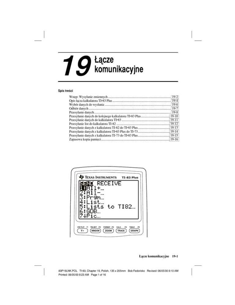 19 £¹cze komunikacyjne Spis treci Wstêp: Wysy³anie zmiennych ................................................................................... 19-2 Opis ³¹cza kalkulatora TI.83 Plus ............................................................................. 19-4 Wybór danych do wys³ania ....................................................................................... 19-6 Odbiór danych ............................................................................................................ 19-7 Przesy³anie danych..................................................................................................... 19-8 Przesy³anie danych do kolejnego kalkulatora TI.83 Plus...................................... 19-10 Przesy³anie danych do kalkulatora TI.83 ............................................................... 19-11 Przesy³anie list do kalkulatora TI-82 ...................................................................... 19-12 Przesy³anie danych z kalkulatora TI-82 do TI.83 Plus.......................................... 19-13 Przesy³anie danych z kalkulatora TI.83 Plus do TI-73.......................................... 19-14 Przesy³anie danych z kalkulatora TI-73 do TI.83 Plus.......................................... 19-15 Zapasowa kopia pamiêci.......................................................................................... 19-16 £¹cze komunikacyjne 19-1 83P19LNK.POL TI-83, Chapter 19, Polish, 135 x 205mm Bob Fedorisko Revised: 06/05/00 8:10 AM Printed: 06/05/00 8:23 AM Page 1 of 16 Wstêp: Wysy³anie zmiennych Niniejszy wstêp jest krótkim wprowadzeniem. Aby poznaæ szczegó³y, prosimy przeczytaæ ca³y rozdzia³. Utwórz i zapamiêtaj zmienn¹ oraz macierz, a nastêpnie przelij je do innego kalkulatora TI.83 Plus. 1. Bêd¹c w trybie ekranu pocz¹tkowego urz¹dzenia wysy³aj¹cego, nacinij 5 Ë 5 ¿ Q. Je¿eli chcesz zapamiêtaæ 5.5 jako Q, nacinij Í. 2. Nacinij y [ [ ] y [ [ ] 1 ¢ 2 y [ ] ] y [ [ ] 3 ¢ 4 y [ ] ] y [ ] ] ¿ 1. Aby zapamiêtaæ macierz jako [A], nacinij Í. 3. Wywo³aj menu MEMORY na ekranie urz¹dzenia wysy³aj¹cego; w tym celu nacinij y [MEM]. 4. Wybierz z tego menu pozycjê 2:Mem Mgmt/Del przez naciniêcie 2. Uka¿e siê wtedy menu MEMORY MANAGEMENT DELETE. 5. Wybierz z tego menu pozycjê 5:Matrix przez naciniêcie 5. Na ekranie uka¿e siê edytor MATRIX (macierzy). 6. Jeli chcesz zapamiêtaæ wartoæ [A] w archiwum kalkulatora wysy³aj¹cego, nacinij Í. Wtedy przy [A] uka¿e siê * (gwiazdka) potwierdzaj¹ca, ¿e wartoæ ta zosta³a zarchiwizowana. 19-2 £¹cze komunikacyjne 83P19LNK.POL TI-83, Chapter 19, Polish, 135 x 205mm Bob Fedorisko Revised: 06/05/00 8:10 AM Printed: 06/05/00 8:23 AM Page 2 of 16 7. Po³¹cz oba kalkulatory kablem, wciskaj¹c starannie oba jego koñce w gniazda. 8. W urz¹dzeniu odbieraj¹cym wywo³aj menu RECEIVE; w tym celu nacinij y [LINK] ~. Nacinij 1, aby wybraæ 1:Receive. Uka¿e siê wówczas komunikat Waiting... i zostanie wywietlony wskanik zajêtoci busy. 9. W urzadzeniu wysy³aj¹cym wywo³aj menu SEND: y [LINK] menu. 10. Nacinij 2, aby wybraæ 2:AllN. Uka¿e siê wówczas ekran AllN SELECT. 11. Za pomoc¹ klawisza , ustaw kursor wyboru ( 4 ) obok [A] MATRX. Nacinij Í. 12. Naciskaj , a¿ kursor wyboru znajdzie siê obok Q REAL. Nacinij Í. Kwadraciki obok [A] i Q wskazuj¹, ¿e obie pozycje zosta³y wybrane do wys³ania. 13. Na jednostce wysy³aj¹cej nacinij ~, aby wywietliæ menu TRANSMIT. 14. Aby rozpocz¹æ transmisjê w urz¹dzeniu wysy³aj¹cym, wybierz 1:Transmit naciskaj¹c 1. Urz¹dzenie odbieraj¹ce wywietli wówczas komunikat Receiving.... (Odbiór). Po przes³aniu wszystkich wybranych pozycji, oba urz¹dzenia wywietl¹ nazwê i typ ka¿dej przes³anej zmiennej. £¹cze komunikacyjne 19-3 83P19LNK.POL TI-83, Chapter 19, Polish, 135 x 205mm Bob Fedorisko Revised: 06/05/00 8:10 AM Printed: 06/05/00 8:23 AM Page 3 of 16 Opis ³¹cza kalkulatora TI.83 Plus Mo¿liwoci ³¹cza kalkulatora TI.83 Plus Kalkulator TI-83 Plus jest wyposa¿ony w port umo¿liwiaj¹cy mu komunikacjê z innym kalkulatorem TI-83 Plus, TI.83, TI-82, TI-73, systemem Calculator-Based Laboratoryé (CBLé) lub z systemem Calculator-Based Rangeré (CBRé). Dlatego te¿ do kalkulatora TI-83 Plus jest do³¹czony kabel pozwalaj¹cy na po³¹czenie obu urz¹dzeñ. Natomiast przy u¿yciu ³¹cza TI.GRAPH LINKé (wyposa¿enie opcjonalne) mo¿esz tak¿e po³¹czyæ TI-83 Plus z komputerem osobistym. Niniejszy rozdzia³ zawiera opis sposobu komunikacji z innym kalkulatorem. £¹czenie dwóch kalkulatorów TI.83 Plus Wszystkie zmienne i programy mog¹ byæ przenoszone z jednego kalkulatora TI.83 Plus do innego. Mo¿esz równie¿ wykonaæ kopiê zapasow¹ ca³ej pamiêci kalkulatora TI.83 Plus. ¦ W czasie przesy³ania danych, zmienne zachowane w pamiêci RAM kalkulatora wysy³aj¹cego TI.83 Plus zostan¹ przes³ane do pamiêci RAM odbieraj¹cego kalkulatora TI.83 Plus. ¦ Zmienne i aplikacje zachowane w archiwum danych u¿ytkownika w wysy³aj¹cym kalkulatorze TI.83 Plus zostan¹ przes³ane do archiwum danych u¿ytkownika odbieraj¹cego kalkulatora TI.83 Plus. TI.83 Plus jest wyposa¿ony w oprogramowanie umo¿liwiaj¹ce tê komunikacjê. Je¿eli chcesz przes³aæ dane z jednego kalkulatora TI.83 Plus do innego, wykonaj kroki procedury opisanej na stronach 19-6 i 19-7. £¹czenie kalkulatorów TI.83 i TI.83 Plus Wszystkie zmienne i programy mog¹ byc przesy³ane z TI.83 do TI.83 Plus ,o ile jest wystarczaj¹co du¿o miejsca w pamiêci RAM kalkulatora TI.83 Plus. Pamiêæ RAM kalkulatora TI.83 Plus jest trochê mniejsza ni¿ kalkulatora TI.83. Mo¿esz tak¿e przesy³aæ wszystkie zmienne z TI.83 Plus do TI.83,za wyj¹tkiem: aplikacji, zmiennych aplikacji, zmiennych zgrupowanych, nowych typów zmiennych lub programów zawieraj¹cych nowe elementy, takie jak funkcja Archive, UnArchive, Asm(, AsmComp oraz AsmPrgm. Jeli zmienne zarchiwizowane w TI.83 Plus s¹ zmiennymi rozpoznawanymi i u¿ywanymi przez TI.83, to m