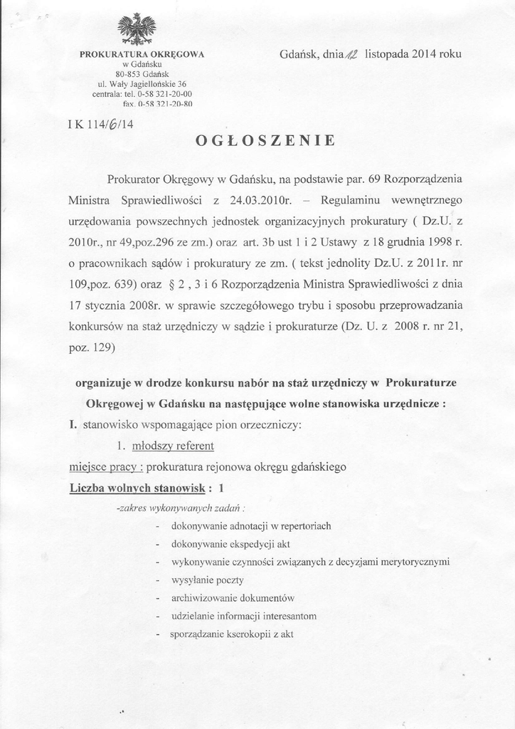 PRoKURATURA. oKRĘGowA w Gdańsku 80-853Gdansk uI.WaĘ Jagiellońskie36 centrala:tel. 0-58321-20-00 fax.0-58321-20-80 rK rr4t6t14 Gdańsk,dfia,ł. listopada2014 roku oGŁosZENIE Prokurator okręgowy w Gdńsku, na podstawiepar. 69 Rozporządzenia Ministra Sprawiedliwościz 24.03.20|0r. - Regulaminu wewnętrzlego urzędowania powszechnychj ednostek organizacyjnychprokuratury ( Dz.U . z 20l0r.,nr 49,po2.296ze zm.)oraz art.3bust 1 i 2 Ustawy z 18 grudnia1998r. o pracownikachsądów i prokuraturyze zm. ( tekstjednolity Dz.U. z 20|1r. nr z dnia \09,poz. 639)oraz $ 2, 3 i lRozporządzenia Ministra Sprawiedliwości |7 sĘcznia 2008r. w sprawie szczegółowegoĘbu i sposobu przeprowadzanra konkursów na staz vrzędniczy w sądzie i prokuraturze(Dz. U. z 2008 r. nr 2|, poz.I29) organizuje w drodze konkursu nabór na stażurzędniczy w Prokuraturze okręgowej w Gdańsku na następującewo|nestanowiskaurzędnicze : l. stanowiskowspomagające pion orzeczniczy: 1. młodszyreferent miejscepracy-:prokuraturarejonowaokręgugdanskiego Liczba wolnvchstanowisk: I -zalcreswykonyvanychzadań : - dokonywanieadnotacjiw repertoriach - dokonyvanie ekspedycji akt - wykonyrvanieczymości zvięanych z decyzjamimerytorycmymi . wysyłaniepoczty - archiwizowaniedokumentów - udzielanie informacji interesantom - sporządzaniekserokopii z akt L -wymag.aneh,ualifikacj e niezbędne): obstugikomputera wykształceniewyższepierwszego stopnia,umiejętnośó kwal iJikacje dodatkowe: zdolnośÓszybkiego uczenia się pracy w zespole,komunikat}','rłrośó, umiejętność Zgłoszenieo przystąpieniudo konkursu powinno z^w|erać. 1. podanieo dopuszczeniedo konkursu, 2. kwestionariusz osobowy (do pobrania na stronie intemetowej Prokuratury okręgowej w Gdańsku) 3. iyciorys, 4. urzędowo poświadczonyodpis dyplomu ukończenia wyżzszych studiów I stopnia i uzyskania Ętułuzawodowego lub przestępstwo kandydata,ize nie byłkaranyza przestępstwo 5. oświadczenie skarbowe onz ize nie jest prowadzoneprzeciwko niemu poĘpowanie o skalbowe, publicznegolub przestępstwo przestępstwościgane z oskarżenia 6. trzy zdjęcta. Wyżej wymienione dokumenty naleiy iloĘć w terminie do dnia 18 listopada 2014 roku, ze wskazaniem sygnatury konkursu w siedzibie Prokurafuryokręgowejw Gdańsku,80-853Gdansk,ul. WaĘ Jagiellońskie36' lub przesłaćpocńą,W razie przesłaniadokumentówdrogąpocŹowąza datęich złożzenia uważasię datęstemplapocztowego. Konkurs zostanie przeprowaózony w 3 etapach, w okresie od 18 listopada20|4r, _ 14 stycznia2015r.w siedzibieProkuraturyokręgowej w Gdańsku,ul. WĄ Jagiellońskie36. ogłoszeniao kolejnych etapachkonkursu będązamieszczanerryłącznie na stronie intemetowejProkuraturyokręgowej w Gdańsku ( kandydaci nie bęĘ informowani indywidualnie) . Konkurs w zostanie przeprowadzony na zasadach określonych RozporządzeniuMinistra Sprawiedliwościz dnia |7 stycznia 2008 r. w sprawie szczegółowegotrybu i sposobu przeprowadzarliakonkursów na Staz vrzędnlczy w sądzie i prokuraturze(Dz. U. z 2008 r. nr 21, poz' 129). Konkurs składasię ztrzech etapów: 1'l etapu I - setekcji wstępna zgjoszeń kandydatów pod kątem spełnienia wymogów formalnych przystąpienia do konkursu ( kompletnośódokumentów wskazanychw punktach l-6 ) 2/ etapl II - praktyczrregosprawdzianuumiejętności 3l etapulll - rozmowykwalifikacyjnej Wersja elektroniczra ogłoszeniaznajduje się na stronie intemetowej Prokuraturyokręgowejw Gdansku.