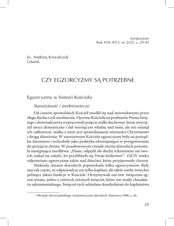 Sympozjum Rok XVII 2013, nr 2(25), s. 29-43 ks. Andrzej Kowalczyk Gdańsk CZY EGZORCYZMY SĄ POTRZEBNE Egzorcyzmy w historii Kościoła Starożytność i średniowiecze Od czasów apostolskich Kościół modlił się nad zniewolonymi przez złego ducha o ich uwolnienie. Ojcowie Kościoła na podstawie Pisma Świętego i doświadczenia wypracowali pojęcie walki duchowej: Jezus zwyciężył moce demoniczne i dał wierzącym władzę nad nimi, ale nie usunął ich całkowicie, walka z nimi jest sprawdzianem wierności Chrystusowi i drogą zbawienia. W starożytnym Kościele egzorcyzmy były na porządku dziennym i wchodziły jako praktyka obowiązująca w przygotowanie do przyjęcia chrztu. W posoborowym rytuale chrztu dorosłych pozostała następująca modlitwa: „Panie, odpędź złe duchy tchnieniem ust swoich, nakaż im odejść, bo przybliżyło się Twoje królestwo”1. Od IV wieku odprawiano egzorcyzmy także nad dziećmi, które przyjmowały chrzest. Niekiedy chrzest dorosłych poprzedzało kilka egzorcyzmów. Były one tak częste, że odprawiali je nie tylko kapłani, ale także osoby świeckie pełniące jakieś funkcje w Kościele. Otrzymywali oni tzw. święcenia egzorcystatu, jedno z czterech niższych święceń, które nie miały charakteru sakramentalnego. Święceń tych udzielano kandydatom do kapłaństwa 1 Obrzędy chrześcijańskiego wtajemniczenia dorosłych, Katowice 1988, s. 44. 29 ks. Andrzej Kowalczyk aż do czasów II Soboru Watykańskiego. Dlaczego w Kościele starożytnym egzorcyzmy były tak potrzebne? Dlatego że religie pogańskie były powiązane z okultyzmem, a życie codzienne poganina było mocno naznaczone praktykami magicznymi, co łączyło się z działalnością demonów. Wypędzanie złych duchów przez chrześcijan było w pierwotnym Kościele ważnym argumentem za boskim pochodzeniem chrześcijaństwa. Tylko oni mogli się przeciwstawić złemu duchowi. W wiekach średnich egzorcyzmy zeszły na dalszy plan. W ostatnich dwóch wiekach środowiska liberalne zaatakowały egzorcyzmy jako zabobon, i chociaż Kościół nie zaprzestał tej formy walki duchowej, zaczął do niej podchodzić z wielką ostrożnością. Sobory wyjątkowo podejmują temat diabła i walki duchowej. Sobór Trydencki, wyjaśniając znaczenie sakramentu pojednania, podkreśla, że przez grzech popełniany po chrzcie człowiek dostaje się „pod władzę szatana”2. W tym wypadku powtarza prawie dokładnie to, co Jezus mówi w Ewangelii św. Jana: „Każdy, kto popełnia grzech, jest niewolnikiem grzechu” (8,34). II Sobór Watykański natomiast naucza: „W ciągu bowiem całej historii ludzkiej toczy się ciężka walka przeciw mocom ciemności; walka ta zaczęta ongiś u początków świata, trwać będzie do ostatniego dnia, według słowa Pana. Wplątany w nią człowiek wciąż musi się trudzić, aby trwać w dobrym i nie będzie mu dane bez wielkiej pracy oraz pomocy łaski Bożej osiągnąć jedności w sobie samym”3. Czasy współczesne W ostatnim półwieczu zainteresowanie problemem opętania i egzorcyzmów wyraźnie wzrosło. Opętania stały się tematem filmów, licznych książek i artykułów w bardzo poczytnych pismach, ale nagonka na egzorcyzmy nie ustaje, a nawet się wzmogła. Świat medycyny, a dokład- 2 Sobór Trydencki, Nauka o sakramencie pokuty, w: S. Głowa SJ, I. Bieda SJ (opr.) Breviarium Fidei, Poznań 1997, s. 433. 3 Sobór Watykański II, Konstytucja o Kościele w świecie współczesnym Gaudium et spes, 37. 30 Czy egzorcyzmy są potrzebne nie psychiatrii, wszelkie niezwykłe zachowania człowieka zalicza do chorób psychicznych i z uporem nie chce przyjąć do wiadomości, że pewnych zjawisk nie da się wytłumaczyć inaczej jak ingerencją złego ducha. Warto zwrócić uwagę, że w Słowniku ortograficznym języka polskiego wydanym w Warszawie w 1975 roku nie ma słowa „opętanie”. Na potępienie egzorcyzmów wielki wpływ miały wydarzenia w Klingenbergu, gdzie w 1976 roku zmarła dwudziestotrzyletnia studentka, opętana i poddawana egzorcyzmom Anneliese Michel. Jej rodzinę i egzorcystę oskarżono o doprowadzenie do tej śmierci, i chociaż nie było na to dowodów, sąd uznał ich za winnych. Historia Anneliese to osobny temat. Zainteresowanie opętaniami wzrosło w związku z wielką popularnością zespołów muzycznych, które miały w repertuarze utwory bluźniercze, ubliżające Bogu, a chwalące Szatana i oczywiście powstanie kościołów satanistycznych. Muzyka z tekstami satanistycznymi, moda na satanizm, Biblia Szatana w Internecie – wszystko to przyczyniło się do wielkiego wzrostu przypadków opętań i w konsekwencji do zainteresowania egzorcyzmami oraz powstania swego rodzaju ruchu egzorcystycznego. Dużą rolę w demaskowaniu wpływu złego ducha na dzisiejszego człowieka odegrał ruch Odnowy w Duchu Świętym. Na różnych nabożeństwach w ramach tego ruchu dochodzi bowiem do manifestacji złego ducha. Pomimo sceptycyzmu w stosunku do egzorcyzmów nawet w pewnych środowiskach teologów katolickich – przede wszystkim we Francji i w Niemczech – papież Jan Paweł II zgodnie z zaleceniami II Soboru Watykańskiego zatwierdził w 1998 roku wydanie nowego Rituale Romanum zawierającego „egzorcyzmy i inne modlitwy błagalne”4. W Kościele katolickim działają od niedawna dwie organizacje o charakterze międzynarodowym, które zajmują się szkoleniem kapłanów i ludzi świeckich do udzielania pomocy opętanym i zniewolonym: założony przez rzymskiego egzorcystę ks. Gabriele Amortha Association International of Exorcists oraz założony przez hinduskiego charyzmatyka ks. Rufusa Pereirę Interntional Association for Deliverance. 4 Egzorcyzmy i inne modlitwy błagalne, Katowice 2013. 31 ks. Andrzej Kowalczyk Kilka wyjaśnień wstępnych na temat zniewoleń demonicznych i opętań Diabeł nie może wpływać na nasze życie nadprzyrodzone, tzn. nie może odebrać nam łaski uświęcającej. Jest to dzi