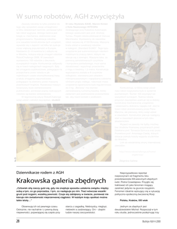 Zawody robotów to tylko pretekst do tego aby sprawdzić swoje umiejętności w kilku dziedzinach techniki, ponieważ tylko taki robot wygrywa, którego twórca jest biegły w: mechanice, elektronice oraz programowaniu. Rywalizacja robotów, a w zasadzie konstruktorów tych urządzeń, wywodzi się z Japonii i od kilku lat zyskuje coraz większą popularność w Europie. Niedawno (5 i 6 kwietnia br.) odbyła się w Wiedniu, kolejna edycja zmagań robotów RobotChallenge 2008. W zawodach wystawiono 100 robotów z dwunastu europejskich krajów. Konkurencje odbywały się w trzech kategoriach wagowych. Były też zmagania szybkościowe, polegające na przejechaniu przez robota w jak najkrótszym czasie skomplikowanej trasy, a także zmagania zręcznościowe, polegające na zbieraniu przez maszynę plastikowych krążków. Rywalizacji maszyn towarzyszy duże zainteresowanie publiczności, ponieważ popisy walczących robotów są bardzo widowiskowe. W tegorocznej edycji RobotChallenge wziął udział i odniósł zwycięstwo, student IV roku Wydziału EAIiE, Marcin Kmieć z Koła Naukowego INTEGRA działającego przy Katedrze Automatyki, którego opiekunem jest prof. Andrzej Turnau. Projekt robota pilotował dr Dariusz Marchewka. Wystawiony do zawodów robot nazywa się #103 Bonzoq. Maszyna brała udział w rywalizacji robotów w kategorii „Standard SUMO”. Tego typu urządzenie jest autonomicznym robotem mobilnym to znaczy takim, którym nie steruje się z zewnątrz. Maszyna taka, za pomocą zainstalowanych czujników i komputera pokładowego, musi sama zlokalizować i wypchnąć przeciwnika z ringu o średnicy 1,5 metra. Konstrukcja wyposażona została w 8 czujników odległości, sterowana jest układem mikroprocesorowym i napędzana czterema silnikami prądu stałego, natomiast masa urządzenia ograniczona była regulaminowo do 3 kg. „Bonzoq” ma również zainstalowaną ruchomą łopatkę, której zadaniem jest podnoszenie przeciwników tak, aby tracili kontakt z podłożem. fot. ZS W sumo robotów, AGH zwyciężyła Konkurencja, w której wziął udział nasz robot rozgrywana była w systemie pucharowym. Numer 103 zwyciężył we wszystkich turniejach. Twórca robota, przyczyn zwycięstwa upatruje się w dobrej konstrukcji mechanicznej urządzenia i właściwemu dobraniu napędu kół. Jest to trzeci robot skonstruowany przez Pana Marcina, ale pierwszy, który wziął udział w zawodach. Konstruktor planuje następny start w zawodach jeszcze w tym roku akademickim. Wyjazd na zawody nie byłby możliwy bez środków finansowy przyznanych przez Dziekana prof. Tomasza Szmuca oraz przez Prorektora prof. Antoniego Cieślę, których dotacje pokryły koszty wyjazdu studentów do Wiednia. Link do wiedeńskiej strony internetowej zawodów: fot. ZS http://www.robotchallenge.at/home/ ergebnisse/ Zbigniew Sulima Dziennikarze rodem z AGH Krakowska galeria zbędnych „Człowiek siłą rzeczy gubi się, gdy nie znajduje sposobu ustalenia związku między sobą a tym, co go poprzedza, i tym, co następuje po nim. Traci wówczas wszelki grunt pod nogami, wszelką pewność. Czuje się zabłąkany w świecie, ponieważ nie kieruje nim świadomość nieprzerwanej ciągłości. W każdym kraju spotkać można takie istoty…” Obserwuję ich od pewnego czasu. Ostrożnie, nie nachalnie i z pewną dozą niepewności, pojawiającej się często przy 28 starciu z zagadką. Niebrzydcy, niegłupi, niebiedni a zadziwiający. Oni – zbędni ludzie naszej rzeczywistości. Nieprzypadkowo reportaż rozpoczynam od fragmentu listu przedstawiciela XIX-wiecznych zbędnych ludzi, Piotra Czaadajewa. Przyjęło się traktować ich jako fenomen mogący zaistnieć jedynie na gruncie rosyjskim. Fenomen idealnie wpisujący się w sytuację polityczno-społeczną ówczesnej Rosji. Polska, Kraków, XXI wiek Jednym ze zbędnych jest dwudziestoletni Michał. Rozpoczął w tym roku studia, jednocześnie podejmując trzy Biuletyn AGH 4-2008 kierunki. Zabiegany, ze wzrokiem utkwionym zawsze gdzieś daleko, gdzieś „poza”. Można odnieść wrażenie, że nie jest zainteresowany tym, co go otacza. Z drugiej strony każdy jego gest czy spojrzenie zdają się wskazywać na fakt nieustannego, męczącego „wchłaniania” świata, które wiedzie ku zmęczeniu, ku pragnieniu, by choć na chwilę o tym świecie zapomnieć i pozostać poza tym, co rzeczywiste. Wyczuć też można bliżej nieokreślony ból i smutek wpisany w każde wypowiadane przez niego słowo. Twierdzi, iż interesuje go wszystko, każda „możliwa i niemożliwa sfera nauki i życia”. Studiuje prawo, filologię polską-komparatystykę i psychologię. Wydaje się osobą zbyt dojrzałą jak na swój wiek. Sprawia wrażenie obciążonego niezwykłym bagażem. Bagażem doświadczeń, a może myśli. Gdy zaczynam rozmowę, Michał przybiera teatralną pozę. Jego głos przyjmuje nienaturalną barwę. Z udawanym spokojem rozgląda się wokół, próbując ukryć zmieszanie. Przesadnie gestykuluje. Trudno stwierdzić, czy jego ekscentryczne zachowanie, którego przykładem jest także nerwowy i teatralny śmiech, występujący w najmniej spodziewanych miejscach, to tylko poza. Jeśli zadać mu pytanie, staje się rozmowny. Rozprawia głównie o tym, co należałoby zrobić dla człowieka, dla kraju i dla świata. Sięga po utopistyczne idee, by je werbalnie upragmatycznić. Werbalnie – boi się bowiem działania w sferze rzeczywistej. Jest w nim niewiara w powodzenie i pesymistyczny, krytyczny zamysł nad światem. Dostrzega bezsens rzeczywistości, przeciwko któremu protestuje, a jednocześnie tkwi w lęku i wątpliwości w możliwość zmiany. Uczy się dużo, gdyż wierzy, że (cytuję za Michałem) – „przy obecnej anomii i anomalii, w jakiej pogrążony jest świat nasz, wyzuty z pradawnych głębszych wartości, możliwość obcowania z pewną formą sensu zapewnić może jedynie nauka”. Michał odczuwa swoją „zbędność” bardzo głęboko. S