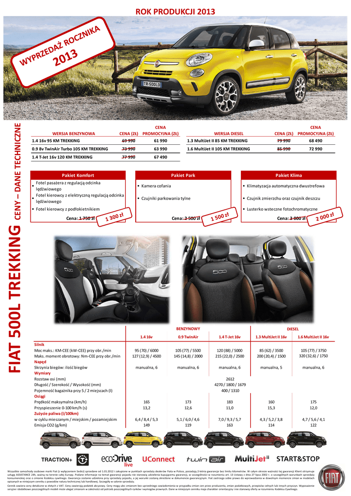 FIAT 500L TREKKING CENY – DANE TECHNICZNE ROK PRODUKCJI 2013 WERSJA BENZYNOWA CENA CENA (ZŁ) PROMOCYJNA (ZŁ) WERSJA DIESEL CENA CENA (ZŁ) PROMOCYJNA (ZŁ) 1.4 16v 95 KM TREKKING 69 990 61 990 1.3 MultiJet II 85 KM TREKKING 79 990 68 490 0.9 8v TwinAir Turbo 105 KM TREKKING 73 990 63 990 1.6 MultiJet II 105 KM TREKKING 85 990 72 990 1.4 T-Jet 16v 120 KM TREKKING 77 990 67 490 Pakiet Komfort Fotel pasażera z regulacją odcinka • lędźwiowego Fotel kierowcy z elektryczną regulacją odcinka • lędźwiowego Pakiet Park Pakiet Klima • Kamera cofania • Klimatyzacja automatyczna dwustrefowa • Czujniki parkowania tylne • Czujnik zmierzchu oraz czujnik deszczu • Fotel kierowcy z podłokietnikiem • Lusterko wsteczne fotochromatyczne Cena: 1 750 zł Cena: 2 500 zł Cena: 3 000 zł BENZYNOWY Silnik Moc maks.: KM-CEE (kW-CEE) przy obr./min Maks. moment obrotowy: Nm-CEE przy obr./min Napęd Skrzynia biegów: ilość biegów Wymiary Rozstaw osi (mm) Długość / Szerokość / Wysokość (mm) Pojemność bagażnika przy 5 / 2 miejscach (l) Osiągi Prędkość maksymalna (km/h) Przyspieszenie 0-100 km/h (s) Zużycie paliwa (l/100km) w cyklu mieszanym / miejskim / pozamiejskim Emisja CO2 (g/km) DIESEL 1.4 16v 0.9 TwinAir 1.4 T-Jet 16v 1.3 MultiJet II 16v 1.6 MultiJet II 16v 95 (70) / 6000 127 (12,9) / 4500 105 (77) / 5500 145 (14,8) / 2000 120 (88) / 5000 215 (22,0) / 2500 85 (62) / 3500 200 (20,4) / 1500 105 (77) / 3750 320 (32,6) / 1750 manualna, 6 manualna, 6 manualna, 6 manualna, 5 manualna, 6 2612 4270 / 1800 / 1679 400 / 1310 165 13,2 173 12,6 183 11,0 160 15,3 175 12,0 6,4 / 8,4 / 5,3 149 5,1 / 6,0 / 4,6 119 7,0 / 9,3 / 5,7 163 4,3 / 5,2 / 3,8 114 4,7 / 5,6 / 4,1 122 Wszystkie samochody osobowe marki Fiat (z wyłączeniem Sedici) sprzedane od 1.01.2012 i zakupione w punktach sprzedaży dealerów Fiata w Polsce, posiadają 2-letnia gwarancje bez limitu kilometrów. W całym okresie ważności tej gwarancji Klient otrzymuje usługę ASSISTANCE 24h, ważną na terenie całej Europy. Podane informacje na temat gwarancji pojazdu nie stanowią udzielenia kupującemu gwarancji, w szczególności w rozumieniu art. 13 Ustawy z dnia 27 lipca 2002 r. o szczególnych warunkach sprzedaży konsumenckiej oraz o zmianie Kodeksu cywilnego. Gwarancja zostanie udzielona przy sprzedaży pojazdu, a jej warunki zostaną określone w dokumencie gwarancyjnym. Fiat zastrzega sobie prawo do wprowadzenia w dowolnym momencie zmian w modelach opisanych w niniejszym cenniku z powodów natury technicznej lub handlowej. Szczegóły w salonie sprzedaży. Cennik zawiera ceny detaliczne w złotych z VAT. Ceny zawierają podatek akcyzowy. Ceny mogą ulec zmianom bez uprzedniego zawiadomienia w przypadku zmian cen przez producenta, zmian podatkowych, przepisów celnych lub innych przyczyn. Wyposażenie seryjne i dodatkowe poszczególnych modeli może ulegać zmianom w zależności od potrzeb poszczególnych rynków i wymogów prawnych. Dane w niniejszym cenniku maja charakter orientacyjny i nie stanowią oferty w rozumieniu Kodeksu Cywilnego. ROK PRODUKCJI 2013 KOMFORT/FUNKCJONALNOSC NADWOZIE I STYL FELGI AUDIO PAKIETY FIAT 500L TREKKING WYBRANE ELEMENTY WYPOSAŻENIA BEZPIECZENSTWO TREKKING Poduszki powietrzne kierowcy i pasażera Poduszki powietrzne boczne Poduszki powietrzne kurtynowe System ESP (zawiera systemy: ASR + MSR, ABS + EBD, Hill Holder, DST, ERM) System Traction+ Światła do jazdy dziennej (DRL) Światła przeciwmgielne z funkcja doświetlania zakrętów Światła zewnętrzne z funkcja Follow Me Home Trzeci tylny zagłówek Lusterko wsteczne fotochromatyczne Poduszka powietrzna kolanowa kierowcy System City Brake Control Elektrycznie sterowane i podgrzewane lusterka zewnętrzne Elektrycznie sterowane szyby przednie Elektrycznie sterowane szyby tylne Fix&Go - zestaw do naprawy opon ze sprężarka Fotel kierowcy z regulacja wysokości Fotel pasażera składany w stolik Galka skrzyni zmiany biegów pokryta skóra Górny zamykany klimatyzowany schowek w desce rozdzielczej Kierownica pokryta skóra ze sterowaniem radioodtwarzaczem (dodatkowo z manetkami zmiany biegów w przypadku skrzyni Dualogic) Klimatyzacja manualna Kolumna kierownicy z regulacja w dwóch płaszczyznach Komputer pokładowy MyCar Podwójna podłoga bagażnika Cargo Magic Space Centralny zamek z sterowaniem pilotem w kluczyku GSI (Gear Shift Indicator) - wskaźnik sugerujący zmianę biegu w celu obniżenia zużycia paliwa Podłokietnik na tylnej kanapie System Start&Stop System tankowania Smart Fuel Tempomat Tylna kanapa przesuwana, składana i dzielona w proporcji 60/40 z systemem Fold&Tumble Wspomaganie kierownicy (elektryczne) Dualdrive Wykończenie deski rozdzielczej lakierowane w kolorze nadwozia Czujnik zmierzchu oraz czujnik deszczu Fotele przednie ze składanymi stolikami i kieszeniami Kamera cofania Klimatyzacja automatyczna dwustrefowa Podgrzewacz PTC Fotel kierowcy z elektryczna regulacja odcinka lędźwiowego Fotel kierowcy z podłokietnikiem Fotel pasażera z regulacja odcinka lędźwiowego Fotel pasażera z regulacja wysokości Fotele przednie podgrzewane Przednia szyba podgrzewana Schowek pod siedzeniem pasażera Wewnętrzne lusterko do obserwowania pasażerów tylnej kanapy Pakiet na niskie temperatury Czujniki parkowania tylne Koło zapasowe dojazdowe Zestaw dla palących (zapalniczka i popielniczka) Listwy boczne ochronne drzwi w kolorze czarnym z elementami satynowanymi Listwy ochronne z tworzywa sztucznego na nadkolach oraz progach Lusterka zewnętrzne lakierowane w kolorze nadwozia Przyciemniane szyby boczne i tylna Satynowane klamki zewnętrzne Zderzaki lakierowane w kolorze nadwozia z dodatkowymi osłonami Szklany stały dach z elektrycznie otwierana roleta przeciwsłoneczna Szklany dach elektrycznie otwierany Lakier bi-colore Lakier metalizowany Lakier pastelowy • • • • • • • • • 800 zł 1 000 zł 1 500 zł 410 150 6DC • • • • • • • • • • • • • • • • • / -* 