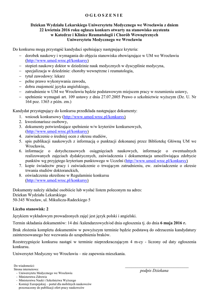 OGŁOSZENIE Dziekan Wydziału Lekarskiego Uniwersytetu Medycznego we Wrocławiu z dniem 22 kwietnia 2016 roku ogłasza konkurs otwarty na stanowisko asystenta w Katedrze i Klinice Reumatologii i Chorób Wewnętrznych Uniwersytetu Medycznego we Wrocławiu Do konkursu mogą przystąpić kandydaci spełniający następujące kryteria: dorobek naukowy i wymagania do objęcia stanowiska obowiązujące w UM we Wrocławiu (http://www.umed.wroc.pl/konkursy) stopień naukowy doktor w dziedzinie nauk medycznych w dyscyplinie medycyna, specjalizacja w dziedzinie: choroby wewnętrzne i reumatologia, tytuł zawodowy: lekarz pełne prawo wykonywania zawodu, dobra znajomość języka angielskiego, zatrudnienie w UM we Wrocławiu będzie podstawowym miejscem pracy w rozumieniu ustawy, spełnienie wymagań art. 109 ustawy z dnia 27.07.2005 Prawo o szkolnictwie wyższym (Dz. U. Nr 164 poz. 1365 z późn. zm.) Kandydat przystępujący do konkursu przedkłada następujące dokumenty: 1. wniosek konkursowy (http://www.umed.wroc.pl/konkursy) 2. kwestionariusz osobowy, 3. dokumenty potwierdzające spełnienie w/w kryteriów konkursowych, (http://www.umed.wroc.pl/konkursy) 4. zaświadczenie o średniej ocen z okresu studiów, 5. spis publikacji naukowych z informacją o punktacji dokonanej przez Bibliotekę Główną UM we Wrocławiu, 6. informacje o dotychczasowych osiągnięciach naukowych, informacje o ewentualnych realizowanych zajęciach dydaktycznych, zaświadczenia i dokumentacja umożliwiająca zdobycie punktów wg przyjętego kryterium punktowego w Uczelni (http://www.umed.wroc.pl/konkursy) 7. kopie świadectw pracy i zaświadczenie o trwającym zatrudnieniu, ew. zaświadczenie o okresie trwania studiów doktoranckich, 8. oświadczenia określone w Regulaminie konkursu (http://www.umed.wroc.pl/konkursy) Dokumenty należy składać osobiście lub wysłać listem poleconym na adres: Dziekan Wydziału Lekarskiego 50-345 Wrocław, ul. Mikulicza-Radeckiego 5 Liczba stanowisk: 2 Językiem wykładowym prowadzonych zajęć jest język polski i angielski. Termin składania dokumentów: 14 dni /kalendarzowych/od dnia ogłoszenia tj. do dnia 6 maja 2016 r. Brak złożenia kompletu dokumentów w powyższym terminie będzie podstawą do odrzucenia kandydatury zainteresowanego bez wezwania do uzupełnienia braków. Rozstrzygnięcie konkursu nastąpi w terminie nieprzekraczającym 4 m-cy - liczony od daty ogłoszenia konkursu. Uniwersytet Medyczny we Wrocławiu – nie zapewnia mieszkania. Do wiadomości: Strona internetowa: - Uniwersytetu Medycznego we Wrocławiu - Ministerstwa Zdrowia - Ministerstwa Nauki i Szkolnictwa Wyższego - Komisji Europejskiej – portal dla mobilnych naukowców przeznaczony do publikacji ofert pracy naukowców ______________________________ podpis Dziekana CALL FOR APPLICATIONS 22nd April 2016 Dean Faculty of Medicine, Wroclaw Medical University announces an open Competition for the position of Assistant in the Department and Clinic of Rheumatology and Internal Medicine Wroclaw Medical University Entry Requirements: - scientific achievements and the workstation requirements (http://www.umed.wroc.pl/konkursy) - a doctoral degree in medical science in the discipline of Medicine, - specialization in the field of internal medicine and rheumatology - professional title: doctor - full right to practice medicine, - fluent in Polish and English, - employment in Wroclaw Medical University will be the basic place of employment, - fulfillment of the requirements of art. 109 of the Act of 27.07.2005 Law on Higher Education (Dz. U. Nr. 164 item. 1365 5). Required documents: 1. 2. 3. 4. 5. application form (http://www.umed.wroc.pl/konkursy), personal questionnaire, documents specified in criteria of the Contest, (http://www.umed.wroc.pl/konkursy), average rating, list of scientific publications with information about the scoring of Main Library Wroclaw Medical University, 6. information about scientific achievements, information about any ongoing classes, certificates specified in Wroclaw Medical University criteria point system (http://www.umed.wroc.pl/konkursy), 7. copies of employment certificates and a certificate of continuing employment or confirmation about the duration of doctoral studies, 8. documents specified in the Contest Rules (http://www.umed.wroc.pl/konkursy) Documents should be submitted personally or be sent by a registered letter to the address: Dziekan Wydziału Lekarskiego 50-345 Wrocław, ul. Mikulicza-Radeckiego 5 No. Job Positions: 2 The language of instruction is Polish and English. Deadline for submission of documents: 6th May 2016 Failure to file the complete documents by that date will be the basis to reject the candidature of the person concerned without notice to remedy the shortcomings. The Competition will be judged within a period not exceeding 4 months counted from the date of the Call for Applications. Wroclaw Medical University does not provide accommodation. ______________________________ Dean’s signature