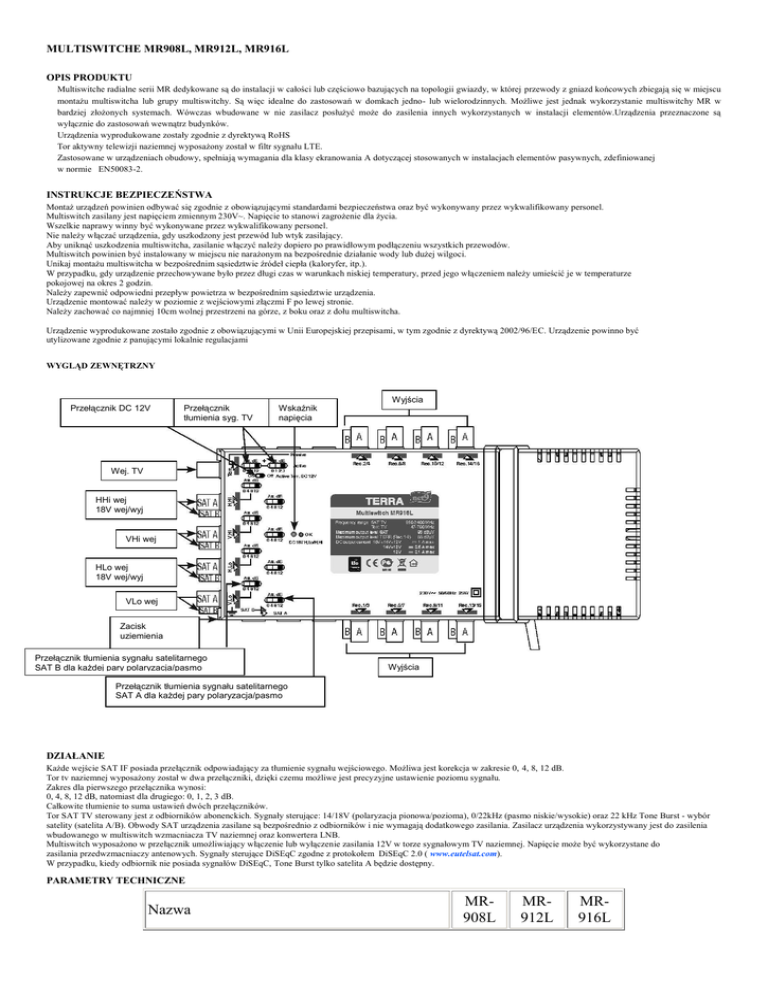 MULTISWITCHE MR908L, MR912L, MR916L OPIS PRODUKTU Multiswitche radialne serii MR dedykowane są do instalacji w całości lub częściowo bazujących na topologii gwiazdy, w której przewody z gniazd końcowych zbiegają się w miejscu montażu multiswitcha lub grupy multiswitchy. Są więc idealne do zastosowań w domkach jedno- lub wielorodzinnych. Możliwe jest jednak wykorzystanie multiswitchy MR w bardziej złożonych systemach. Wówczas wbudowane w nie zasilacz posłużyć może do zasilenia innych wykorzystanych w instalacji elementów.Urządzenia przeznaczone są wyłącznie do zastosowań wewnątrz budynków. Urządzenia wyprodukowane zostały zgodnie z dyrektywą RoHS Tor aktywny telewizji naziemnej wyposażony został w filtr sygnału LTE. Zastosowane w urządzeniach obudowy, spełniają wymagania dla klasy ekranowania A dotyczącej stosowanych w instalacjach elementów pasywnych, zdefiniowanej w normie EN50083-2. INSTRUKCJE BEZPIECZEŃSTWA Montaż urządzeń powinien odbywać się zgodnie z obowiązującymi standardami bezpieczeństwa oraz być wykonywany przez wykwalifikowany personel. Multiswitch zasilany jest napięciem zmiennym 230V~. Napięcie to stanowi zagrożenie dla życia. Wszelkie naprawy winny być wykonywane przez wykwalifikowany personel. Nie należy włączać urządzenia, gdy uszkodzony jest przewód lub wtyk zasilający. Aby uniknąć uszkodzenia multiswitcha, zasilanie włączyć należy dopiero po prawidłowym podłączeniu wszystkich przewodów. Multiswitch powinien być instalowany w miejscu nie narażonym na bezpośrednie działanie wody lub dużej wilgoci. Unikaj montażu multiswitcha w bezpośrednim sąsiedztwie źródeł ciepła (kaloryfer, itp.). W przypadku, gdy urządzenie przechowywane było przez długi czas w warunkach niskiej temperatury, przed jego włączeniem należy umieścić je w temperaturze pokojowej na okres 2 godzin. Należy zapewnić odpowiedni przepływ powietrza w bezpośrednim sąsiedztwie urządzenia. Urządzenie montować należy w poziomie z wejściowymi złączmi F po lewej stronie. Należy zachować co najmniej 10cm wolnej przestrzeni na górze, z boku oraz z dołu multiswitcha. Urządzenie wyprodukowane zostało zgodnie z obowiązującymi w Unii Europejskiej przepisami, w tym zgodnie z dyrektywą 2002/96/EC. Urządzenie powinno być utylizowane zgodnie z panującymi lokalnie regulacjami WYGLĄD ZEWNĘTRZNY Przełącznik DC 12V Przełącznik tłumienia syg. TV Wskaźnik napięcia DC Wyjścia Wej. TV HHi wej 18V wej/wyj VHi wej HLo wej 18V wej/wyj VLo wej Zacisk uziemienia Przełącznik tłumienia sygnału satelitarnego SAT B dla każdej pary polaryzacja/pasmo Wyjścia Przełącznik tłumienia sygnału satelitarnego SAT A dla każdej pary polaryzacja/pasmo DZIAŁANIE Każde wejście SAT IF posiada przełącznik odpowiadający za tłumienie sygnału wejściowego. Możliwa jest korekcja w zakresie 0, 4, 8, 12 dB. Tor tv naziemnej wyposażony został w dwa przełączniki, dzięki czemu możliwe jest precyzyjne ustawienie poziomu sygnału. Zakres dla pierwszego przełącznika wynosi: 0, 4, 8, 12 dB, natomiast dla drugiego: 0, 1, 2, 3 dB. Całkowite tłumienie to suma ustawień dwóch przełączników. Tor SAT TV sterowany jest z odbiorników abonenckich. Sygnały sterujące: 14/18V (polaryzacja pionowa/pozioma), 0/22kHz (pasmo niskie/wysokie) oraz 22 kHz Tone Burst - wybór satelity (satelita A/B). Obwody SAT urządzenia zasilane są bezpośrednio z odbiorników i nie wymagają dodatkowego zasilania. Zasilacz urządzenia wykorzystywany jest do zasilenia wbudowanego w multiswitch wzmacniacza TV naziemnej oraz konwertera LNB. Multiswitch wyposażono w przełącznik umożliwiający włączenie lub wyłączenie zasilania 12V w torze sygnałowym TV naziemnej. Napięcie może być wykorzystane do zasilania przedwzmacniaczy antenowych. Sygnały sterujące DiSEqC zgodne z protokołem DiSEqC 2.0 ( www.eutelsat.com). W przypadku, kiedy odbiornik nie posiada sygnałów DiSEqC, Tone Burst tylko satelita A będzie dostępny. PARAMETRY TECHNICZNE Nazwa MR908L MR912L MR916L Kod R70808 R70812 R70816 Ilość wyjść 8 Pasmo pracy [MHz] SAT Wzmocnienie (wbudowana prekorekcja ch-ki tłumienia Tor przewodu) aktywny [dB] DVB-T/ Radio Tłumienie [dB] 12 16 SAT 950 - 2400 DVB-T/Radio 47 - 790 Tor pasywny 5 - 862 3...8 wyjścia 1-8 wyjścia 9-12 1...4 - 0...2 wyjścia 13-16 -1...0 wyjścia 1-8 Tor pasywny wyjścia 9-16 28 - 30 Regulacja wzmocnienia w torze SAT [dB] 12, krok 4dB Regulacja wzmocnienia w torze TV naz.[dB] 15, krok 1dB Max. poziom sygnału SAT (IMD3=35dB)* [dBμV] Max. poziom sygnału DVBT (IMD3=60dB)* [dBμV] 93 wyjścia 1-8 wyjścia 9-12 wyjścia 13-16 85 - 83 - 83 Separacja wejść SAT [dB] > 30 Separacja wyjść [dB] > 30 H/Lo, H/Hi - 18V; V/Lo, V/Hi - 14V TV naziemna - 12V Zasilanie na wejściach RF Natężenie prądu na wejściach RF [A] +18V&+14V&+12V < 0,1 +14V&+12V < 0,5 +12V < 0,1 Pobór prądu z odbiornika [mA] < 60 Sygnały sterujące 14/18V, 0/22kHz, tone burst lub DiSEqC 2.0 Pobór mocy** 230VAC 50/60Hz 4W Zakres temperatur pracy [ºC] Wymiary [mm] Masa [kg] -20...+50 253x135x52 1,44