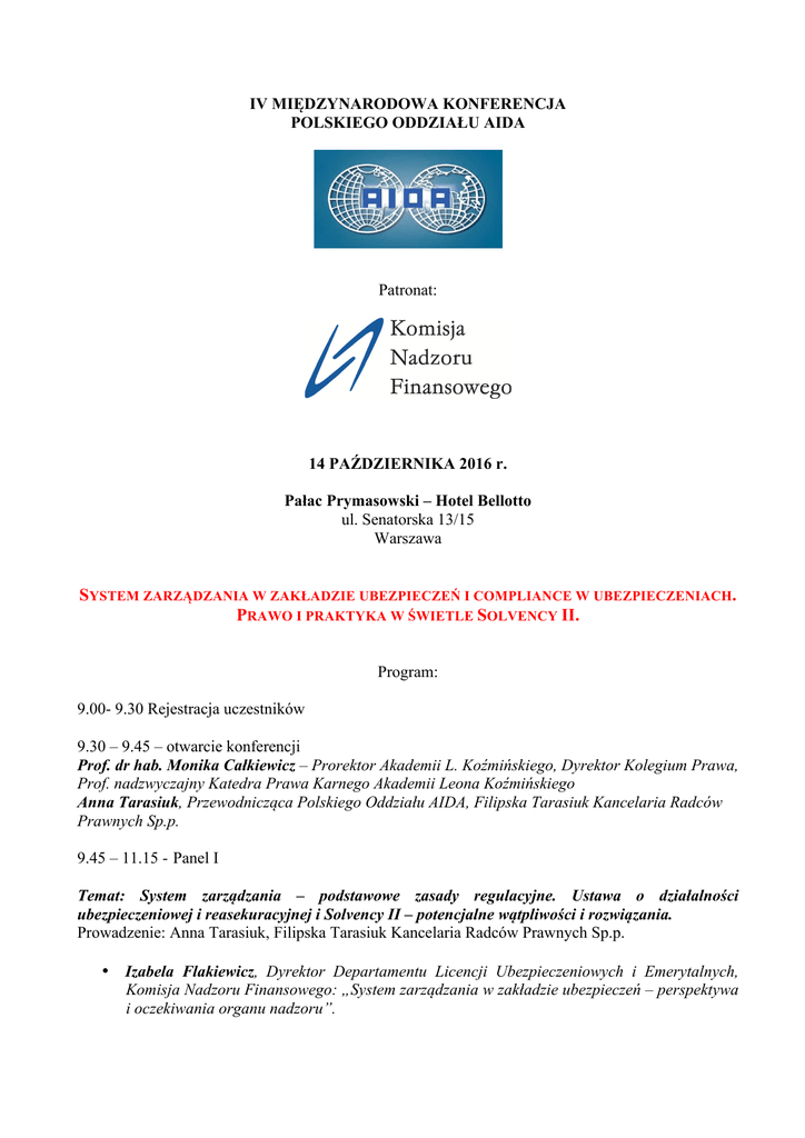 IV MIĘDZYNARODOWA KONFERENCJA POLSKIEGO ODDZIAŁU AIDA Patronat: 14 PAŹDZIERNIKA 2016 r. Pałac Prymasowski – Hotel Bellotto ul. Senatorska 13/15 Warszawa SYSTEM ZARZĄDZANIA W ZAKŁADZIE UBEZPIECZEŃ I COMPLIANCE W UBEZPIECZENIACH. PRAWO I PRAKTYKA W ŚWIETLE SOLVENCY II. Program: 9.00- 9.30 Rejestracja uczestników 9.30 – 9.45 – otwarcie konferencji Prof. dr hab. Monika Całkiewicz – Prorektor Akademii L. Koźmińskiego, Dyrektor Kolegium Prawa, Prof. nadzwyczajny Katedra Prawa Karnego Akademii Leona Koźmińskiego Anna Tarasiuk, Przewodnicząca Polskiego Oddziału AIDA, Filipska Tarasiuk Kancelaria Radców Prawnych Sp.p. 9.45 – 11.15 - Panel I Temat: System zarządzania – podstawowe zasady regulacyjne. Ustawa o działalności ubezpieczeniowej i reasekuracyjnej i Solvency II – potencjalne wątpliwości i rozwiązania. Prowadzenie: Anna Tarasiuk, Filipska Tarasiuk Kancelaria Radców Prawnych Sp.p. • Izabela Flakiewicz, Dyrektor Departamentu Licencji Ubezpieczeniowych i Emerytalnych, Komisja Nadzoru Finansowego: „System zarządzania w zakładzie ubezpieczeń – perspektywa i oczekiwania organu nadzoru”. • Dagmara Wieczorek-Bartczak, E&Y: „Problemy praktyczne i rozwiązania w zakresie systemu zarządzania w zakładzie ubezpieczeń”. 11.15 – 11.30 - Przerwa kawowa 11:30 – 13.00 - Panel II Temat: System zarządzania – podstawowe zasady regulacyjne. Praktyczne problemy i rozwiązania – perspektywa europejska. Prowadzenie: dr Katarzyna Malinowska, BMSP Boryczko Malinowska i Partnerzy Sp.p. • Prof. Pierpaolo Marano, Katolicki Uniwersytet w Mediolanie, członek AIDA Presidential Council, University of Connecticut Insurance Law Center: "Nadzór nad produktem i zarządzanie produktem". • Pierre-Alexis Brabis, Chief Finance & Risk Officer – Cardif Polska:[] • Alkistis Christofilou, Rokas International law firm, “Szczególne wymogi Solvency II – kwestie prawne i praktyczne – zakłady ubezpieczeń a inne podmioty sektora finansowego”. • dr Erika Berdi, członek zarządu Węgierskiego Oddziału AIDA, Cseri & Partners Law Office, Węgry: Dyrektywa Solvency II z a regulacje i praktyka węgierska”. 13:00 - 14:00 Lunch 14:00 – 15:30 Panel III Temat: Problemy polskiego rynku i rozwiązania praktyczne w zakresie systemu zarządzania. Prowadzenie: Aneta Ciechowicz – Jaworska, Kancelaria Radcy Prawnego Aneta CiechowiczJaworska • dr Jakub Pokrzywniak, WKB Wierciński, Kwieciński, Baehr Spółka Komandytowa: “Kompetencje organu nadzoru wobec kluczowego personelu zakładów ubezpieczeń w świetle nowych polskich regulacji i dyrektywy Solvency II”. • Monika Biełasiewicz – Fuszara, Kierownik Działu Zgodności z Przepisami, Open Life TU Życie S.A., „Compliance – wymogi strukturalne i możliwe rozwiązania”. • Aneta Ciechowicz – Jaworska, Kancelaria Radcy Prawnego Aneta Ciechowicz-Jaworska: “Zarządzanie produktem – problemy praktyczne”. • Bartosz Romanowski, Hogan Lovells: „Compliance a system zarządzania. Odpowiedzialność zarządu zakładu ubezpieczeń”. 15:30 – 16:00 Podsumowanie, zamknięcie konferencji Program może ulec zmianie. Organizatorzy oczekują na potwierdzenie od prelegentów.