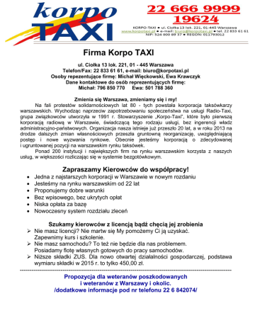 Firma Korpo TAXI ul. Ciołka 13 lok. 221, 01 - 445 Warszawa Telefon/Fax: 22 833 61 61, e-mail: [email protected] Osoby repezentujące firmę: Michał Więckowski, Ewa Krawczyk Dane kontaktowe do osób reprezentujących firmę: Michał: 796 850 770 Ewa: 501 788 360 Zmienia się Warszawa, zmieniamy się i my! Na fali protestów solidarnościowych lat 80 - tych powstała korporacja taksówkarzy warszawskich. Wychodząc naprzeciw zapotrzebowaniu społeczeństwa na usługi Radio-Taxi, grupa związkowców utworzyła w 1991 r. Stowarzyszenie „Korpo-Taxi”, które było pierwszą korporacją radiową w Warszawie, świadczącą tego rodzaju usługi, bez ingerencji władz administracyjno-państwowych. Organizacja nasza istnieje już przeszło 20 lat, a w roku 2013 na drodze dalszych zmian własnościowych przeszła gruntowną reorganizację, uwzględniającą postęp i nowe wyzwania rynkowe. Obecnie jesteśmy korporacją o zdecydowanej i ugruntowanej pozycji na warszawskim rynku taksówek. Ponad 200 instytucji i największych firm na rynku warszawskim korzysta z naszych usług, w większości rozliczając się w systemie bezgotówkowym. Zapraszamy Kierowców do współpracy! Jedna z najstarszych korporacji w Warszawie w nowym rozdaniu Jesteśmy na rynku warszawskim od 22 lat Proponujemy dobre warunki Bez wpisowego, bez ukrytych opłat Niska opłata za bazę Nowoczesny system rozdziału zleceń Szukamy kierowców z licencją bądź chęcią jej zrobienia Nie masz licencji? Nie martw się My pomożemy Ci ją uzyskać. Zapewnimy kurs i szkolenie. Nie masz samochodu? To też nie będzie dla nas problemem. Posiadamy flotę własnych gotowych do pracy samochodów. Niższe składki ZUS. Dla nowo otwartej działalności gospodarczej, podstawa wymiaru składki w 2015 r. to tylko 450,00 zł. ------------------------------------------------------------------------------------------------------------Propozycja dla weteranów poszkodowanych i weteranów z Warszawy i okolic. /dodatkowe informacje pod nr telefonu 22 6 842074/