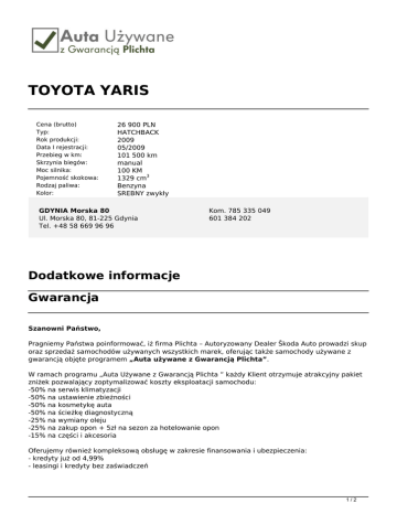 TOYOTA YARIS Cena (brutto) Typ: Rok produkcji: Data I rejestracji: Przebieg w km: Skrzynia biegów: Moc silnika: Pojemność skokowa: Rodzaj paliwa: Kolor: 26 900 PLN HATCHBACK 2009 05/2009 101 500 km manual 100 KM 1329 cm3 Benzyna SREBNY zwykły GDYNIA Morska 80 Ul. Morska 80, 81-225 Gdynia Tel. +48 58 669 96 96 Kom. 785 335 049 601 384 202 Dodatkowe informacje Gwarancja Szanowni Państwo, Pragniemy Państwa poinformować, iż firma Plichta – Autoryzowany Dealer Škoda Auto prowadzi skup oraz sprzedaż samochodów używanych wszystkich marek, oferując także samochody używane z gwarancją objęte programem „Auta używane z Gwarancją Plichta”. W ramach programu „Auta Używane z Gwarancją Plichta ” każdy Klient otrzymuje atrakcyjny pakiet zniżek pozwalający zoptymalizować koszty eksploatacji samochodu: -50% na serwis klimatyzacji -50% na ustawienie zbieżności -50% na kosmetykę auta -50% na ścieżkę diagnostyczną -25% na wymiany oleju -25% na zakup opon + 5zł na sezon za hotelowanie opon -15% na części i akcesoria Oferujemy również kompleksową obsługę w zakresie finansowania i ubezpieczenia: - kredyty już od 4,99% - leasingi i kredyty bez zaświadczeń 1/2 - uproszczone procedury – decyzja już od 30 min. - atrakcyjne pakiety AC/OC/NW/ASS wiodących firm ubezpieczeniowych Możliwość pozostawienia dotychczas użytkowanego auta w rozliczeniu – BEZPŁATNA WYCENA!!! Zapraszamy wszystkich Klientów na jazdę próbną wybranym autem. Numer oferty: F072 Informacja nie stanowi oferty w rozumieniu art. 66 KC. Podane dane mają charakter wyłącznie informacyjny. 2/2 Powered by TCPDF (www.tcpdf.org)