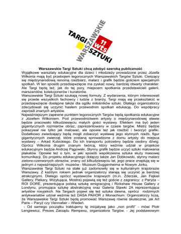 Warszawskie Targi Sztuki chcą zdobyć szeroką publiczność Wyjątkowe warsztaty edukacyjne dla dzieci i młodzieży prowadzone przez Józefa Wilkonia mają być przebojem tegorocznych Warszawskich Targów Sztuki. Cieszący się międzynarodową renomą rzeźbiarz, malarz i grafik będzie gościem specjalnym spotkań. W ten sposób przedsięwzięcie ma zyskać nowy, bardziej otwarty charakter. Ale Targi będą też, jak do tej pory, miejscem spotkania przedstawicieli galerii, marszandów, kolekcjonerów i kuratorów. Warszawskie Targi Sztuki szukają nowej formuły. Z wydarzenia, którym interesowali się przede wszystkich fachowcy i ludzie z branży, Targi mają się przekształcić w przedsięwzięcie dostępne także dla ogółu miłośników sztuki. Dlatego organizatorzy zdecydowali się uczynić hasłem przewodnim spotkań edukację. Do współpracy zaprosili znanych artystów. Najważniejszym zapewne punktem tegorocznych Targów będą spotkania edukacyjne z Józefem Wilkoniem. Pod przewodnictwem artysty o międzynarodowej sławie będzie pracowało kilkudziesięciu małych gości wystawy. Efektem ma być jeden gigantycznych rozmiarów obraz, zaprezentowany w czasie targów. Mistrz będzie pokazywał nie tylko jak malować, ale opowie też jak rzeźbić i tworzyć grafiki. Dodatkowo zwiedzający będą mogli zobaczyć wystawę jego słynnych rzeźb, figur gigantycznych zwierząt, które zostaną sprowadzone z domu artysty do miejsca wystawy – Arkad Kubickiego. Do ich transportu potrzebny będzie osobny dźwig. Oprócz Wilkonia drugim znanym twórcą, który weźmie udział w projekcie edukacyjnym będzie Andrzej Pągowski. Słynny grafik będzie uczyć sztuki malowania plakatów. Opowie też o tym, w jaki sposób współczesna sztuka służy masowej komunikacji. Do projektu edukacyjnego dołączy także Jan Dobkowski, słynny malarz zielono-czerwonych obrazów, znany od kilkudziesięciu lat, jego prace znajdują się w jednym z najważniejszych muzeów - Muzeum Guggenheima w Nowym Jorku. Warszawskie Targi Sztuki na stałe już zadomowiły się w kulturalnym krajobrazie Warszawy. Z każdym rokiem jednak organizatorzy starają się uczynić je bardziej atrakcyjnymi. Dlatego oprócz wystawców krajowych (m.in. Zderzak, Jan Fejkiel Gallery, Piekary, Wizytująca, Mostra) pojawią się też goście z zagranicy: z Paryża – ROI DORE, prezentująca polską sztukę emigracyjną i Rickshaw House Gallery z Londynu, promująca sztukę abstrakcyjną oraz Galeria Stawki 2A reprezentująca artystów rosyjskich. Na Targach pojawi się też sztuka dawna, oprócz rodzimych antykwariatów udział weźmie też DASA PAHOR z Monachium. Organizatorzy liczą, że Warszawskie Targi Sztuki będą promować Warszawę równie skutecznie, jak Art Paris – Paryż czy Viennafair – Wiedeń. - Od samego początku traktujemy tę inicjatywę jako „non profit” - mówi Piotr Lengiewicz, Prezes Zarządu Rempexu, organizatora Targów. - Jej podstawowym celem jest popularyzacja sztuk plastycznych jako niezmiernie istotnego elementu kultury, towarzyszy jej także istotny aspekt edukacyjny. Dzięki zaprezentowaniu w jednym miejscu ponad 50 galerii z Polski i Europy chcemy propagować dobrą sztukę w naszym społeczeństwie – stwierdza. - W związku z tym, że zgłosiło się w tym roku tyle dobrych galerii, będzie można kupić prace uznanych już artystów m.in. Jurrego (Jerzy Zieliński), Jerzego Nowosielskiego, Wojciecha Fangora, Stefana Gierowskiego, Tadeusza Dominika, Ryszarda Grzyba, Włodzimierza Pawlaka, Bronisława Krzysztofa, Jerzego Kałuckiego, Jerzego Panka, Jacka Sroki, Adama Smolany, Izabelli Gustowskiej, Michała Zaborowskiego, Leszka Jampolskiego, Michał Batory itd. oraz młodych, utalentowanych twórców, takich jak: Erwina Ziomkowska, Łukasz Stokłosa, Monika Chlebek, Dawid Czycz, Basia Bańda, Grupa Twożywo. Bardzo modną wśród kolekcjonerów na świecie fotografię będą reprezentować m.in.: Bogdan Konopka, Krzysztof Zarębski. Dużo interesujących obiektów przygotowały też antykwariaty, skupione na sztuce dawnej – dodaje z kolei Kama Zboralska, przewodnicząca Rady Programowej 11. Warszawskich Targów Sztuki. Co roku nasze Targi odwiedzają tysiące gości– stwierdza Lengiewicz. - Są wśród nich osoby zawodowo związane z rynkiem sztuki, jak również miłośnicy sztuki dla których samo obcowanie z malarstwem, rzeźbą czy też przedmiotami dobrego rzemiosła artystycznego jest dużą atrakcją. Targi to jedno z wielu działań jakie powinny być podejmowane w celu propagowania sztuk plastycznych wśród zalewającej nas tandetnej kultury. Wieloletnie zaniedbania należy pokonywać. Warto namawiać ludzi aby w wolnej chwili wstępowali do galerii, do muzeum i aby raz do roku odwiedzili Warszawskie Targi Sztuki – podsumowuje Piotr Lengiewicz, Prezes Zarządu Rempexu. Szczegóły na www.warszawskietargisztuki.pl Warszawskie Targi Sztuki w Arkadach Kubickiego Zamku Warszawskiego 11.10 ( piątek) - 15.30 -20.00 12.10 (sobota) - 11.00-19.00 13.10 ( niedziela) - 11.00 - 17.00