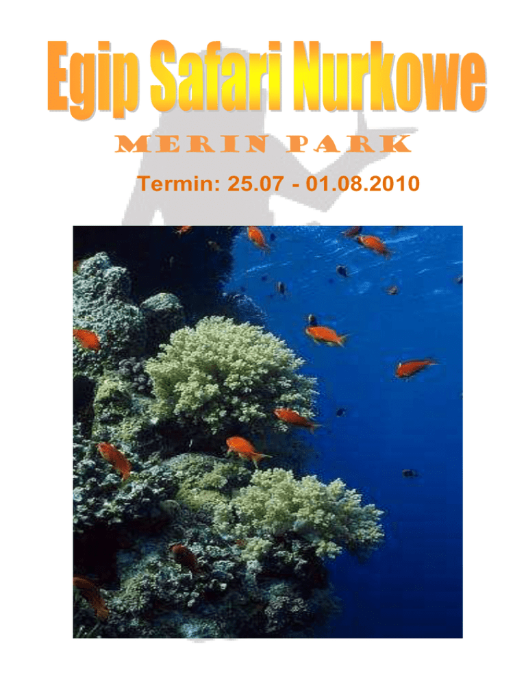 Merin Park Termin: 25.07 - 01.08.2010 Wyprawa Safari: Program: Dzień 1: Tobia Arbaa, Panorama, Salem Express Dzień 2: DuŜy Brat ( 2 nurkowania ), Mały Brat ( 2 nurkowania ) Dzień 3: Dedalus ( 4 nurkowania ) Dzień 4: Rocky ( 2 nurkowania ), Zabargad ( 2 nurkowania ) Dzień 5: Gott Atasharm, Elphistone Dzień 6: Abu Kafan, Salem Express, Middle Reef Minimalne wymagania: PADI OWD lub równowaŜne stopnie innej organizacji nurkowej, zalogowane minimum 50 nurkowań – jeśli nie spełniasz wymagań, to do czasu wyjazdu zdąŜymy to nadrobić. Bezpieczeństwo : • Wszyscy nurkowie otrzymują standardowy komplet dokumentów w języku polskim do zapoznania się oraz wypełnienia; • KaŜdorazowo wykonujemy - check dive • Polska wykwalifikowana obsługa w wodzie jak i na łodzi • Baza posiada licencję nurkową, ma równieŜ podpisaną umowę z ubezpieczalnią DECO • Podane trasy mogą ulec zmianie ze względu na warunki atmosferyczne Opis Nurkowisk: Tobia Arba Nazywana takŜe 7 pillars. Jest skupiskiem koralowych blokow, wynurzających się z piaszczystego dna, ukazjąc fascynujący krajobraz miękkich korali, glassfish i gorgonii. MoŜna tu równieŜ spotkać rozdymki (pufferfish), płaszczki i ośmiornice. Panorama Reef Jedna z głównych atrakcji tego regionu. DuŜa formacja korali ze ścianami opadającymi do ok. 200m. Liczne groty i nawisy, gorgonie i miękkie korale. Karanksy (jackfish), barakudy i rekiny (reef sharks) często odwiedzają to miejsce. Middle Reef Północna ściana rafy opada do 30m, po czym spada pionowo na znacznie większą głębokość. Ogrody twardych korali na wschodnim i zachodnim rogu, zawierają m.in. acroporas oraz brain corals i salat corals. Przyjemne nurkowanie na południowej stronie przez płytki labirynt jaskiń, tuneli i korytarzy. Występują tam m.in. strzępiele (groupers), puffers i ryby luszczowate (sweetlips). Abu Gafan Prawdopodobnie najlepsze miejsce nurkowe w okolicach Safagi, 300-metrowa wąska bariera o cechach ‘plateau’ na północnym i południowym końcu. Znakomita ściana do nurkowania z miękkimi i czarnymi koralami oraz wielkimi gorgoniami. Częstymi bywalcami są karanksy (jackfish), barakudy, rekiny rafowe i czasami rekin młot. Wrak Salem Express Prom przewoŜący pielgrzymów wracających z Mekki, zatopiony w 1991 po uderzeniu w rafę nocą. 300 ofiar jednej z największych tragedii naszych czasów. Wrak jest bardzo słabo zarośnięty i wiele ryb zajęło go jako swoją rezydencję. Wielu nurków unika tego miejsca, zwaŜając na jego posępny charakter. Rocky – Zabarghad Te połoŜone 50 km od brzegu wyspy róŜnią się diametralnie zarówno pod względem wielkości jak i charakteru prowadzonych przy nich nurkowań. Rocky oferuje ekscytujące, adrenalinowe nurkowania w prądach wzdłuŜ urwistych ścian pokrytych miękkimi koralami i gorgoniami, podczas których często towarzyszą nam szare rekiny rafowe. PołoŜona niespełna dwa kilometry dalej, potęŜna, wyniesiona wysoko nad powierzchnię morza, wyspa Zabarghad niesie uspokojenie pięknymi błękitnymi lagunami i fantastycznymi formacjami korali, tworzącymi malownicze wieŜe i tunele. Na szczytach koralowych turni, pośród Ŝółtych kolonii Milepory, kłębią się pomarańczowe anthiasy. Koralowe załomy i rozpadliny zamieszkują wargacze, ryby papuzie i mureny. DuŜy i Mały Brat Wyspy Brother Islands (El Akhawein) to pinakle dwóch podwodnych gór wznoszących się w górę z głębokości 300m, w odległości około 100 kilometrów od brzegu. Większa z wysp - Big Brother, łatwo rozpoznawalna z powodu wzniesionej tam latarni morskiej, ma wymiary około 100 na 400 metrów. Mniejsza wyspa - Little Brother połoŜona jest 800 metrów na wschód od DuŜego Brata. NaleŜące do parku morskiego wyspy oferują zapierające dech w piersiach nurkowania przy ścianach oraz niezwykle barwną scenerię miękkich korali i gorgonii bujnie porastających wyspy. Wokół wysp moŜna spotkać mnóstwo gatunków mniejszych i większych ryb: tuńczyki, barakudy, ławice lucjanów i ostroboków, jak równieŜ rekiny-młoty, Ŝarłacze jedwabiste (silky shark) i białopłetwe, z rzadka zdarzają się takŜe spotkania z kosogonem (thresher shark) albo z mantą. śarłacze szare często moŜna wypatrzyć z północnego i południowego plateau Małego Brata. Dedalus Daedalus Reef, rafa będąca równieŜ częścią parku morskiego, to ogromna owalna rafa z latarnią morską. Jest to najbardziej oddalona od brzegu rafa w egipskiej części Morza Czerwonego. Jej głęboko opadające ściany to jedne z najbardziej spektakularnych miejsc nurkowych. Daedalus charakteryzuje się przypominającymi górskie krajobrazy, dziewiczymi formacjami twardych korali. W rejonie tym jest takŜe duŜa szansa na spotkanie rekinów-młotów oraz Ŝarłaczy szarych i białopłetwych. Elphinstone Rafa Elphinstone, o stromych, głęboko opadających ścianach pokrytych miękkimi koralami, oferuje przez większą część roku spotkania z Ŝarłaczami szarymi krąŜącymi nad plateau, a nawet z Ŝarłaczami białopłetwymi. Prezentacja Łodzi: Specyfikacja techniczna: • Rok wykonania: 2003, całkowicie odnowiony i modernizowany zimą 2008/2009, dostępny od marca 2009; • Długość: 38 m, Szerokość: 9.5 m • Salon: 2 oddzielone od siebie strefy: jadalnia I salon/bar, DVD, tv, cd • Silniki: 2 silniki po 1200 KM ; 2 generatory 130 Kwh • Kompresory: 2 kompresory powietrzne ; 1 kompresor NITROXowy • Generatory: 1 x 85k / 1 x 30kw • Nawigacja: Radar, sonar, GPS, DSC, VHF • Woda: 24 tony • Bezpieczeństwo: tlen, kamizelki ratunkowe, zestaw pierwszej pomocy, tratwy ratunkowe • Zodiak: 2 Zodiaki 40 KM • 2 lodzie ratunkowe dla 50 osób • Nitrox: free • Załoga: 13 osób (przewodnicy nurkowi 1 kapitan 2 kucharzy 2 kelnerów 1 mechanik 7 marynarzy) Zakwaterowanie: • Ilość osób: 14 dwuosobowych klimatyzowanych kabin (2 koje w kabinie z łazienką) ręczniki, płaszcze kąpielowe