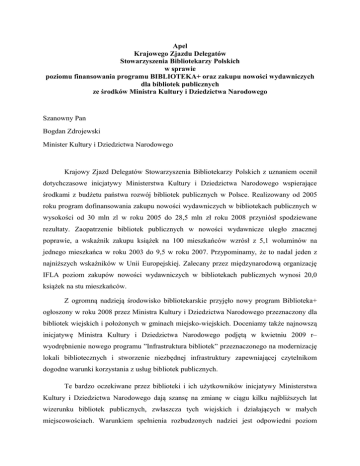 Apel Krajowego Zjazdu Delegatów Stowarzyszenia Bibliotekarzy Polskich w sprawie poziomu finansowania programu BIBLIOTEKA+ oraz zakupu nowości wydawniczych dla bibliotek publicznych ze środków Ministra Kultury i Dziedzictwa Narodowego Szanowny Pan Bogdan Zdrojewski Minister Kultury i Dziedzictwa Narodowego Krajowy Zjazd Delegatów Stowarzyszenia Bibliotekarzy Polskich z uznaniem ocenił dotychczasowe inicjatywy Ministerstwa Kultury i Dziedzictwa Narodowego wspierające środkami z budżetu państwa rozwój bibliotek publicznych w Polsce. Realizowany od 2005 roku program dofinansowania zakupu nowości wydawniczych w bibliotekach publicznych w wysokości od 30 mln zl w roku 2005 do 28,5 mln zł roku 2008 przyniósł spodziewane rezultaty. Zaopatrzenie bibliotek publicznych w nowości wydawnicze uległo znacznej poprawie, a wskaźnik zakupu książek na 100 mieszkańców wzrósł z 5,1 woluminów na jednego mieszkańca w roku 2003 do 9,5 w roku 2007. Przypominamy, że to nadal jeden z najniższych wskaźników w Unii Europejskiej. Zalecany przez międzynarodową organizację IFLA poziom zakupów nowości wydawniczych w bibliotekach publicznych wynosi 20,0 książek na stu mieszkańców. Z ogromną nadzieją środowisko bibliotekarskie przyjęło nowy program Biblioteka+ ogłoszony w roku 2008 przez Ministra Kultury i Dziedzictwa Narodowego przeznaczony dla bibliotek wiejskich i położonych w gminach miejsko-wiejskich. Doceniamy także najnowszą inicjatywę Ministra Kultury i Dziedzictwa Narodowego podjętą w kwietniu 2009 r– wyodrębnienie nowego programu ”Infrastruktura bibliotek” przeznaczonego na modernizację lokali bibliotecznych i stworzenie niezbędnej infrastruktury zapewniającej czytelnikom dogodne warunki korzystania z usług bibliotek publicznych. Te bardzo oczekiwane przez biblioteki i ich użytkowników inicjatywy Ministerstwa Kultury i Dziedzictwa Narodowego dają szansę na zmianę w ciągu kilku najbliższych lat wizerunku bibliotek publicznych, zwłaszcza tych wiejskich i działających w małych miejscowościach. Warunkiem spełnienia rozbudzonych nadziei jest odpowiedni poziom finansowania zapowiadanych działań. Stowarzyszenie Bibliotekarzy Polskich z niepokojem przyjęło decyzję Pana Ministra zmniejszającą dotację na zakup nowości wydawniczych dla bibliotek publicznych w roku 2009 do 10 mln zł, tj. aż o 64,91% w stosunku do dotychczasowej wysokości. Znane nam są przyczyny redukcji wydatków we wszystkich resortach. Zwracamy jednak uwagę, że zmniejszenie dofinansowania ze środków MKiDN tego programu będzie miało długofalowe negatywne skutki dla rozwoju bibliotek publicznych i stanu czytelnictwa w Polsce. Uczestnicy Krajowego Zjazdu Delegatów Stowarzyszenia Bibliotekarzy Polskich apelują do Pana Ministra o kontynuowanie wszystkich programów zapewniając im odpowiednio wysokie finansowanie. Inwestowanie w biblioteki publiczne jest najbardziej efektywnym sposobem wspierania rozwoju edukacji, kultury i nauki w społeczeństwie wiedzy, czego dowodzą przykłady w innych krajach europejskich, a także najnowsza wiedeńska deklaracja organizacji EBLIDA i NAPLE zwracająca uwagę Komisji Europejskiej na wzrastające znaczenie bibliotek publicznych w społeczeństwie wiedzy. Krajowy Zjazd Delegatów Stowarzyszenia Bibliotekarzy Polskich