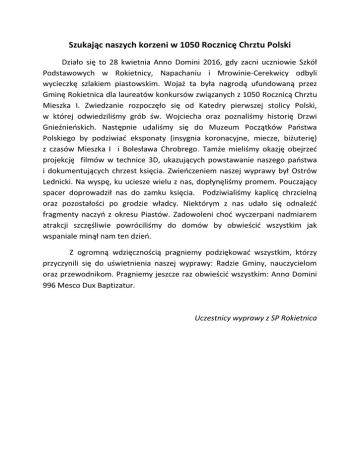 Szukając naszych korzeni w 1050 Rocznicę Chrztu Polski Działo się to 28 kwietnia Anno Domini 2016, gdy zacni uczniowie Szkół Podstawowych w Rokietnicy, Napachaniu i Mrowinie-Cerekwicy odbyli wycieczkę szlakiem piastowskim. Wojaż ta była nagrodą ufundowaną przez Gminę Rokietnica dla laureatów konkursów związanych z 1050 Rocznicą Chrztu Mieszka I. Zwiedzanie rozpoczęło się od Katedry pierwszej stolicy Polski, w której odwiedziliśmy grób św. Wojciecha oraz poznaliśmy historię Drzwi Gnieźnieńskich. Następnie udaliśmy się do Muzeum Początków Państwa Polskiego by podziwiać eksponaty (insygnia koronacyjne, miecze, biżuterię) z czasów Mieszka I i Bolesława Chrobrego. Tamże mieliśmy okazję obejrzeć projekcję filmów w technice 3D, ukazujących powstawanie naszego państwa i dokumentujących chrzest księcia. Zwieńczeniem naszej wyprawy był Ostrów Lednicki. Na wyspę, ku uciesze wielu z nas, dopłynęliśmy promem. Pouczający spacer doprowadził nas do zamku księcia. Podziwialiśmy kaplicę chrzcielną oraz pozostałości po grodzie władcy. Niektórym z nas udało się odnaleźć fragmenty naczyń z okresu Piastów. Zadowoleni choć wyczerpani nadmiarem atrakcji szczęśliwie powróciliśmy do domów by obwieścić wszystkim jak wspaniale minął nam ten dzień. Z ogromną wdzięcznością pragniemy podziękować wszystkim, którzy przyczynili się do uświetnienia naszej wyprawy: Radzie Gminy, nauczycielom oraz przewodnikom. Pragniemy jeszcze raz obwieścić wszystkim: Anno Domini 996 Mesco Dux Baptizatur. Uczestnicy wyprawy z SP Rokietnica