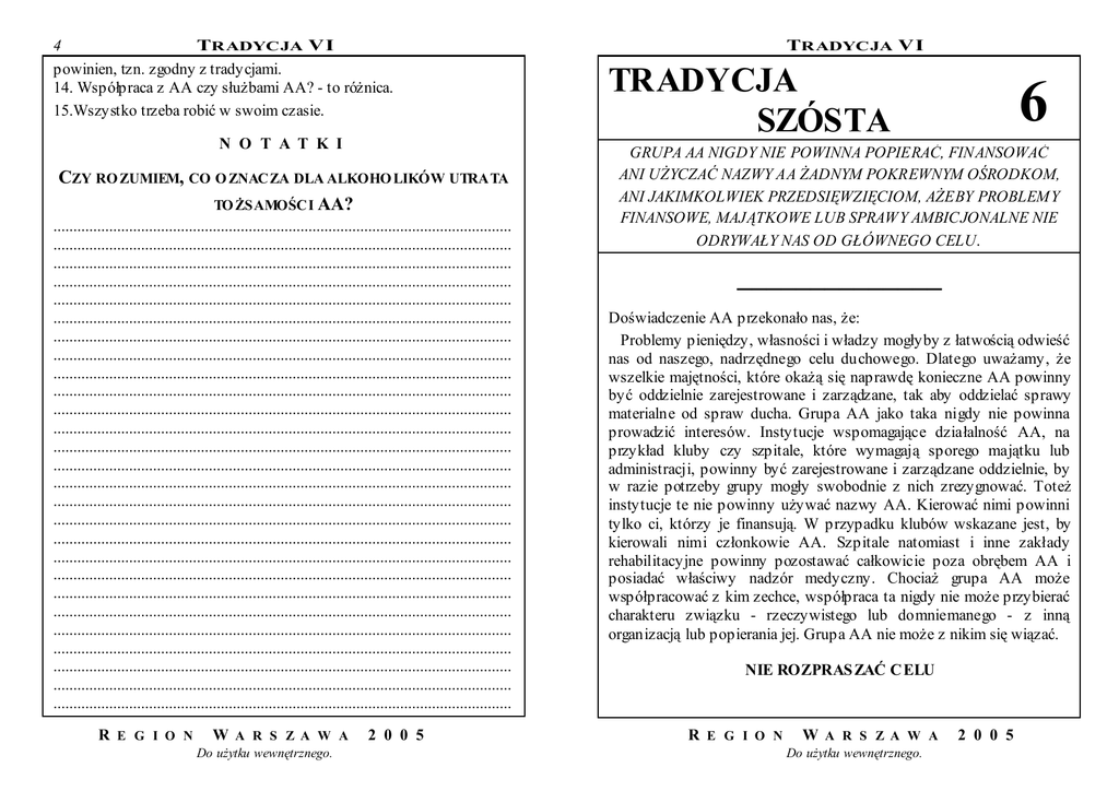 4 TRADYCJA VI powinien, tzn. zgodny z tradycjami. 14. Współpraca z AA czy słuŜbami AA? - to róŜnica. 15.Wszystko trzeba robić w swoim czasie. N O T A T K I CZY RO ZUMIEM, CO O ZNACZA DLA ALKOHO LIKÓW UTRATA TO śSAMOŚCI AA? ................................................................................................................... ................................................................................................................... ................................................................................................................... ................................................................................................................... ................................................................................................................... ................................................................................................................... ................................................................................................................... ................................................................................................................... ................................................................................................................... ................................................................................................................... ................................................................................................................... ................................................................................................................... ................................................................................................................... ................................................................................................................... ................................................................................................................... ................................................................................................................... ................................................................................................................... ................................................................................................................... ................................................................................................................... ................................................................................................................... ................................................................................................................... ................................................................................................................... ................................................................................................................... ................................................................................................................... ................................................................................................................... ................................................................................................................... ................................................................................................................... ................................................................................................................... R E G I O N W A R S ZA W A 2 0 0 5 Do uŜytku wewnętrznego. TRADYCJA VI TRADYCJA SZÓSTA 6 GRUPA AA NIGDY NIE POWINNA POPIERAĆ, FINANSOWAĆ ANI UśYCZAĆ NAZWY AA śADNYM POKREWNYM OŚRODKOM, ANI JAKIMKOLWIEK PRZEDSIĘWZIĘCIOM, AśEBY PROBLEMY FINANSOWE, MAJĄTKOWE LUB SPRAWY AMBICJONALNE NIE ODRYWAŁY NAS OD GŁÓWNEGO CELU. ______________ Doświadczenie AA przekonało nas, Ŝe: Problemy pieniędzy, własności i władzy mogłyby z łatwością odwieść nas od naszego, nadrzędnego celu duchowego. Dlatego uwaŜamy, Ŝe wszelkie majętności, które okaŜą się naprawdę konieczne AA powinny być oddzielnie zarejestrowane i zarządzane, tak aby oddzielać sprawy materialne od spraw ducha. Grupa AA jako taka nigdy nie powinna prowadzić interesów. Instytucje wspomagające działalność AA, na przykład kluby czy szpitale, które wymagają sporego majątku lub administracji, powinny być zarejestrowane i zarządzane oddzielnie, by w razie potrzeby grupy mogły swobodnie z nich zrezygnować. ToteŜ instytucje te nie powinny uŜywać nazwy AA. Kierować nimi powinni tylko ci, którzy je finansują. W przypadku klubów wskazane jest, by kierowali nimi członkowie AA. Szpitale natomiast i inne zakłady rehabilitacyjne powinny pozostawać całkowicie poza obrębem AA i posiadać właściwy nadzór medyczny. ChociaŜ grupa AA moŜe współpracować z kim zechce, współpraca ta nigdy nie moŜe przybierać charakteru związku - rzeczywistego lub domniemanego - z inną organizacją lub popierania jej. Grupa AA nie moŜe z nikim się wiązać. NIE ROZPRAS ZAĆ C ELU R E G I O N W A R S ZA W A Do uŜytku wewnętrznego. 2 0 0 5 2 TRADYCJA VI KILKA MYŚ LI Z N AS ZEJ LITERATURY ______________ * Tragedią naszego Ŝycia jest to, jak głęboko musimy cierpieć, nim nauczymy się prostych prawd, według których naleŜy Ŝyć. AA wkraczają w dojrzałość str. 331 * Uznaliśmy za konieczne, by nawet wewnątrz Wspólnoty AA przestać firmować nazwą AA kluby i schroniska dla alkoholików.12 / 12 str. 157 * Te doświadczenia zaszczepiły nam głębokie przekonanie, Ŝe w Ŝadnym razie nie moŜemy popierać Ŝadnych przedsięwzięć związanych z alkoholizmem, nawet gdyby były one najbardziej chwalebne. M y, Anonimowi Alkoholicy, nie moŜemy być panaceum na wszystkie problemy wszystkich ludzi i nie powinniśmy nawet tego próbować. 12 / 12 str. 157 * Przekonaliśmy się, jak nigdy przedtem, Ŝe nie moŜemy pozwolić, by uŜywano imienia AA do jakichkolwiek innych celów niŜ nasz w