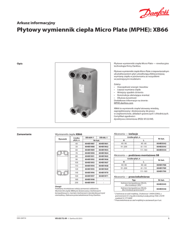 Arkusz informacyjny Płytowy wymiennik ciepła Micro Plate (MPHE): XB66 Opis Płytowe wymienniki ciepła Micro Plate — rewolucyjna technologia firmy Danfoss. Płytowe wymienniki ciepła Micro Plate z niepowtarzalnym ukształtowaniem płyt umożliwiają efektywniejszą wymianę ciepła w porównaniu ze wszystkimi wcześniejszymi modelami. Zalety: • Oszczędność energii i kosztów • Lepsza wymiana ciepła • Mniejszy spadek ciśnienia • Konstrukcja ułatwiająca montaż • Dłuższa żywotność Dodatkowe informacje na stronie: MPHE.danfoss.com XB66 to wymiennik ciepła lutowany miedzią, zaprojektowany i dostosowany do pracy w ciepłownictwie, układach grzewczych i chłodniczych. Certyfikat zgodności: dyrektywa ciśnieniowa (PED) 97/23/WE. Zamawianie Akcesoria — izolacje Wymiennik ciepła XB66 Rysunek Liczba płyt, n XB 66H-1 H Nr kat. L Nr kat. 40 004B1987 004B1961 40–90 40–60 004B3542 50 004B1988 004B1962 91–200 61–110 004B3543 / 111–160 004B3544 60 004B1989 004B1963 70 004B1990 004B1964 80 004B1991 004B1965 90 004B1992 004B1966 Akcesoria — podstawa montażowa SB Liczba płyt, n H L Nr kat. 100 004B1993 004B1967 110 004B1994 004B1968 40–90 40–60 91–200 61–110 004B1789 / 111–160 004B1790 120 004B1995 004B1969 140 004B1996 004B1970 160 004B1997 004B1971 180 004B1998 - 200 004B1999 - Uwagi: Podstawy montażowe należy zamawiać oddzielnie. Wymiennik ciepła XB66 jest dostarczany z kołnierzami kompaktowymi, montaż z kołnierzami standardowymi jest niemożliwy. Zalecane przeciwkołnierze firmy Danfoss. DEN-SMT/SI Liczba płyt, n XB 66L-1 VD.GS.T2.49 © Danfoss 05/2015 004B1788 Akcesoria — przeciwkołnierze Typ Nr kat. Kołnierz kompaktowy DN 65, dla instalacji CWU 1) 004B3545 Kołnierz kompaktowy DN 65, dla instalacji grzewczych 2) 004B3546 2 kołnierze ze stali miękkiej, 2 kołnierze 1.4404 (CWU), z pierścieniami O-ring dla instalacji wody pitnej: FDA: 21CFR rozdział I § 177.2600 2) Przeciwkołnierze ze stali miękkiej w zestawach po 4 szt. 1) 1 Arkusz informacyjny Płytowy wymiennik ciepła Micro Plate (MPHE) XB66 Dane techniczne Wymiennik ciepła XB66 Typ XB66H Maks. ciśnienie robocze PN Temperatura min./maks. o XB66L 25 C 16 -10 / 180 SC: Woda obiegowa/wodny roztwór glikolu do 50% IC: wodny roztwór glikolu etylenowego, propylenowego, wodne roztwory etanolu i inne odpowiednie media wykorzystywane do wymiany ciepła. (Należy skontaktować się z przedstawicielem firmy Danfoss). Czynnik Pojemność/kanał l Króćce 0,219 0,458 Kołnierz kompaktowy DN65 EN 1.4404 PN25 Masa kg 15 + 0,442 × n 15 + 0,522 × n Materiały Materiał płyty Stal nierdzewna, gatunek EN 1.4404 (316L) Lutowanie twarde Miedź Izolacja Typ Płaszcz poliuretanowy z pokrywą polistyrenową Grubość ścianki Przewodność cieplna λ mm 20–33 W/mK 0,029 Stała Temp. maks. Krótkotrwała (szczytowa) Polistyren, jasnoszary RAL 7040 2 VD.GS.T2.49 © Danfoss 05/2015 130 °C mm 150 0,8–3,0 DH-SMT/SI Arkusz informacyjny Płytowy wymiennik ciepła Micro Plate (MPHE) XB66 Wymiary 6-M12*20 Śruba 180 50 25 25 706 583,2 2 50 80 A (mm) 25 50 H: 12 + 1,45 × n L: 12 + 2,8 × n A 50 296 50 30 217 Podstawy montażowe 107 300 Nr kat. 17 16 61 A = 004B1788 B = 004B1789 C = 004B1790 61 A = 110 B = 199 C = 311 123 61 Kołnierze (mm) n d Rowek uszczelki d k DN L1 k n d d1 d2 b 65 24 106 8 79 70,3 13 12 Na kołnierzach wymienników ciepła znajdują się bruzdy dla pierścieni O-ring. Ød 1 2 Z wymiennikiem ciepła dostarczane są 4 pierścienie O-ring (do zastosowań grzewczych). b L1 2 pierścienie O-ring, zatwierdzone dla instalacji wody pitnej, są dostarczane w zestawie przeciwkołnierzy (bez bruzd). Muszą być montowane po stronie wody pitnej w celu wymiany istniejących pierścieni O-ring. Śruby i nakrętki nie są dostarczane. Zalecany typ: śruba z łbem sześciokątnym M12, DIN 933, jakość 8.8, ocynkowana, długość min. 35 mm. Izolacja (mm) Nr kat. DH-SMT/SI Liczba płyt, n H L 004B3542 40–90 40–60 004B3543 91–200 61–110 004B3544 / 111–160 VD.GS.T2.49 © Danfoss 05/2015 Wewnętrzny/zewnętrzny* Szerokość Wysokość Głębokość 188/270* 328/396* 823/900* 328/407* 563/634* 3 Arkusz informacyjny Płytowy wymiennik ciepła Micro Plate (MPHE): XB66 4 VD.GS.T2.49 Produced by Danfoss A/S © 05/2015