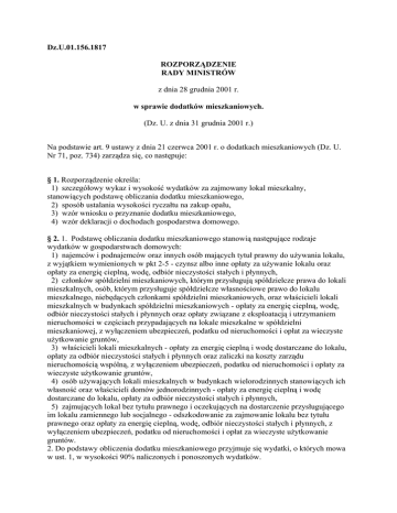 Dz.U.01.156.1817 ROZPORZĄDZENIE RADY MINISTRÓW z dnia 28 grudnia 2001 r. w sprawie dodatków mieszkaniowych. (Dz. U. z dnia 31 grudnia 2001 r.) Na podstawie art. 9 ustawy z dnia 21 czerwca 2001 r. o dodatkach mieszkaniowych (Dz. U. Nr 71, poz. 734) zarządza się, co następuje: § 1. Rozporządzenie określa: 1) szczegółowy wykaz i wysokość wydatków za zajmowany lokal mieszkalny, stanowiących podstawę obliczania dodatku mieszkaniowego, 2) sposób ustalania wysokości ryczałtu na zakup opału, 3) wzór wniosku o przyznanie dodatku mieszkaniowego, 4) wzór deklaracji o dochodach gospodarstwa domowego. § 2. 1. Podstawę obliczania dodatku mieszkaniowego stanowią następujące rodzaje wydatków w gospodarstwach domowych: 1) najemców i podnajemców oraz innych osób mających tytuł prawny do używania lokalu, z wyjątkiem wymienionych w pkt 2-5 - czynsz albo inne opłaty za używanie lokalu oraz opłaty za energię cieplną, wodę, odbiór nieczystości stałych i płynnych, 2) członków spółdzielni mieszkaniowych, którym przysługują spółdzielcze prawa do lokali mieszkalnych, osób, którym przysługuje spółdzielcze własnościowe prawo do lokalu mieszkalnego, niebędących członkami spółdzielni mieszkaniowych, oraz właścicieli lokali mieszkalnych w budynkach spółdzielni mieszkaniowych - opłaty za energię cieplną, wodę, odbiór nieczystości stałych i płynnych oraz opłaty związane z eksploatacją i utrzymaniem nieruchomości w częściach przypadających na lokale mieszkalne w spółdzielni mieszkaniowej, z wyłączeniem ubezpieczeń, podatku od nieruchomości i opłat za wieczyste użytkowanie gruntów, 3) właścicieli lokali mieszkalnych - opłaty za energię cieplną i wodę dostarczane do lokalu, opłaty za odbiór nieczystości stałych i płynnych oraz zaliczki na koszty zarządu nieruchomością wspólną, z wyłączeniem ubezpieczeń, podatku od nieruchomości i opłaty za wieczyste użytkowanie gruntów, 4) osób używających lokali mieszkalnych w budynkach wielorodzinnych stanowiących ich własność oraz właścicieli domów jednorodzinnych - opłaty za energię cieplną i wodę dostarczane do lokalu, opłaty za odbiór nieczystości stałych i płynnych, 5) zajmujących lokal bez tytułu prawnego i oczekujących na dostarczenie przysługującego im lokalu zamiennego lub socjalnego - odszkodowanie za zajmowanie lokalu bez tytułu prawnego oraz opłaty za energię cieplną, wodę, odbiór nieczystości stałych i płynnych, z wyłączeniem ubezpieczeń, podatku od nieruchomości i opłat za wieczyste użytkowanie gruntów. 2. Do podstawy obliczenia dodatku mieszkaniowego przyjmuje się wydatki, o których mowa w ust. 1, w wysokości 90% naliczonych i ponoszonych wydatków. 3. Wydatki naliczone i ponoszone za okres dłuższy niż jeden miesiąc przelicza się na okresy miesięczne. 4. Jeżeli wnioskodawca zajmuje część lokalu mieszkalnego lub domu jednorodzinnego, przy ustalaniu wydatków na mieszkanie uwzględnia się jedynie wydatki przypadające na tę część lokalu lub domu. § 3. 1. Jeżeli lokal mieszkalny nie jest wyposażony w instalację doprowadzającą energię cieplną do celów ogrzewania, za wydatek, stanowiący podstawę obliczania ryczałtu na zakup opału, uznaje się równowartość 5 kilowatogodzin energii elektrycznej według rachunku za ostatni okres rozliczeniowy, z wyłączeniem opłaty abonamentowej oraz stałych opłat miesięcznych, na 1 m2 normatywnej powierzchni użytkowej, o której mowa w art. 5, z uwzględnieniem art. 6 ust. 9 ustawy z dnia 21 czerwca 2001 r. o dodatkach mieszkaniowych. 2. Jeżeli lokal mieszkalny nie jest wyposażony w instalację ciepłej wody, za wydatek, stanowiący podstawę obliczania ryczałtu na zakup opału, uznaje się równowartość 20 kilowatogodzin energii elektrycznej według rachunku za ostatni okres rozliczeniowy, z wyłączeniem opłaty abonamentowej oraz stałych opłat miesięcznych, na każdego członka gospodarstwa. 3. Jeżeli lokal mieszkalny nie jest wyposażony w instalację gazu przewodowego, za wydatek, stanowiący podstawę obliczania ryczałtu na zakup opału, uznaje się równowartość 10 kilowatogodzin energii elektrycznej w gospodarstwie jednoosobowym według rachunku za ostatni okres rozliczeniowy, z wyłączeniem opłaty abonamentowej i stałych opłat miesięcznych, oraz równowartość 2 kilowatogodzin na każdą dodatkową osobę. § 4. 1. W celu ustalenia wysokości ryczałtu na zakup opału, wydatki wnioskodawcy, o których mowa w § 2 ust. 1, sumuje się z wydatkami, o których mowa w § 3, a następnie oblicza się wskaźnik procentowy odpowiadający udziałowi wydatków, o których mowa w § 3, w łącznej kwocie wydatków. 2. Kwota ryczałtu na zakup opału będąca częścią dodatku mieszkaniowego, która jest wypłacana do rąk wnioskodawcy, stanowi iloczyn obliczonego dodatku mieszkaniowego i wskaźnika, o którym mowa w ust. 1. § 5. 1. Osoba ubiegająca się o przyznanie dodatku mieszkaniowego powinna złożyć w urzędzie właściwej gminy: 1) wniosek o przyznanie dodatku mieszkaniowego, według wzoru stanowiącego załącznik nr 1 do rozporządzenia, 2) deklarację o wysokości dochodów gospodarstwa domowego, według wzoru stanowiącego załącznik nr 2 do rozporządzenia. 2. Wnioskodawca będący właścicielem domu jednorodzinnego powinien złożyć ponadto zaświadczenie organu właściwego w sprawie wydania pozwolenia na budowę, potwierdzające powierzchnię użytkową, w tym łączną powierzchnię pokoi i kuchni, oraz wyposażenie techniczne domu, a także przedstawić rachunki dotyczące wydatków, o których mowa w § 2 ust. 1 pkt 4. § 6. Rozporządzenie wchodzi w życie z dniem 1 stycznia 2002 r.