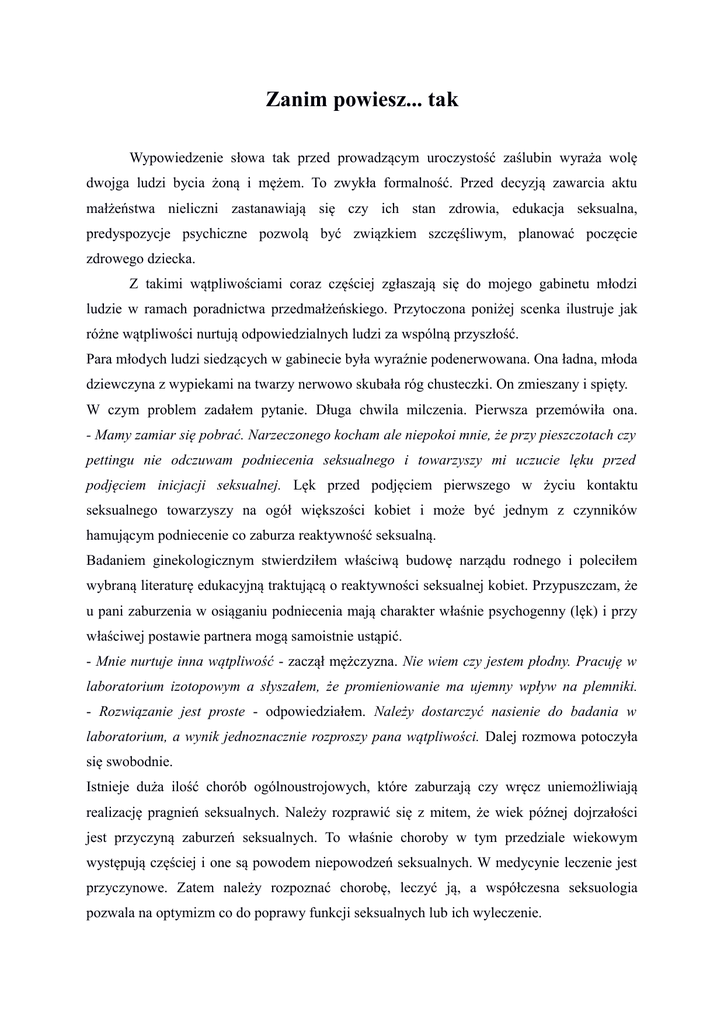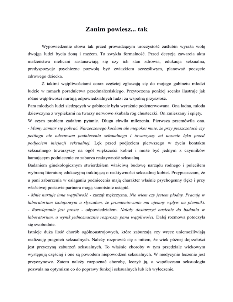 Zanim powiesz... tak Wypowiedzenie słowa tak przed prowadzącym uroczystość zaślubin wyraża wolę dwojga ludzi bycia żoną i mężem. To zwykła formalność. Przed decyzją zawarcia aktu małżeństwa nieliczni zastanawiają się czy ich stan zdrowia, edukacja seksualna, predyspozycje psychiczne pozwolą być związkiem szczęśliwym, planować poczęcie zdrowego dziecka. Z takimi wątpliwościami coraz częściej zgłaszają się do mojego gabinetu młodzi ludzie w ramach poradnictwa przedmałżeńskiego. Przytoczona poniżej scenka ilustruje jak różne wątpliwości nurtują odpowiedzialnych ludzi za wspólną przyszłość. Para młodych ludzi siedzących w gabinecie była wyraźnie podenerwowana. Ona ładna, młoda dziewczyna z wypiekami na twarzy nerwowo skubała róg chusteczki. On zmieszany i spięty. W czym problem zadałem pytanie. Długa chwila milczenia. Pierwsza przemówiła ona. - Mamy zamiar się pobrać. Narzeczonego kocham ale niepokoi mnie, że przy pieszczotach czy pettingu nie odczuwam podniecenia seksualnego i towarzyszy mi uczucie lęku przed podjęciem inicjacji seksualnej. Lęk przed podjęciem pierwszego w życiu kontaktu seksualnego towarzyszy na ogół większości kobiet i może być jednym z czynników hamującym podniecenie co zaburza reaktywność seksualną. Badaniem ginekologicznym stwierdziłem właściwą budowę narządu rodnego i poleciłem wybraną literaturę edukacyjną traktującą o reaktywności seksualnej kobiet. Przypuszczam, że u pani zaburzenia w osiąganiu podniecenia mają charakter właśnie psychogenny (lęk) i przy właściwej postawie partnera mogą samoistnie ustąpić. - Mnie nurtuje inna wątpliwość - zaczął mężczyzna. Nie wiem czy jestem płodny. Pracuję w laboratorium izotopowym a słyszałem, że promieniowanie ma ujemny wpływ na plemniki. - Rozwiązanie jest proste - odpowiedziałem. Należy dostarczyć nasienie do badania w laboratorium, a wynik jednoznacznie rozproszy pana wątpliwości. Dalej rozmowa potoczyła się swobodnie. Istnieje duża ilość chorób ogólnoustrojowych, które zaburzają czy wręcz uniemożliwiają realizację pragnień seksualnych. Należy rozprawić się z mitem, że wiek późnej dojrzałości jest przyczyną zaburzeń seksualnych. To właśnie choroby w tym przedziale wiekowym występują częściej i one są powodem niepowodzeń seksualnych. W medycynie leczenie jest przyczynowe. Zatem należy rozpoznać chorobę, leczyć ją, a współczesna seksuologia pozwala na optymizm co do poprawy funkcji seksualnych lub ich wyleczenie. W wielu krajach do zawarcia związku małżeńskiego wymagane jest świadectwo o stanie zdrowia. Oczywiście ta zasada nie jest gwarancją satysfakcjonującego życia seksualnego czy posiadania zdrowego potomstwa, ale odpowiedzialności za przyszły związek. Lekarz seksuolog udzielający porad przedmałżeńskich przy podejrzeniu istnienia chorób u partnerów powinien skierować ich do właściwych specjalistów. Ma to ogromne znaczenie w aspekcie leczenia zaburzeń seksualnych. Wiele chorób somatycznych, jak np. cukrzyca, choroba nadciśnieniowa u mężczyzn, powoduje zaburzenia wzwodu. Warto wspomnieć, że nieuzasadniony bardzo rozpowszechniony u mężczyzn psychogenny kompleks małego członka jest często przyczyną ich zaburzeń seksualnych Najczęstszym zaburzeniem seksualnym u mężczyzn jest przedwczesny wytrysk nasienia. Zaburzenia te nieleczone źle rokują co do trwałości związku małżeńskiego. W kontekście seksualności kobiet należy zwrócić uwagę na poziom libido stanowiący początek dalszych faz reakcji seksualnych. Lęk podczas badania ginekologicznego nawet przy dotyku narządu rodnego może być przesłanką do stwierdzenia pochwicy czyli niemożności podejmowania kontaktów seksualnych (związki białe). Bóle w obrębie jamy brzusznej wynikające ze schorzeń narządu rodnego (np. endometrioza, stany zapalne) zaburzają komfort życia seksualnego, niekiedy uniemożliwiają kobiecie podejmowanie kontaktów seksualnych. Depresja, nerwice powodują brak libido u obojga płci i zaburzenia wzwodu u mężczyzn. Leczone cofają się. W takich przypadkach przesunięcie terminu ślubu jest celowe i słuszne. Lekarz udzielający porad powinien zwrócić uwagę na optymalny wiek rozrodczy przyszłych małżonków. U kobiety mieści się między 20-25 rokiem życia a dla mężczyzny 24-30 rokiem życia. Badanie ginekologiczne pozwala na wykrycie wad narządu rodnego, które mogą być przyczyną trudności z zajściem w ciążę lub jej donoszeniem. W uzasadnionych przypadkach zaleca się badania DNA, które pozwalają określić ryzyko występowania chorób genetycznych u potomstwa co umożliwia rozpoczęcie wczesnego leczenia. Pewne choroby: neurologiczne, zwyrodnieniowe układu kostno-stawowego i inne mogą doprowadzić w przyszłości do inwalidztwa wymagającego stałej opieki ze strony współmałżonka. Świadomość tego powinna partnerom ułatwić podjęcie decyzji o wspólnym życiu. W życiu człowieka seksualizm odgrywa ogromną rolę zarówno w życiu osobniczym, rodzinnym jak i społecznym. Aby ten warunek był spełniony kandydaci na wspólny związek powinni mieć naukową wiedzę z zakresu zdrowia seksualnego. Kontrolną wizytę zaleca się dwa miesiące po ślubie. Po czterech tygodniach małżeństwa partnerzy nie są jeszcze w stanie uświadomić sobie istnienia nieprawidłowości. Po sześciu tygodniach istnieje świadomość problemu. Po ośmiu tygodniach potrafią go sprecyzować. Seksuolog zwykle jest w stanie pomóc w rozwiązaniu problemu. Właściwy dobór partnerów nie zależy tylko od diagnozy lekarskiej. W poradnictwie przedmałżeńskim konieczny jest niekiedy współudział psychologa, socjologa, prawnika i innych specjalistów. Chcąc uniknąć przykrych niespodzianek lub rozczarowań, zanim powiesz sakramentalne „tak” zasięgnij opinii lekarskiej, co daje szansę na wczesne wdrożenie skutecznego l