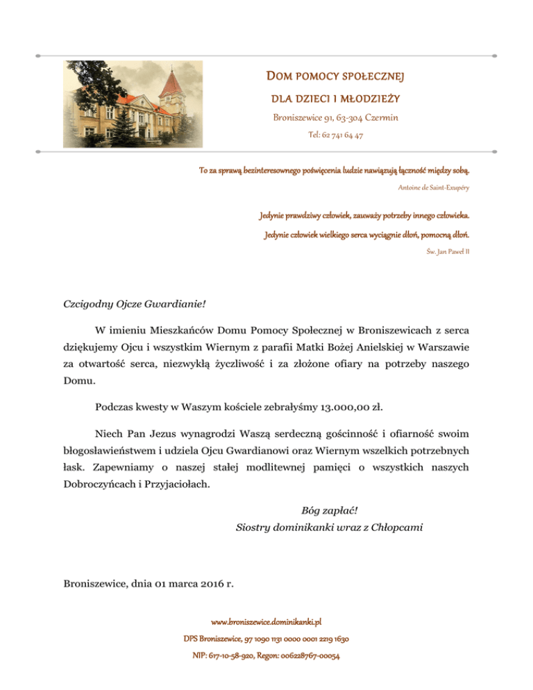 D OM POMOCY SPOŁECZNEJ DLA DZIECI I MŁODZIEŻY Broniszewice 91, 63-304 Czermin Tel: 62 741 64 47 To za sprawą bezinteresownego poświęcenia ludzie nawiązują łączność między sobą. Antoine de Saint-Exupéry Jedynie prawdziwy człowiek, zauważy potrzeby innego człowieka. Jedynie człowiek wielkiego serca wyciągnie dłoń, pomocną dłoń. Św. Jan Paweł II Czcigodny Ojcze Gwardianie! W imieniu Mieszkańców Domu Pomocy Społecznej w Broniszewicach z serca dziękujemy Ojcu i wszystkim Wiernym z parafii Matki Bożej Anielskiej w Warszawie za otwartość serca, niezwykłą życzliwość i za złożone ofiary na potrzeby naszego Domu. Podczas kwesty w Waszym kościele zebrałyśmy 13.000,00 zł. Niech Pan Jezus wynagrodzi Waszą serdeczną gościnność i ofiarność swoim błogosławieństwem i udziela Ojcu Gwardianowi oraz Wiernym wszelkich potrzebnych łask. Zapewniamy o naszej stałej modlitewnej pamięci o wszystkich naszych Dobroczyńcach i Przyjaciołach. Bóg zapłać! Siostry dominikanki wraz z Chłopcami Broniszewice, dnia 01 marca 2016 r. www.broniszewice.dominikanki.pl DPS Broniszewice, 97 1090 1131 0000 0001 2219 1630 NIP: 617-10-58-920, Regon: 006228767-00054