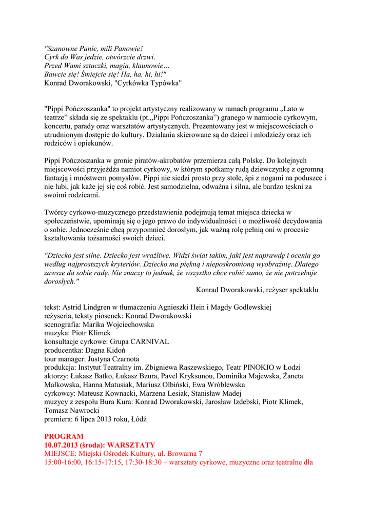 "Szanowne Panie, mili Panowie! Cyrk do Was jedzie, otwórzcie drzwi. Przed Wami sztuczki, magia, klaunowie… Bawcie się! Śmiejcie się! Ha, ha, hi, hi!" Konrad Dworakowski, "Cyrkówka Typówka" "Pippi Pończoszanka" to projekt artystyczny realizowany w ramach programu „Lato w teatrze” składa się ze spektaklu (pt.„Pippi Pończoszanka”) granego w namiocie cyrkowym, koncertu, parady oraz warsztatów artystycznych. Prezentowany jest w miejscowościach o utrudnionym dostępie do kultury. Działania skierowane są do dzieci i młodzieży oraz ich rodziców i opiekunów. Pippi Pończoszanka w gronie piratów-akrobatów przemierza całą Polskę. Do kolejnych miejscowości przyjeżdża namiot cyrkowy, w którym spotkamy rudą dziewczynkę z ogromną fantazją i mnóstwem pomysłów. Pippi nie siedzi prosto przy stole, śpi z nogami na poduszce i nie lubi, jak każe jej się coś robić. Jest samodzielna, odważna i silna, ale bardzo tęskni za swoimi rodzicami. Twórcy cyrkowo-muzycznego przedstawienia podejmują temat miejsca dziecka w społeczeństwie, upominają się o jego prawo do indywidualności i o możliwość decydowania o sobie. Jednocześnie chcą przypomnieć dorosłym, jak ważną rolę pełnią oni w procesie kształtowania tożsamości swoich dzieci. "Dziecko jest silne. Dziecko jest wrażliwe. Widzi świat takim, jaki jest naprawdę i ocenia go według najprostszych kryteriów. Dziecko ma piękną i nieposkromioną wyobraźnię. Dlatego zawsze da sobie radę. Nie znaczy to jednak, że wszystko chce robić samo, że nie potrzebuje dorosłych." Konrad Dworakowski, reżyser spektaklu tekst: Astrid Lindgren w tłumaczeniu Agnieszki Hein i Magdy Godlewskiej reżyseria, teksty piosenek: Konrad Dworakowski scenografia: Marika Wojciechowska muzyka: Piotr Klimek konsultacje cyrkowe: Grupa CARNIVAL producentka: Dagna Kidoń tour manager: Justyna Czarnota produkcja: Instytut Teatralny im. Zbigniewa Raszewskiego, Teatr PINOKIO w Łodzi aktorzy: Łukasz Batko, Łukasz Bzura, Pavel Kryksunou, Dominika Majewska, Żaneta Małkowska, Hanna Matusiak, Mariusz Olbiński, Ewa Wróblewska cyrkowcy: Mateusz Kownacki, Marzena Lesiak, Stanisław Madej muzycy z zespołu Bura Kura: Konrad Dworakowski, Jarosław Izdebski, Piotr Klimek, Tomasz Nawrocki premiera: 6 lipca 2013 roku, Łódź PROGRAM 10.07.2013 (środa): WARSZTATY MIEJSCE: Miejski Ośrodek Kultury, ul. Browarna 7 15:00-16:00, 16:15-17:15, 17:30-18:30 – warsztaty cyrkowe, muzyczne oraz teatralne dla dzieci i młodzieży. Każdy warsztat odbywa się trzykrotnie, w jednym warsztacie może wziąć udział maksymalnie 20 osób. 11.07.2013 (czwartek): PARADA, SPEKTAKL, KONCERT godz. 11:00 – PARADA: Park Miejski "Solidarność" (blisko muszli koncertowej) godz. 18:00 – SPEKTAKL „Pippi Pończoszanka” oraz KONCERT zespołu Bura Kura miejsce: Błonia, ul. Strzelecka. WSTĘP WOLNY! Zapisy na warsztaty oraz odbiór bezpłatnych wejściówek na spektakl i koncert: MOK, ul. Browarna 7, tel. (044) 724 42 93, e-mail: [email protected], [email protected] WARSZTATY: 10.07.2013, godz. 15:00-16:00, 16:15-17:15, 17:30-18:30 "PIRACI NA TRAPEZIE" - warsztaty cyrkowe Marzysz, by wystąpić w cyrku? A może wolisz zostać piratem? Będziemy razem żonglować, chodzić po linie, na chwilę staniemy się treserami dzikich zwierząt, a na koniec poszukamy ukrytego skarbu! "MORSKIE OPOWIEŚCI"- warsztaty muzyczne Artyści zespołu Bura Kura zapraszają do zaczarowanego świata dźwięków. Wspólnie poskaczemy po nutach, poleżymy na pięciolinii i stworzymy dziecięcy song wolności! "LIST W BUTELCE"- warsztaty teatralne Przygotowując się na spotkanie z Pippi, pobawimy się głosem i słowami. Razem z aktorami występującymi w przedstawieniu będziemy szeptać, gadać, a nawet krzyczeć. Urządzimy też maraton pisania listów. TRASA: 8-9 VII Piotrków Trybunalski | Miejski Ośrodek Kultury 10-11 VII Tomaszów Mazowiecki | Miejski Ośrodek Kultury 12-13 VII Warszawa 14-15 VII Łochów | Miejski i Gminny Ośrodek Kultury 16-17 VIII Krotoszyn | Krotoszyński Ośrodek Kultury 18-19 VIII Wągrowiec | Miejski Dom Kultury 20-21 VIII Oborniki Wielkopolskie | Obornicki Ośrodek Kultury 22-23 VIII Nowa Sól | Nowosolski Dom Kultury 24-25 VIII Głogów | Miejski Ośrodek Kultury 26-27 VIII Chocianów | Chocianowski Ośrodek Kultury 28-29 VIII Brzeg Dolny | Dolnobrzeski Ośrodek Kultury 30-31 VIII Poddębice | Poddębicki Dom Kultury i Sportu TWÓRCY SPEKTAKLU: Konrad Dworakowski – reżyser i aktor, absolwent białostockiego Wydziału Sztuki Lalkarskiej Akademii Teatralnej im. Aleksandra Zelwerowicza w Warszawie. W latach 20032005 był kierownikiem artystycznym Teatru Lalek Guliwer w Warszawie. Reżyserował w teatrach lalkowych i dramatycznych w Polsce oraz za granicą. Jest autorem scenariuszy i tekstów piosenek; pisze zarówno dla dzieci, jak i dla dorosłych. Od 2009 roku jest dyrektorem naczelnym i artystycznym Teatru PINOKIO w Łodzi. Marika Wojciechowska – absolwentka malarstwa Instytutu Sztuk Pięknych Uniwersytetu Rzeszowskiego oraz Katedry Scenografii Akademii Sztuk Pięknych w Krakowie. Jej prace były prezentowane na wystawach indywidualnych oraz na ponad czterdziestu ekspozycjach zbiorowych. Tworzy scenografie do spektakli w Polsce i za granicą. Piotr Klimek – kompozytor, wykładowca, producent muzyczny. Absolwent Królewskiego Konserwatorium w Hadze oraz Akademii Muzycznej w Poznaniu (od 2003 roku doktor sztuk muzycznych w dziedzinie kompozycji). Od 1998 roku związany z Uniwersytetem Szczecińskim. Wykłada gościnnie także na innych uczelniach w Polsce i za granicą. Pisze muzykę chóralną, elektroniczną, kameralną, symfoniczną oraz teatralną. Współtworzył ponad osiemdziesiąt realizacji scenicznych. Realizacja projektu w Tomaszowie Mazowieckim jest możliwa dzięki wsparciu GminyMiasto Tomaszów Mazowiecki. "Pippi Pończoszanka" to produkcja Instytutu Teatralnego im. Zbigniewa Raszewskiego oraz Teatru PINOKIO w Łodzi. Tea