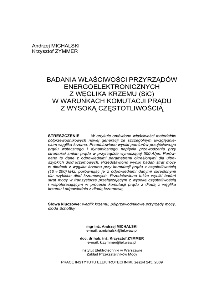 Andrzej MICHALSKI Krzysztof ZYMMER BADANIA WŁAŚCIWOŚCI PRZYRZĄDÓW ENERGOELEKTRONICZNYCH Z WĘGLIKA KRZEMU (SiC) W WARUNKACH KOMUTACJI PRĄDU Z WYSOKĄ CZĘSTOTLIWOŚCIĄ STRESZCZENIE W artykule omówiono właściwości materiałów półprzewodnikowych nowej generacji ze szczególnym uwzględnieniem węglika krzemu. Przedstawiono wyniki pomiarów przejściowego prądu wstecznego i dynamicznego napięcia przewodzenia przy stromości zmian prądu w przyrządzie wynoszącej 500 A/μs. Porównano te dane z odpowiednimi parametrami określonymi dla ultraszybkich diod krzemowych. Przedstawiono wyniki badań strat mocy w diodach z węglika krzemu przy komutacji prądu z częstotliwością (10 ÷ 200) kHz, porównując je z odpowiednimi danymi określonymi dla szybkich diod krzemowych. Przedstawiono także wyniki badań strat mocy w tranzystorze przełączającym z wysoką częstotliwością i współpracującym w procesie komutacji prądu z diodą z węglika krzemu i odpowiednio z diodą krzemową. Słowa kluczowe: węglik krzemu, półprzewodnikowe przyrządy mocy, dioda Schottky mgr inż. Andrzej MICHALSKI e-mail: [email protected] doc. dr hab. inż. Krzysztof ZYMMER e-mail: [email protected] Instytut Elektrotechniki w Warszawie Zakład Przekształtników Mocy PRACE INSTYTUTU ELEKTROTECHNIKI, zeszyt 243, 2009 6 A. Michalski, K. Zymmer 1. WPROWADZENIE Prowadzone w latach 90-tych ubiegłego wieku prace badawcze nad nowymi materiałami półprzewodnikowymi doprowadziły w efekcie do wprowadzenia do produkcji przyrządów półprzewodnikowych o właściwościach istotnie korzystniejszych od odpowiednich przyrządów bazujących na krzemie. Dotyczy to zwłaszcza parametrów dynamicznych szczególnie istotnych podczas pracy układów przekształtnikowych z wysoką częstotliwością, a także temperatury pracy. Jednym z materiałów stosowanych obecnie w technice półprzewodnikowej jest węglik krzemu (SiC). Przyrządy energoelektroniczne (diody Schottky) wytwarzane na bazie tego materiału charakteryzują się obecnie parametrami granicznymi napięcia i prądu rzędu 1200 V i kilkudziesięciu amperów. Można już na bazie tych przyrządów projektować przekształtniki, o mocy kilku, a przy łączeniu równoległym elementów – kilkunastu kilowatów, pracujące z częstotliwością wyższą, niż umożliwiają to odpowiednie przyrządy bazujące na krzemie. Ponieważ przyrządy te są elementami stosunkowo nowymi, ważne jest poznanie ich właściwości, prowadzone zwłaszcza przez badania eksperymentalne w przekształtnikach o różnych topologiach. Uzyskane wyniki będą stanowiły istotny materiał pomocny przy opracowywaniu konkretnych urządzeń o różnym przeznaczeniu. W niniejszym artykule przedstawiono wyniki badań diod unipolarnych SiC prowadzone w układzie testującym o częstotliwości zmienianej w granicach (10 ÷ 200) kHz. Zaprezentowano także dane porównawcze dotyczące właściwości diod SiC oraz ultraszybkich bipolarnych diod krzemowych. 2. NOWE MATERIAŁY PÓŁPRZEWODNIKOWE Do poszukiwań nowych materiałów, z których można wykonać przyrządy półprzewodnikowe, skłania narastające zapotrzebowanie na przyrządy działające w temperaturach zdecydowanie wyższych, niż pozwalają na to możliwości krzemu (Si). Właściwości przyrządów krzemowych ulegają degradacji przy wyższych temperaturach, które mogą występować w zastosowaniach motoryzacyjnych, w przemyśle chemicznym czy też w technice kosmicznej. W tych przypadkach za najbardziej obiecujący nowy materiał półprzewodnikowy uważa się węglik krzemu (SiC). Istotny dla oceny materiału półprzewodnikowego parametr, energia pasma zabronionego, wynosi dla węglika krzemu 3,0 eV wobec 0,5 eV dla krzemu. Ponadto węglik krzemu charakteryzuje się większą 7 Badania właściwości przyrządów energoelektronicznych z węglika krzemu (SiC) … przewodnością cieplną niż krzem, wyższą temperaturą pracy – do 650°C i dopuszcza stosowanie gęstości prądu do ok. 400 A/cm2. Jest to materiał bardzo wytrzymały mechanicznie, a napięcia znamionowe wykonanych z niego przyrządów półprzewodnikowych mogą osiągać wartości do około 20 kV. Innym materiałem przyszłościowym dla następnych generacji przyrządów energoelektronicznych jest arsenek galu (GaA), który wykazuje wyższą ruchliwość nośników prądu i większą szerokość pasma zabronionego niż krzem. Ocenia się, że perspektywicznym materiałem półprzewodnikowym jest syntetyczny diament charakteryzujący się dużą wartością pasma zabronionego (ok. 5 eV), doskonałą przewodnością cieplną, wysoką temperaturą pracy oraz większą łatwością otrzymywania monokryształów o dużych powierzchniach, niż w przypadku materiałów o charakterze związków chemicznych, jakimi są arsenek galu czy węglik krzemu. Podstawowe właściwości różnych materiałów półprzewodnikowych zestawiono w tabeli 1. TABELA 1 Podstawowe właściwości wybranych materiałów półprzewodnikowych do produkcji przyrządów mocy Krzem (Si) Arsenek galu (GaAs) Węglik krzemu (SiC) Diament Jednostka Szerokość pasma zabronionego [Eq] 1,1 1,4 3,0 5,0 EV Dopuszczalna temperatura pracy [Tjmax] do 200 do 400 do 650 ponad 800 °C Czas życia nośników mniejszościowych przy napięciu 1 kV w obszarze unoszenia [τp] 1200 110 40 7 ns Graniczna częstotliwość pracy [f] 0,5 1…3 1…3 2…5 MHz Dopuszczalna gęstość ciągłego prądu przewodzenia [j] 100…200 150…300 400 800 A/cm2 Przewodność cieplna [λ] 1,5 0,5 5 20 [W/cm ⋅ K] 3. WŁAŚCIWOŚCI WĘGLIKA KRZEMU Węglik krzemu (SiC) należy do grupy materiałów o dużej twardości i jest również stosowany jako pokrycie koronek wiertniczych, ostrzy pił oraz jako 8 A. Michalski, K. Zymmer materiał ścierny. Charakteryzuje się dużą odpornością na wysoką temperaturę, promieniowanie radioaktywne i jednocześnie jest dobrym przewodnikiem ciepła. Kryształ z węglika krzemu skł