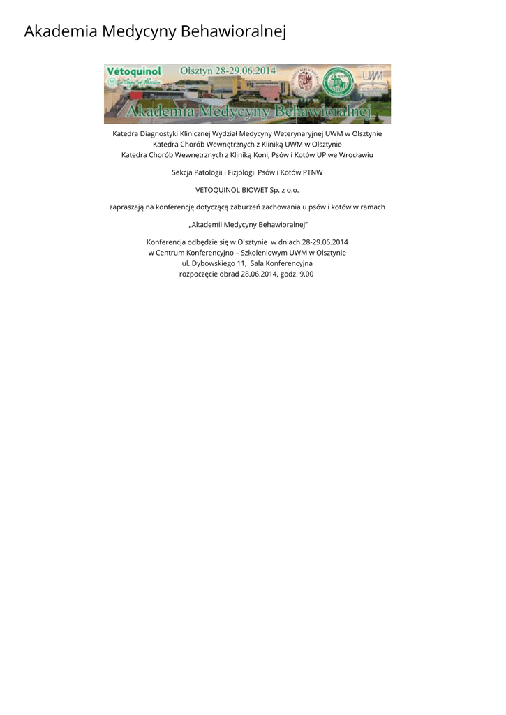 Akademia Medycyny Behawioralnej Katedra Diagnostyki Klinicznej Wydział Medycyny Weterynaryjnej UWM w Olsztynie Katedra Chorób Wewnętrznych z Kliniką UWM w Olsztynie Katedra Chorób Wewnętrznych z Kliniką Koni, Psów i Kotów UP we Wrocławiu Sekcja Patologii i Fizjologii Psów i Kotów PTNW VETOQUINOL BIOWET Sp. z o.o. zapraszają na konferencję dotyczącą zaburzeń zachowania u psów i kotów w ramach „Akademii Medycyny Behawioralnej” Konferencja odbędzie się w Olsztynie w dniach 28-29.06.2014 w Centrum Konferencyjno – Szkoleniowym UWM w Olsztynie ul. Dybowskiego 11, Sala Konferencyjna rozpoczęcie obrad 28.06.2014, godz. 9.00
