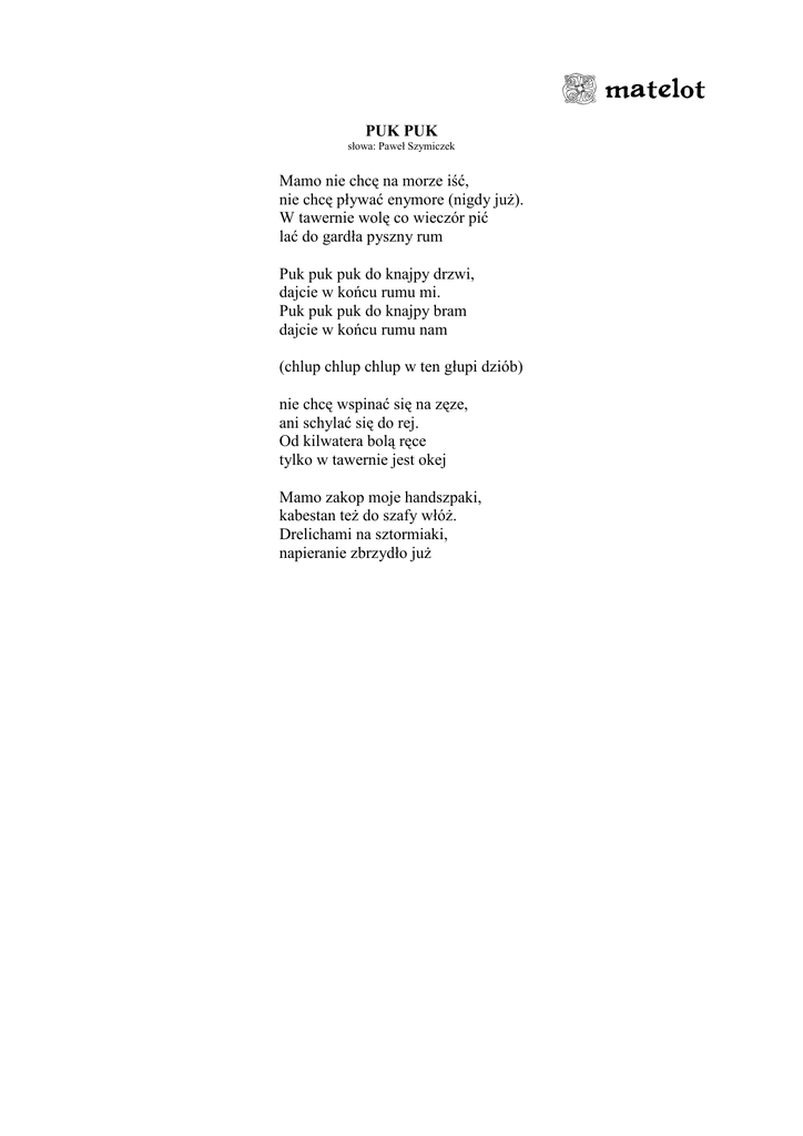 + matelot PUK PUK słowa: Paweł Szymiczek Mamo nie chcę na morze iść, nie chcę pływać enymore (nigdy już). W tawernie wolę co wieczór pić lać do gardła pyszny rum Puk puk puk do knajpy drzwi, dajcie w końcu rumu mi. Puk puk puk do knajpy bram dajcie w końcu rumu nam (chlup chlup chlup w ten głupi dziób) nie chcę wspinać się na zęze, ani schylać się do rej. Od kilwatera bolą ręce tylko w tawernie jest okej Mamo zakop moje handszpaki, kabestan też do szafy włóż. Drelichami na sztormiaki, napieranie zbrzydło już