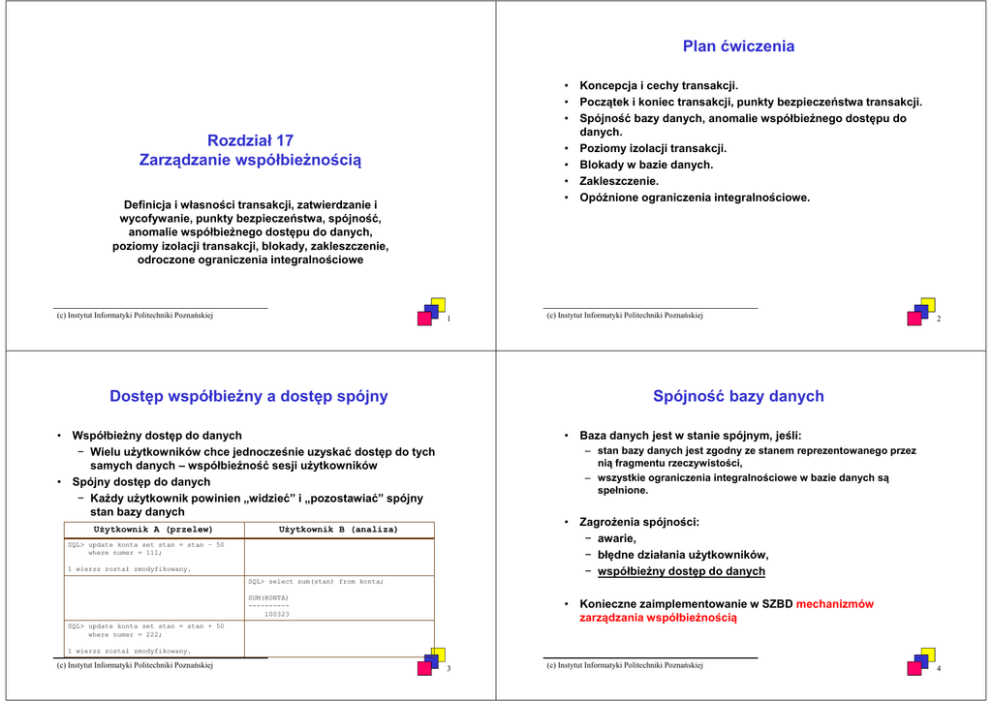 • Spójność bazy danych, anomalie współbieżnego dostępu do