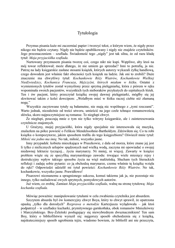Tytułologia Przymus pisania każe mi zaczerniać papier i tworzyć tekst, o którym wiem, że nigdy przez nikogo nie będzie czytany. Nigdy nie będzie opublikowany i nigdy nie znajdzie czytelników. Jego przeznaczeniem – szuflada. Świadomość tego „nigdy” jest tak silna, że od razu kładę tytuł: Moja przyjaciółka szuflada. Nurtowany przymusem pisania tworzę coś, czego nikt nie kupi. Wątpliwe, aby ktoś na mój towar reflektował; może dlatego, że nie umiem go sprzedać? Inni to potrafią, ja nie. Patrzę na lady księgarskie zasłane stosami książek, których autorzy wykazali żyłkę handlową, czego dowodem jest właśnie fakt obecności tych książek na ladzie. Jak oni to zrobili? Duże znaczenie ma chwytliwy tytuł: Kochankowie Róży Wiatrów, Kochankowie Wielkiej Niedźwiedzicy, Kochanica Francuza, Mężczyźni, których miałam w łóżku. Ostatni z wymienionych tytułów został wymyślony przez sprytną pielęgniarkę, która z piórem w ręku wspominała swoich pacjentów, wszystkich tych nieboraków przykutych do szpitalnych łóżek. Ten i ów pacjent, który przeczytał książkę swojej dawnej pielęgniarki, mógłby się jej skwitować takim z kolei dowcipem: „Wolałbym mieć w łóżku raczej ciebie niż złamaną nogę.” Wszystkie zacytowane tytuły są bałamutne, nie mają nic wspólnego z „tymi rzeczami”. Warto jednak, niezależnie od treści utworu, umieścić na jego czele tchnące romansowością słówka, skoro najpoczytniejsze są romanse. To niegłupi chwyt. Że niegłupi, pouczają mnie o tym nie tylko witryny księgarskie, ale i zainteresowania czytelnicze znajomych. U Grażyny, mojej przyjaciółki, która nigdy specjalnie nie interesowała się muzyką, znalazłem na półce powieść o Feliksie Mendelssohnie-Bartholdym. Zdziwiłem się. Co tu robi książka o kompozytorze, jakim sposobem trafiła do tego księgozbioru? Oświecił mnie tytuł: Miłość nie jedno ma imię. No tak, miłość, wszystko jasne. Inny przypadek: kobieta mieszkająca w Pruszkowie, z dala od morza, które znane jej jest li tylko z nielicznych urlopów spędzonych nad wielką wodą, zaczyna mi opowiadać o swojej niedawnej lekturze tyczącej... życia marynarzy. Ni mniej, ni więcej. Zawarty w książce problem wiąże się ze specyfiką marynarskiego zawodu: trwające wiele miesięcy rejsy i destrukcyjny wpływ takiego sposobu życia na więź małżeńską. Słucham tych literackich refleksji i zadaję sobie pytanie: co ją obchodzą marynarze, czemu właśnie tę książkę wzięła do ręki? Odpowiedzi udzielił mi tytuł powieści: Kochankowie Róży Wiatrów. No tak, kochankowie, wszystko jasne. Prawidłowo! Pisarzowi nieznanemu a spragnionego sukcesu, komuś takiemu jak ja, nie pozostaje nic innego, tylko naśladować owych sprytnych, pomysłowych autorów. Już wiem, co zrobię. Zamiast Moja przyjaciółka szuflada, walnę na stronę tytułową: Moja kochanka szuflada. Mówiąc poważnie: manipulowanie tytułami w celu zwabienia czytelnika jest absurdem. Szczytem absurdu był ów komercyjny chwyt Boya, który to chwyt sprawił, że opatrzona opaską „tylko dla dorosłych” Rozprawa o metodzie Kartezjusza wylądowała – jak ktoś podpatrzył – w szufladce kucharki, prymitywnego garnkotłuka, obok romansów Mniszkówny i Marczyńskiego. Boy-Żeleński posługujący się niewybrednym dwuznacznikiem! Ten sam Boy, który o bibliofilstwie wyraził się: najgorszy sposób obchodzenia się z książką, najskuteczniejszy sposób ugrobienia tejże, wiadomo bowiem, że bibliofil ani nie przeczyta, ani drugiemu nie pożyczy. Dobrze, a co spowodował on sam, Boy? Że Kartezjusz, nie przeczytany przez kuchtę i innych podobnych nabywców, poszedł na podpałkę. Wszystko to nie zmienia faktu, że dobry tytuł, to znaczy dobrze dobrany, nie oszukańczy – stanowi połowę sukcesu. To niekiedy 80 procent sukcesu. Wspomnienia z pobytu „na nieludzkiej ziemi”, czyli przeżycia Polaka w Bolszewii, mogą być bardzo interesujące, jednakże tytuł Na nieludzkiej ziemi nie jest nadzwyczajny. Lecz oto inny pamiętnikarz, któremu udało się unieść głowę z komunistycznego raju, zabiera się do pisania i opatruje swój tekst tytułem Między młotem a sierpem. Ta aluzja do porzekadła: „między młotem a kowadłem” jest wprost genialna. O tytułach wymyślonych przez francuskich dziennikarzy można rzec, iż są „nie pozbawione” dowcipu. Gdy Goldwater, amerykański kandydat na prezydenta, przegrał w wyborach, skwitowano to we francuskiej prasie tytułem Goldwaterloo. Gdy przyjechali na występy do Paryża dwaj skrzypkowie, ojciec i syn, Dawid i Igor Ojstrachowie, w paryskiej gazecie pojawił się tytuł Król Dawid i książę Igor (aluzja do Starego Testamentu i opery Borodina Kniaź Igor). Francuski film o mężczyźnie, który zaszedł w ciążę, zatytułowano Największe wydarzenie od czasu, gdy człowiek wylądował na Księżycu. Film o kobiecie, której męża zastrzelono na stopniach kościoła, w chwilę po zakończeniu ślubnej ceremonii, otrzymał tytuł Panna młoda w żałobie. Nie zestarzejemy się razem, jeszcze jeden dowcipny tytuł, idealnie dobrany do filmu pokazującego nie tyle miłość, co przemijającą miłostkę. Niektóre francuskie tytuły stają się przysłowiami, np. Bohaterowie są zmęczeni. Przechodzą do mowy potocznej jako porzekadła, np. Wielkie żarcie. W drodze do pracy, w codziennej pieszej wędrówce labiryntem ulic, przechodziłem obok afisza, z którego uśmiechał się Belmondo. Na twarzy pogodny uśmiech, a palec na cynglu spluwy. Sam uśmiech, gdyby widoczna była tylko głowa, mógłby mdlić. Zmarszczenie brwi plus grożenie pistoletem trąciłoby groteską. Lecz połączenie uśmiechu ze złowrogim gestem to właśnie nadsekwański esprit. A więc francuski gwiazdor w roli policjanta, gliniarza, czyli gliny. Wyraz glina widniał na afiszu jako pierwsza część tytułu. Najpierw zwróciło moj