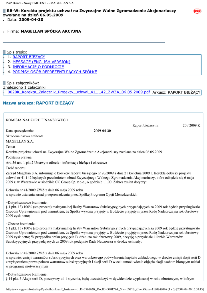PAP Biznes - Nowy EMITENT - - MAGELLAN S.A. RB-W: Korekta projektu uchwał na Zwyczajne Walne Zgromadzenie Akcjonariuszy zwołane na dzień 06.05.2009 ● Data: 2009-04-30 ● ● ● ● ● Firma: MAGELLAN SPÓŁKA AKCYJNA Spis treści: 1. RAPORT BIEŻĄCY 2. MESSAGE (ENGLISH VERSION) 3. INFORMACJE O PODMIOCIE 4. PODPISY OSÓB REPREZENTUJĄCYCH SPÓŁKĘ Spis załączników: Znaleziono 1 załączniki ● 0020K_Korekta_Zalacznik_Projekty_uchwal_41_i_42_ZWZA_06.05.2009.pdf Arkusz: RAPORT BIEŻĄCY Nazwa arkusza: RAPORT BIEŻĄCY KOMISJA NADZORU FINANSOWEGO Raport bieżący nr 20 / 2009 K Data sporządzenia: 2009-04-30 Skrócona nazwa emitenta MAGELLAN S.A. Temat Korekta projektu uchwał na Zwyczajne Walne Zgromadzenie Akcjonariuszy zwołane na dzień 06.05.2009 Podstawa prawna Art. 56 ust. 1 pkt 2 Ustawy o ofercie - informacje bieżące i okresowe Treść raportu: Zarząd Magellan S.A. informuje o korekcie raportu bieżącego nr 20/2009 z dnia 21 kwietnia 2009 r. Korekta dotyczy projektu uchwał nr 41 i 42 będących przedmiotem obrad Zwyczajnego Walnego Zgromadzenia Akcjonariuszy, które odbędzie się 6 maja 2009 r. w Warszawie w siedzibie CC Group Sp. z o.o., o godzinie 11.00. Zakres zmian dotyczy: Uchwała nr 41/2009 ZWZ z dnia 06 maja 2009 roku w sprawie ustalenia zasad przeprowadzenia przez Spółkę Programu Opcji Menedżerskich ~Dotychczasowe brzmienie: § 1 pkt. 13) 100% (sto procent) maksymalnej liczby Warrantów Subskrypcyjnych przypadających za 2009 rok będzie przysługiwało Osobom Uprawnionym pod warunkiem, że Spółka wykona przyjęty w Budżecie przyjętym przez Radę Nadzorczą na rok obrotowy 2009 zysk netto; ~Obecne brzmienie: § 1 pkt. 13) 100% (sto procent) maksymalnej liczby Warrantów Subskrypcyjnych przypadających za 2009 rok będzie przysługiwało Osobom Uprawnionym pod warunkiem, że Spółka wykona przyjęty w Budżecie przyjętym przez Radę Nadzorczą na rok obrotowy 2009 zysk netto; W przypadku braku przyjęcia Budżetu na rok obrotowy 2009, decyzję o przydziale i liczbie Warrantów Subskrypcyjnych przypadających za 2009 rok podejmie Rada Nadzorcza w drodze uchwały; Uchwała nr 42/2009 ZWZ z dnia 06 maja 2009 roku w sprawie: emisji warrantów subskrypcyjnych oraz warunkowego podwyższenia kapitału zakładowego w drodze emisji akcji serii D z wyłączeniem prawa poboru warrantów subskrypcyjnych i akcji serii D w celu umożliwienia objęcia akcji osobom biorącym udział w programie motywacyjnym ~Dotychczasowe brzmienie: § 14 pkt. 5 Akcje serii D, począwszy od 1 stycznia, będą uczestniczyć w dywidendzie wypłacanej w roku obrotowym, w którym http://www.gpwinfostrefa.pl/palio/html.run?_Instance=c...D=196162&_DocID=378174&_Site=ESPI&_CheckSum=1190249076 (1 z 3) [2009-04-30 16:30:45] PAP Biznes - Nowy EMITENT - - MAGELLAN S.A. zostały wydane, jeżeli zostaną zapisane na rachunku papierów wartościowych osoby, która wykonała prawo objęcia akcji serii D nie później niż w dniu poprzedzającym dzień Walnego Zgromadzenia, na którym powzięta zostanie uchwała o podziale zysku i ustaleniu dnia dywidendy. ~Obecne brzmienie: § 14 pkt. 5 Akcje serii D będą uczestniczyć w dywidendzie na zasadach następujących: (i) akcje serii D, wydane lub zapisane po raz pierwszy na rachunku papierów wartościowych najpóźniej w dniu dywidendy ustalonym w uchwale Walnego Zgromadzenia w sprawie podziału zysku, uczestniczą w dywidendzie począwszy od zysku za poprzedni rok obrotowy, tzn. od dnia 1 stycznia roku obrotowego poprzedzającego bezpośredni rok, w którym akcje te zostały wydane lub zapisane po raz pierwszy na rachunku papierów wartościowych, (ii) akcje serii D, wydane lub zapisane po raz pierwszy na rachunku papierów wartościowych w dniu przypadającym po dniu dywidendy ustalonym w uchwale Walnego Zgromadzenia w sprawie podziału zysku, uczestniczą w dywidendzie począwszy od zysku za rok obrotowy, w którym akcje te zostały wydane lub zapisane po raz pierwszy na rachunku papierów wartościowych, tzn. od dnia 1 stycznia tego roku obrotowego. W załączeniu przedstawiamy treść jednolitą projektu obu uchwał. Załączniki Plik Opis 0020K Korekta Załącznik Projekty uchwał 41 i 42 ZWZA 06.05.2009.pdf 0020K Korekta Załącznik Projekty uchwał 41 i 42 ZWZA 06.05.2009.pdf Projekt skorygowych uchwał Nazwa arkusza: MESSAGE (ENGLISH VERSION) MESSAGE (ENGLISH VERSION) Nazwa arkusza: INFORMACJE O PODMIOCIE MAGELLAN SPÓŁKA AKCYJNA (pełna nazwa emitenta) MAGELLAN S.A. (skrócona nazwa emitenta) 90-057 (kod pocztowy) Sienkiewicza 85/87 (ulica) 42 637 17 90 (telefon) [email protected] (e-mail) 947-18-00-271 (NIP) Finanse inne (fin) (sektor wg. klasyfikacji GPW w W-wie) Łódź (miejscowość) 85/87 (numer) 42 637 08 00 (fax) www.magellan.pl (www) 471987671 (REGON) Nazwa arkusza: PODPISY OSÓB REPREZENTUJĄCYCH SPÓŁKĘ PODPISY OSÓB REPREZENTUJĄCYCH SPÓŁKĘ Data Imię i Nazwisko 2009-04-30 Grzegorz Grabowicz 2009-04-30 Rafał Karnowski Stanowisko/Funkcja Wiceprezes Zarządu Członek Zarządu Podpis http://www.gpwinfostrefa.pl/palio/html.run?_Instance=c...D=196162&_DocID=378174&_Site=ESPI&_CheckSum=1190249076 (2 z 3) [2009-04-30 16:30:45] PAP Biznes - Nowy EMITENT - - MAGELLAN S.A. Identyfikator raportu ds6x0hpt41 Nazwa raportu RB-W Symbol raportu RB-W Nazwa emitenta MAGELLAN SPÓŁKA AKCYJNA Symbol Emitenta MAGELLAN S.A. Tytuł Korekta projektu uchwał na Zwyczajne Walne Zgromadzenie Akcjonariuszy zwołane na dzień 06.05.2009 Sektor Finanse inne (fin) Kod 90-057 Miasto Łódź Ulica Sienkiewicza 85/87 Nr 85/87 Tel. 42 637 17 90 Fax 42 637 08 00 e-mail [email protected] NIP 947-18-00-271 REGON 471987671 Data sporządzenia 2009-04-30 Rok bieżący 2009 Numer 20 adres www www.magellan.pl Serwis Ekonomiczny Polskiej Agencji Prasowej SA 2000-2005 Copyright PAP SA - Wszelkie prawa zastrzeżone. http://www.gpwinfostrefa.pl/palio/html.run?_Instance=c...D=196162&_DocID=378174&_Site=ESPI&_CheckSum=1190249076 (3 z 3) [2009-04-30 16:30:45]