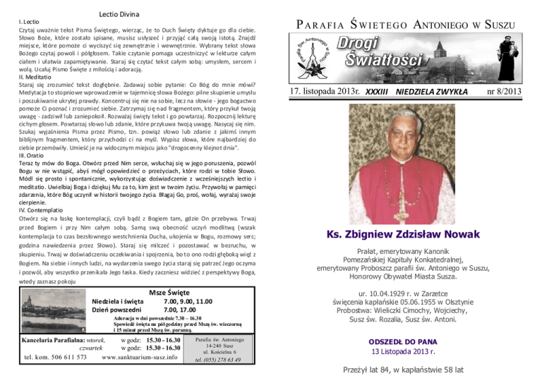 Lectio Divina I. Lectio Czytaj uważnie tekst Pisma Świętego, wierząc, że to Duch Święty dyktuje go dla ciebie. Słowo Boże, które zostało spisane, musisz usłyszeć i przyjąć całą swoją istotą. Znajdź miejsce, które pomoże ci wyciszyć się zewnętrznie i wewnętrznie. Wybrany tekst słowa Bożego czytaj powoli i półgłosem. Takie czytanie pomaga uczestniczyć w lekturze całym ciałem i ułatwia zapamiętywanie. Staraj się czytać tekst całym sobą: umysłem, sercem i wolą. Ucałuj Pismo Święte z miłością i adoracją. II. Meditatio Staraj się zrozumieć tekst dogłębnie. Zadawaj sobie pytanie: Co Bóg do mnie mówi? Medytacja to stopniowe wprowadzenie w tajemnicę słowa Bożego: pilne skupienie umysłu i poszukiwanie ukrytej prawdy. Koncentruj się nie na sobie, lecz na słowie - jego bogactwo pomoże Ci poznać i zrozumieć siebie. Zatrzymaj się nad fragmentem, który przykuł twoją uwagę - zadziwił lub zaniepokoił. Rozważaj święty tekst i go powtarzaj. Rozpocznij lekturę cichym głosem. Powtarzaj słowo lub zdanie, które przykuwa twoją uwagę. Nasycaj się nim. Szukaj wyjaśnienia Pisma przez Pismo, tzn. powiąż słowo lub zdanie z jakimś innym biblijnym fragmentem, który przychodzi ci na myśl. Wypisz słowa, które najbardziej do ciebie przemówiły. Umieść je na widocznym miejscu jako "drogocenny klejnot dnia". III. Oratio Teraz ty mów do Boga. Otwórz przed Nim serce, wsłuchaj się w jego poruszenia, pozwól Bogu w nie wstąpić, abyś mógł opowiedzieć o przeżyciach, które rodzi w tobie Słowo. Módl się prosto i spontanicznie, wykorzystując doświadczenie z wcześniejszych lectio i meditatio. Uwielbiaj Boga i dziękuj Mu za to, kim jest w twoim życiu. Przywołaj w pamięci zdarzenia, które Bóg uczynił w historii twojego życia. Błagaj Go, proś, wołaj, wyrażaj swoje cierpienie. IV. Contemplatio Otwórz się na łaskę kontemplacji, czyli bądź z Bogiem tam, gdzie On przebywa. Trwaj przed Bogiem i przy Nim całym sobą. Samą swą obecność uczyń modlitwą (wszak kontemplacja to czas bezsłownego westchnienia Ducha, ukojenia w Bogu, rozmowy serc; godzina nawiedzenia przez Słowo). Staraj się milczeć i pozostawać w bezruchu, w skupieniu. Trwaj w doświadczeniu oczekiwania i spojrzenia, bo to ono rodzi głęboką więź z Bogiem. Na siebie i innych ludzi, na wydarzenia swego życia staraj się patrzeć Jego oczyma i pozwól, aby wszystko przenikała Jego łaska. Kiedy zaczniesz widzieć z perspektywy Boga, wtedy zaznasz pokoju Msze Święte Niedziela i święta Dzień powszedni 7.00, 9.00, 11.00 7.00, 17.00 Adoracja w dni powszednie 7.30 – 16.30 Spowiedź święta na pół godziny przed Mszą św. wieczorną i 15 minut przed Mszą św. poranną. Kancelaria Parafialna: wtorek, w godz: 15.30 - 16.30 czwartek w godz: 15.30 - 16.30 tel. kom. 506 611 573 www.sanktuarium-susz.info Parafia św. Antoniego 14-240 Susz ul. Kościelna 6 P A R A F I A Ś W I Ę T E G O ANTONIEGO W 17. listopada 2013r. XXXIII NIEDZIELA ZWYKŁA SUSZU nr 8/2013 Ks. Zbigniew Zdzisław Nowak Prałat, emerytowany Kanonik Pomezańskiej Kapituły Konkatedralnej, emerytowany Proboszcz parafii św. Antoniego w Suszu, Honorowy Obywatel Miasta Susza. ur. 10.04.1929 r. w Zarzetce święcenia kapłańskie 05.06.1955 w Olsztynie Probostwa: Wieliczki Cimochy, Wojciechy, Susz św. Rozalia, Susz św. Antoni. ODSZEDŁ DO PANA 13 Listopada 2013 r. tel. (055) 278 63 49 Przeżył lat 84, w kapłaństwie 58 lat Ogłoszenia Parafialne Intencje Mszy św. 1. D zisiaj gościm y w naszej parafii Siostrę Karme lit ankę Bosą, która pow ie św iadect wo sw ojego życia i będ zie zbie rała of iary do p uszki na rzecz sw o jego klasztoru. 2. Z apraszam y codziennie przez m ie siąc listopad na wspólną 7.00 7.00 17.00 mod lit wę różańcow ą o godzinie 16. 30 w intencji naszych zmarłych, kt órych imiona i nazw iska wypisaliśm y na kartkach i na M szę św ., zbioro wą za zm arłych o godzin ie 17.0 0. 7.00 17.00 3. O d poniedziałku odpraw iam y Mszę ś w. gregoriańska w inte ncji 17.00 Ks. Prałata Zb igniew a Nowaka 4. W sob otę 2 3.11, br., zapra szamy na spo tykanie R a dę 17.00 parafialną na g odzinę 18.00 . 5. W nast ępn ą niedzielę będziemy gościli w naszej paraf ii alum nów naszego sem inariu m, kt órzy po każdej M szy ś w., będą rozp rowadzali kalen darze . 6. W sobotę 23. 7.00 listopada orga nizowany jest wyjazd na zakończenie R oku W iary do katedry w Elblą gu, cena wyja zd u 20 zł, zapisy u księ dza M arcina . 17.00 7.00 17.00 17.00 7.00 7. Msza św . w intencji Złotych Róż i M argaretek w sobo tę o 17.00 godzin ie 15.00. 8. N asza D ie cezja organizuje wyjazdy na kan onizację bł. Ja na Paw ła II szczegó ły na st ronie interneto w ej w w w. pielgrzym.org.pl 9. W sobotę M sza św . w ieczorna, je st od praw ian a wg rytuału niedzieln ego, w szyscy ci, kt órzy z ważnych powodów nie mogą 7.00 15.00 17.00 17.00 10. W t ym tyg odniu są jeszcze wo lne in tencje. 7.00 8.00 9.00 9.00 11.00 13.00 11. W szystkim Jubilatom i Sole nizantom życzymy wie lu radosnych 17.00 uczestn iczyć w nie dzielę uczestn iczyć we we M szy ś w. Mszy św ., niedzielnej m ają obow iązek odprawianej po I N ieszporach z Niedzieli, czyli w So botę w ieczorem . dni i Bożej opieki. 18.11 – Poniedziałek O Boże błogosławieństwo, pomyślność i zdrowie dla Heleny Śp. Ks. Prałat Zbigniew Nowak 1. Msza św. gregoriańska Msza św. zbiorowa za zmarłych, których imiona i nazwiska wypisaliśmy na kartkach i za których modlimy się przez cały miesiąc listopad 19.11 –Wtorek Śp. Ks. Prałat Zbigniew Nowak 2. Msza św. gregoriańska. Msza św. zbiorowa za zmarłych, których imiona i nazwiska wypisaliśmy na kartkach i za których modlimy się przez cały miesiąc listopad Śp. Władysław Kucharczyk – intencja od sąsiadów 20.11 – Środa Śp. Ks. Prałat Zbigniew Nowak 3. Msza św. gregoriańska. Msza św. zbiorowa za zmarły