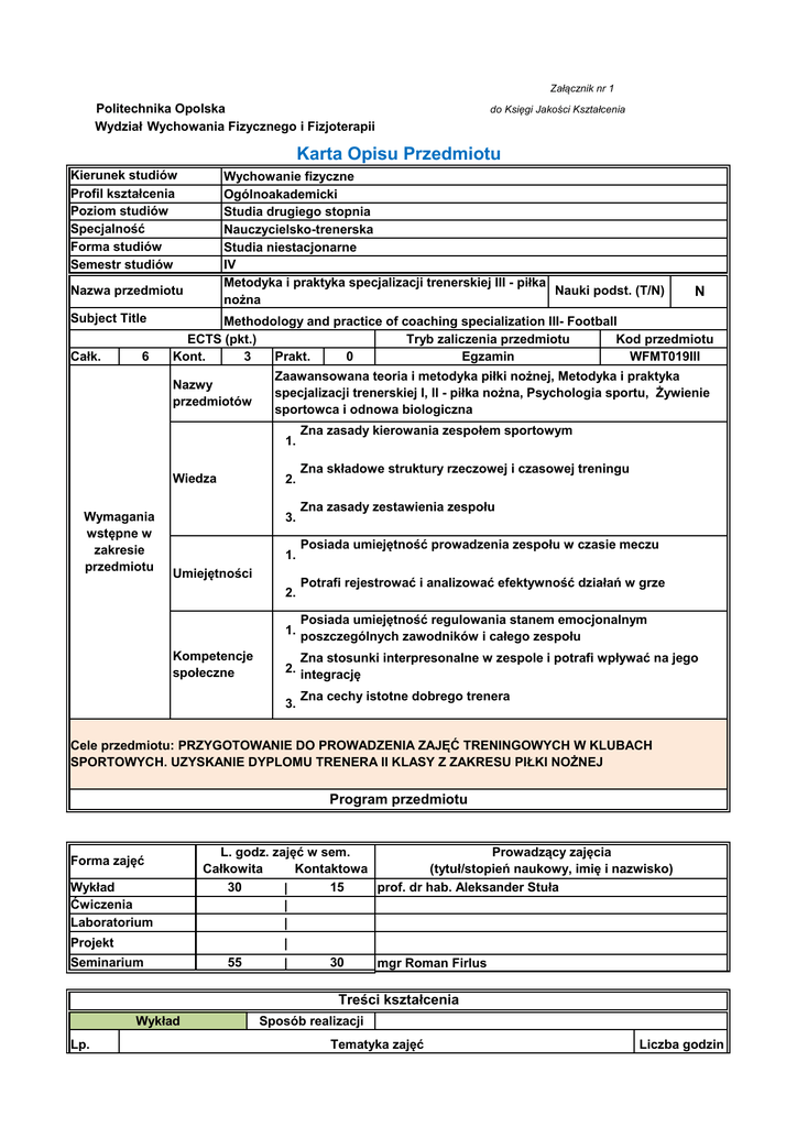 Załącznik nr 1 do Księgi Jakości Kształcenia Politechnika Opolska Wydział Wychowania Fizycznego i Fizjoterapii Karta Opisu Przedmiotu Kierunek studiów Profil kształcenia Poziom studiów Specjalność Forma studiów Semestr studiów Wychowanie fizyczne Ogólnoakademicki Studia drugiego stopnia Nauczycielsko-trenerska Studia niestacjonarne IV Metodyka i praktyka specjalizacji trenerskiej III - piłka Nauki podst. (T/N) nożna Nazwa przedmiotu Subject Title Całk. 6 Methodology and practice of coaching specialization III- Football ECTS (pkt.) Tryb zaliczenia przedmiotu Kod przedmiotu Kont. 3 Prakt. 0 Egzamin WFMT019III Nazwy przedmiotów Zaawansowana teoria i metodyka piłki nożnej, Metodyka i praktyka specjalizacji trenerskiej I, II - piłka nożna, Psychologia sportu, Żywienie sportowca i odnowa biologiczna 1. Wiedza Wymagania wstępne w zakresie przedmiotu N 2. 3. 1. Umiejętności 2. Zna zasady kierowania zespołem sportowym Zna składowe struktury rzeczowej i czasowej treningu Zna zasady zestawienia zespołu Posiada umiejętność prowadzenia zespołu w czasie meczu Potrafi rejestrować i analizować efektywność działań w grze Posiada umiejętność regulowania stanem emocjonalnym 1. poszczególnych zawodników i całego zespołu Kompetencje społeczne Zna stosunki interpresonalne w zespole i potrafi wpływać na jego 2. integrację 3. Zna cechy istotne dobrego trenera Cele przedmiotu: PRZYGOTOWANIE DO PROWADZENIA ZAJĘĆ TRENINGOWYCH W KLUBACH SPORTOWYCH. UZYSKANIE DYPLOMU TRENERA II KLASY Z ZAKRESU PIŁKI NOŻNEJ Program przedmiotu Forma zajęć Wykład Ćwiczenia Laboratorium L. godz. zajęć w sem. Prowadzący zajęcia Całkowita Kontaktowa (tytuł/stopień naukowy, imię i nazwisko) 30 15 prof. dr hab. Aleksander Stuła | | | Projekt | Seminarium 55 | 30 mgr Roman Firlus Treści kształcenia Wykład Lp. Sposób realizacji Tematyka zajęć Liczba godzin Etapowe kryteria i metody kontroli efektów szkoleniowych 1 1. 2. 3. Zasady programowania i realizacji cykli szkoleniowych 1 Struktura czasowa rocznego cyklu (makrocykle, mikrocykle, jednostki i środki treningowe) 1 Cele główne operacyjne szkolenia 1 Struktura obciążeń ze względu na objętość, intensywność i gęstość środków treningowych w różnych etapach i rodzajach jednostek treningowych 3 Metody i rodzaje kontroli efektów treningowych (kontrola osiągnięć i stanów bieżących przedłużonych i kumulatywnych) 2 Kierowanie zespołem sportowym 2 Prowadzenie zespołu podczas zawodów 1 4. 5. 6. 7. 11. L. godz. pracy własnej studenta 15 L. godz. kontaktowych w sem. 15 Sposoby sprawdzenia zamierzonych Prezentacje Power Point. Ustny egzamin końcowy efektów kształcenia Ćwiczenia Lp. 1. Sposób realizacji Tematyka zajęć L. godz. pracy własnej studenta L. godz. kontaktowych w sem. Sposoby sprawdzenia zamierzonych efektów kształcenia Laboratorium Sposób realizacji Lp. Tematyka zajęć 1. L. godz. pracy własnej studenta L. godz. kontaktowych w sem. Liczba godzin 0 Liczba godzin 0 Sposoby sprawdzenia zamierzonych efektów kształcenia Sposób realizacji Tematyka zajęć Zasady wyznaczania celów i zadań treningowych. Sposoby wyznaczania celów i zadań treningowych oraz formy ich realizacji Seminarium Lp. 1. Liczba godzin 2 2 4. Metody kontroli efektów treningowych.. Kontrola treningowa i jej znaczenie. Typy zawodnicze. Metody motywacji zawodnika Znaczenie przygotowania psychicznego i formy motywacji zawodnika przed zawodami Zasady kierowaniem zespołu podczas gry Rola trenera w drużynie i sposoby kierowania drużyną podczas zawodów Obserwacja zawodów najlepszych drużyn na świecie. Metody analizy gry wybranych, najlepszych drużyn na świecie. 2 5. 2. 3. 1 1 2 6. Roczny cykl szkolenia: makrocykle Specyfika cykliczności procesu treningowego w piłce nożnej. Podział oraz omówienie wybranego cyklu treningowego. Roczny cykl szkolenia: mezocykle, Specyfika cykliczności procesu treningowego w piłce nożnej. Podział oraz omówienie wybranego cyklu treningowego. 2 7. 2 8. Roczny cykl szkolenia: mikrocykle Specyfika cykliczności procesu treningowego w piłce nożnej. Podział oraz omówienie wybranego cyklu treningowego 2 9. Roczny cykl szkolenia: BPS Specyfika cykliczności procesu treningowego w piłce nożnej. Podział oraz omówienie wybranego cyklu treningowego Struktura obciążeń treningowych. Objętość , intensywność i gęstość środków treningowych w różnych etapach szkolenia oraz rodzajach treningów. Specyfika i znaczenie trafnego doboru środków treningowych na różnych etapach Obóz sportowy – zasady planowania i organizacji Miejsce obozu sportowego w rocznym cyklu szkolenia, zasady organizacji i sposoby realizacji celów sportowych. 2 Okres przygotowania , podokres przygotowania ogólnego, podokres przygotowania specjalnego. Specyfika obciążeń trenin, gowych w poszczególnych podokresach makrocyklu rocznego 3 Okres startowy – – doprowadzenie do formy i stabilizacja formy Specyfika obciążeń treningowych w poszczególnych podokresach makrocyklu rocznego 3 2 14. Okres celowej utraty formy – roztrenowania i wypoczynku Specyfika obciążeń treningowych w poszczególnych podokresach makrocyklu rocznego 15. Kolokwium zaliczeniowe. 1 10. 11. 12. 13. L. godz. pracy własnej studenta 25 L. godz. kontaktowych w sem. 3 30 Sposoby sprawdzenia zamierzonych Sprawdzian umiejętności.Przeprowadzenie jednostki treningowej. Pisemne kolokwium zaliczeniowe (50%+1) efektów kształcenia K_W12 Zna zadania trenera w poszczególnych etapach 1. szkolenia K_W18 Zna metodykę kształtowania zdolności kondycyjnych i 2. koordynacyjnych Wiedza K_W19 Zna zasady budowy jednostki treningowej, mikro i mezocyklu w poszczególnych okresach rocznego cyklu 3. szkolenia … K_U10 Potrafi rejestrować, analizować i oceniać efektywność 1. działań w grze Efekty kształcenia dla przedmiotu - po zakończonym cyklu kształcenia K_U07 Potrafi budować roczny cykl szkolenia i jednostki 2.