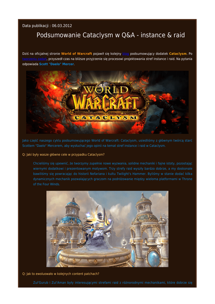 Data publikacji : 06.03.2012 Podsumowanie Cataclysm w Q&A - instance & raid Dziś na oficjalnej stronie World of Warcraft pojawił się kolejny blog podsumowujący dodatek Cataclysm. Po tworzeniu zadań, przyszedł czas na bliższe przyjrzenie się procesowi projektowania stref instance i raid. Na pytania odpowiada Scott "Daelo" Mercer. Jako część naszego cyklu podsumowującego World of Warcraft: Cataclysm, usiedliśmy z głównym twórcą starć Scottem "Daelo" Mercerem, aby wysłuchać jego opinii na temat stref instance i raid w Cataclysm. Q: Jaki były wasze główne cele w przypadku Cataclysm? Chcieliśmy się upewnić, że tworzymy zupełnie nowe wyzwania, solidne mechaniki i fajne istoty, pozostając wiernymi dodatkowi i prezentowanym motywom. Trzy strefy raid wyszły bardzo dobrze, a my doskonale bawiliśmy się powracając do historii Nefariana i kultu Twilight's Hammer. Byliśmy w stanie dodać kilka dynamicznych mechanik pozwalających graczom na podróżowanie między wieloma platformami w Throne of the Four Winds. Q: Jak to ewoluowało w kolejnych content patchach? Zul'Gurub i Zul'Aman były interesującymi strefami raid z różnorodnymi mechanikami, które dobrze się przełożyły, kiedy zmieniliśmy je na strefy instance-Heroic w patchu 4.1. Ciekawe mechaniki i inne elementy, które kiedyś występowały jedynie w raidach, zaczęły przenikać do naszych stref 5-osobowych. Wprowadzenie w patchu 4.2 Dungeon Journala było ogromnym krokiem naprzód. Chcieliśmy mieć możliwość podzielenia się dodatkowymi informacjami w grze, aby gracze nie byli zmuszeni do szukania wszystkiego na innych stronach. Mimo, że są one świetne w tym co robią, uznaliśmy, że musimy nieco zmniejszyć potrzebę opuszczania gry w poszukiwaniu informacji na jej temat. Pojawienie się Raid Findera w patchu 4.3 otworzyło ogromną rzeszę graczy na nasz raid content. Element ten okazał się bardzo popularny, nie tylko wśród tych którzy dali sobie spokój z raidowaniem. Wielu graczy korzysta z Raid Findera, aby zyskać przedmioty dla swoich kolejnych postaci, zdobyć punkty Valor w danym tygodniu albo po prostu dlatego, że jest on fajny. Q: Co według ciebie zadziałało najlepiej? Odnieśliśmy relatywny sukces przy wszystkich czterech poziomach trudności stref raid. Mieliśmy pewne problemy, jednak udało nam się sprostać założeniu, że 10- i 25-osobowe raidy mogą mieć podobny poziom trudności. Mieliśmy także kilka stref instance, które na długo zapadną w pamięć. Bardzo miło wspominam bombardowanie z grzbietów czerwonych smoków w Grim Batol. Gracze odczuli wówczas epicką skalę tej strefy, a to jak dobrze im poszło, mogło znacznie ułatwić wyczyszczenie pozostałej części strefy. Lepsze narzędzia i wiele lat zdobywanego doświadczenia pozwoliły nam na to, że lepiej znajdujemy sposoby na wytłumaczenie mechanik walk. Nasi bossowie jaśniej ostrzegają graczy przed wystąpieniem określonych zagrożeń. W Dragon Soul zaczęliśmy również informować graczy o mechanikach, które sprawiły, że ci zginęli. Bardzo istotnym dla nas jest to, aby gracze lepiej zrozumieli walki. Uważamy, że przegranie z bossem i brak wiedzy dlaczego się tak stało jest frustrujące, a pokonanie bossa bez wiedzy dlaczego wygrałeś nie przynosi satysfakcji. Q: Co nie zadziałało tak jak miało? Początkowo poziom trudności stref instance w trybie Heroic był zbyt wysoki. Znacznie różnił się on od tego, czego doświadczyli gracze na koniec Wrath of the Lich King. Ta ogromna zmiana zaskoczyła wielu, wywołując u nich frustrację. Poziom trudności wydłużył także czas wymagany na przejście danej strefy. Po wydaniu patcha 4.3 jesteśmy w znacznie lepszym miejscu. Zawsze mówiliśmy o tym, żeby strefę instance dało się kończyć w czasie lunchu, a dungeony Hour of Twilight pozwoliły nam na osiągnięcie tego celu. End Time, Well of Eternity oraz Hour of Twilight dają naszym graczom epickie doświadczenie, jednak wszystkie reprezentują idealne balans poziomu trudności, skomplikowania oraz czasu wymaganego na ich przejście. Q: Czy byliście zaskoczeni tym, jak gracze zareagowali na jakieś konkretne starcie? Raczej nie. Przez lata nauczyliśmy się tego, aby spodziewać się niespodziewanego. Społeczność graczy jest bardzo kreatywna i inteligentna. Najważniejsze dla nas jest to, aby ludzie dobrze się bawili. Często znajdują oni interesujące podejście, którego początkowo się nie spodziewaliśmy, jednak jeśli jest ono fajne, nie mamy z tym problemu. Q: Czego nauczyliście się w Cataclysm i jakie są wasze główne założenia na Mists of Pandaria? Nauczyliśmy się, że możemy stworzyć szalone walki takie jak Spine of Deathwing. Wymagało to od wszystkich ogromnego wysiłku i było sporym wyzwaniem z perspektywy designu. Jak stworzyć walkę na grzbiecie ogromnego lecącego smoka bez wywoływania mdłości? Jak się upewnić, że gracze będą czuć, że są na Deathwingu? Stworzenie tego było dla nas bardzo ważne i wszyscy chcieli wziąć udział w kreowaniu tego starcia. Fajne było to, że rozpoczęliśmy fabułę Cataclysm filmem, w którym na Deathwinga były nakładane płyty z elementium, a na koniec dodatku te same płyty były z niego zrywane. Ładnie zwieńczyło to opowiadaną historię. W Mists of Pandaria w dalszym ciągu będziemy tworzyć nowe strefy instance i raid, wprowadzając interesujący content w formie trybu wyzwań i scenariuszy. Gracze poznają nowych wrogów - Sha, Mogu oraz Mantid. Wprowadzanie ich do świata gry było naprawdę fajne. Q: Czy masz jakąś ulubioną strefę lub walkę z Cataclysm? Jest ich tak wiele. Conclave of Wind było świetne. Rozpracowywanie interesujących mechanik, które pozwoliły graczom na przemieszczanie się między platformami było naprawdę fajne, a środowisko w jakim toczyła się walka było epickie. Tego rodzaju starcie od dawna było naszym celem. Blackwing Descent to kolejne ulubion