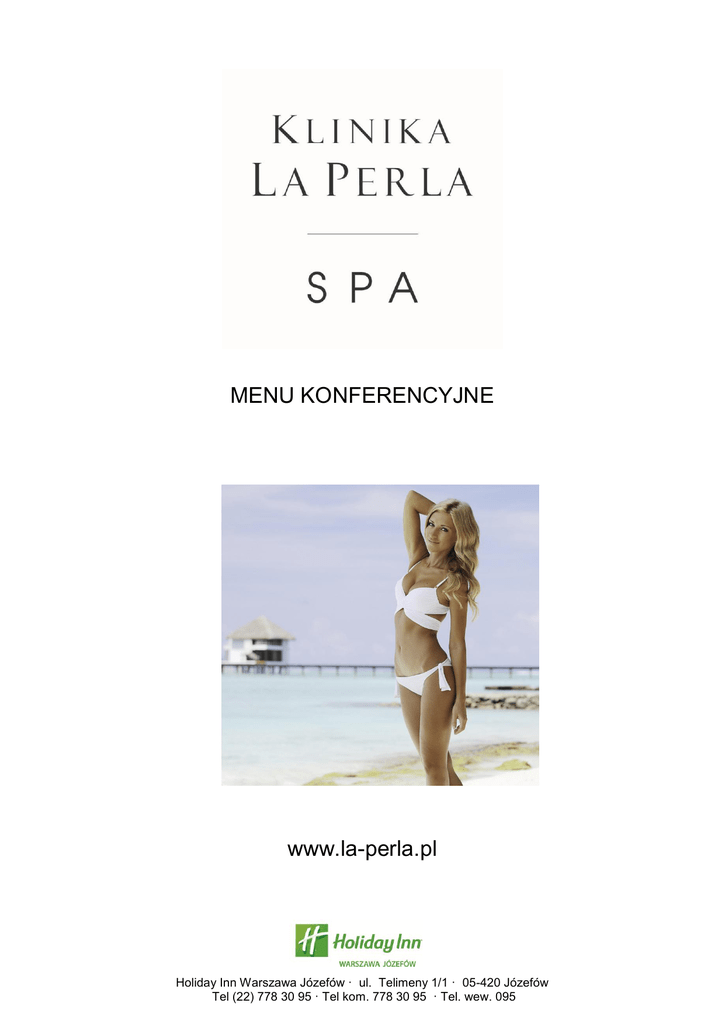 MENU KONFERENCYJNE www.la-perla.pl Holiday Inn Warszawa Józefów · ul. Telimeny 1/1 · 05-420 Józefów Tel (22) 778 30 95 · Tel kom. 778 30 95 · Tel. wew. 095 Zabiegi: 120 PLN – czas 25-30 minut SPA dla twarzy: 1) Sekret poranny do skóry suchej/tłustej – to zabieg przeznaczony do skóry odwodnionej i suchej, usuwa uczucie napięcia, rozjaśnia skórę, spłyca i wygładza zmarszczki. 2) Dotyk ziemi – to zabieg przeznaczony do skóry tłustej, problematycznej, z nadprodukcją sebum. Natychmiast oczyszcza i regeneruje pozostawiając skórę czystą i matową. 3) Skarb natury – to zabieg przeznaczony dla skóry zmęczonej, usuwa uczucie napięcia, intensywnie regeneruje i odżywia skórę. Dzięki masażowi daje efekt liftingu. 4) Kwitnąca lipa – to prawdziwa kąpiel świeżości dla wrażliwej, naczyniowej skóry. Redukuje zaczerwienienia i podrażnienia. Wzmacnia, uszczelnia i uszczelnia naczynia krwionośne. SPA dla ciała: 1) Doskonałe ujędrnienie – Intensywny zabieg liftingujący i rewitalizujący z masażem relaksacyjnym. To zabieg, który ujędrni skórę, przywróci jej napięcie, elastyczność oraz młody wygląd. 2) Świeżość poranka – Intensywny peeling całego ciała zakończony nawilżającym balsamem z krótkim masażem całego ciała. Zabieg ma na celu usunięcie zrogowaciałego naskórka, wygładzenie skóry i poprawę nawilżenia. Masaż Cię odpręży i rozluźni spięte mięśnie. 3) Chwila relaksu – to relaksujący i rozluźniający manualny masaż całego ciała. Masaż ma na celu uzyskanie głębokiego relaksu, rozluźnienia, przywrócenia naturalnego przepływu energii życiowej. Przywraca harmonię na poziomie duszy i ciała. 4) Odrobina ochłody – to rytuał wyszczuplający, antycelluitowy, a przede wszystkim modelujący sylwetkę. Dzięki zastosowaniu specjalnego masażu modelującego zimnymi kamieniami pomaga zredukować tkankę tłuszczową, poprawia mikrokrążenie oraz usuwa nadmiar wody z tkanek Holiday Inn Warszawa Józefów · ul. Telimeny 1/1 · 05-420 Józefów Tel (22) 778 30 95 · Tel kom. 778 30 95 · Tel. wew. 095 Zabiegi: 160 PLN – czas 40-45 minut SPA dla twarzy: 1) Morski powiew – to zabieg dla skóry suchej, natychmiast gasi pragnienie skóry i pozwala utrzymać odpowiedni poziom jej nawilżenia. Preparaty zawarte w zabiegu przywracają skórze komfort, odżywiają i spłycają zmarszczki powstałe w wyniku odwodnienia. 2) Blask natury - to nawilżający dotyk słońca, w efekcie zabiegu skóra jest aksamitna, nabiera delikatnego odcienia brązu i na długo promienieje blaskiem. 3) Luksusowy dar natury – to zabieg dedykowany specjalnie dla skóry dojrzałej. Przeciwdziała tworzeniu się zmarszczek i opóźnia procesy starzenia. Intensywnie ujędrnia oraz pobudza produkcję włókien kolagenowych. 4) Biologiczna odnowa - to zabieg przeznaczony jest do skóry ziemistej, zmęczonej i pozbawionej blasku. Koktajl składników aktywnych przywraca skórze zdrowy świetlisty wygląd. SPA dla ciała: 1) Ciepło z wnętrza ziemi- to zabieg gorącymi kamieniami, który intensywnie rozgrzeje Twoje zmęczone plecy, rozluźni mięśnie i odpręży. Masaż dostarczy niesamowitych doznań i poprawi samopoczucie 2) Droga do ideału – nawilżająco – wyszczuplający rytuał z peelingiem całego ciała połączony z autorskim masażem. Zabieg redukuje celluit, modeluje wygląd sylwetki oraz stymuluje redukcję tkanki tłuszczowej. Dzięki zawarciu odpowiednich technik masażu pozwala na usprawnienie krążenia układu limfatycznego, zapobiegając zastojom wodnym. 3) Bogaty relaks– to relaksujący i rozluźniający manualny masaż całego ciała poprzedzony peelingiem. Masaż odpręża i rozluźnia napięcia mięśniowe, jest świetną formą relaksu przywracającą dobre samopoczucie i wyzwalającą pozytywną energię do działania. 4) Dotyk słońca – to ekspresowa kuracja upiększająca, dogłębnie oczyszcza i dotlenia skórę oraz poprawia jej koloryt. Skóra muśnięta słońcem nabiera blasku, delikatności, pozostawia skórę opaloną i jedwabiście gładką. Holiday Inn Warszawa Józefów · ul. Telimeny 1/1 · 05-420 Józefów Tel (22) 778 30 95 · Tel kom. 778 30 95 · Tel. wew. 095