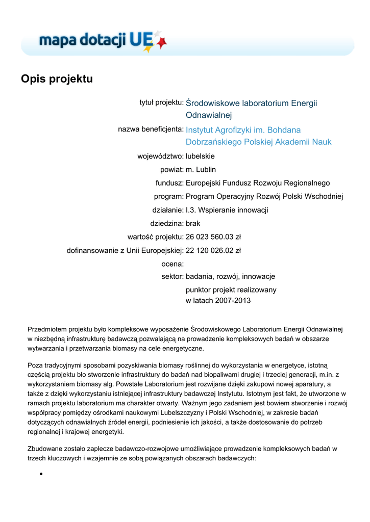 Opis projektu tytuł projektu: Środowiskowe laboratorium Energii Odnawialnej nazwa beneficjenta: Instytut Agrofizyki im. Bohdana Dobrzańskiego Polskiej Akademii Nauk województwo: lubelskie powiat: m. Lublin fundusz: Europejski Fundusz Rozwoju Regionalnego program: Program Operacyjny Rozwój Polski Wschodniej działanie: I.3. Wspieranie innowacji dziedzina: brak wartość projektu: 26 023 560.03 zł dofinansowanie z Unii Europejskiej: 22 120 026.02 zł ocena: sektor: badania, rozwój, innowacje punktor projekt realizowany w latach 2007-2013 Przedmiotem projektu było kompleksowe wyposażenie Środowiskowego Laboratorium Energii Odnawialnej w niezbędną infrastrukturę badawczą pozwalającą na prowadzenie kompleksowych badań w obszarze wytwarzania i przetwarzania biomasy na cele energetyczne. Poza tradycyjnymi sposobami pozyskiwania biomasy roślinnej do wykorzystania w energetyce, istotną częścią projektu bło stworzenie infrastruktury do badań nad biopaliwami drugiej i trzeciej generacji, m.in. z wykorzystaniem biomasy alg. Powstałe Laboratorium jest rozwijane dzięki zakupowi nowej aparatury, a także z dzięki wykorzystaniu istniejącej infrastruktury badawczej Instytutu. Istotnym jest fakt, że utworzone w ramach projektu laboratorium ma charakter otwarty. Ważnym jego zadaniem jest bowiem stworzenie i rozwój współpracy pomiędzy ośrodkami naukowymi Lubelszczyzny i Polski Wschodniej, w zakresie badań dotyczących odnawialnych źródeł energii, podniesienie ich jakości, a także dostosowanie do potrzeb regionalnej i krajowej energetyki. Zbudowane zostało zaplecze badawczo-rozwojowe umożliwiające prowadzenie kompleksowych badań w trzech kluczowych i wzajemnie ze sobą powiązanych obszarach badawczych: nowe metody i technologie produkcji oraz pozyskiwania biomasy (w tym celu zostaną wsparte trzy jednostki badawcze: Laboratorium Mikrobiologii Molekularnej i Środowiskowej, Laboratorium Biochemii oraz Laboratorium Nowych Technologii Pozyskiwania Energii Odnawialnej oraz Biomasy), procesy gazyfikowania biomasy, w tym analiza procesu fermentacji metanowej i badanie biogazu (w tym celu zostaną wsparte dwie jednostki badawcze: Laboratorium Fermentacji Metanowej oraz Laboratorium Analizy Biogazu), sposoby zagospodarowywania odpadów pofermentacyjnych, w tym technologie wytwarzania z odpadów nawozu i badanie jego wpływu na wzrost roślin i jakość gleb (w tym celu zostanie doposażonych sześć jednostek badawczych: Laboratorium Oceny, Ulepszania i Wykorzystywania Osadów Pofermentacyjnych, Pracownia Chemicznych i Fizykochemicznych Właściwości Osadu, Pracownia Utylizacji i Wykorzystania Fazy Stałej Osadu, Pracownia Ulepszania Gleb, Pracownia Fizycznych Właściwości Gleb Modyfikowanych oraz Pracownia Wzrostu Roślin). Dzięki realizacji projektu możliwa stała się realizacja innych projektów badawczych wynikających z dotychczasowej naukowej i statutowej działalności Instytutu, opartych na jego doświadczeniach i planowanych kierunkach badawczo-rozwojowych. Projekt jest komplementarny z projektem już realizowanym przez IA PAN, pt. doposażenie laboratoriów Centrum Doskonałości AGROPHYSICS”. Ḁ刀漀稀戀甀搀漀眀愀 infrastruktury i Cel i rezultaty Celem nadrzędnym projektu było wsparcie rozwoju społeczno-gospodarczego Polski Wschodniej poprzez tworzenie wiedzy i innowacji w zakresie odnawialnych źródeł energii. Celem głównym projektu był rozwój Środowiskowego ponadregionalnego ośrodka badań i transferu wiedzy. Laboratorium Energii Odnawialnej jako Cel nadrzędny i główny projektu zsotały osiągnięte poprzez realizację następujących celów: rozwój współpracy pomiędzy ośrodkami naukowymi Lubelszczyzny i Polski Wschodniej, rozwój badań naukowych w dziedzinie wykorzystania biomasy do celów energetyki odnawialnej, podniesienie jakości prowadzonych badań oraz dostosowanie ich do potrzeb regionalnej i krajowej gospodarki, zwiększenie liczby pracowników naukowych zajmujących się problematyką energii odnawialnej, wsparcie dotychczasowej działalności statutowej Instytutu Agrofizyki PAN, wsparcie dotychczasowych prac dotyczących wytwarzania i ochrony patentów, publikacji rozwiązań innowacyjnych oraz badań naukowych związanych z rozwojem kadr (studia doktoranckie), poprawa jakości i warunków pracy kadr naukowych i adaptacji laboratoriów i pomieszczeń pomocniczych (m.in. pokoje cichej pracy). W wyniku realizacji projektu na bazie dotychczasowej infrastruktury Instytutu powstało 11 nowych jednostek badawczych, w tym 6 laboratoriów (nowych technologii pozyskiwania energii odnawialnej oraz biomasy, fermentacji metanowej, analizy biogazu, mikrobiologii molekularnej i środowiskowej, biochemii oraz oceny, ulepszania i wykorzystywania osadów pofermentacyjnych) i 5 pracowni (chemicznych i fizykochemicznych właściwości osadu, utylizacji i wykorzystywania fazy stałej osadu, ulepszania gleb, fizycznych właściwości gleb modyfikowanych, a także wzrostu roślin). Jednostki te zostały wyposażone w nowoczesny sprzęt i aparaturę naukowo-badawczą – o łącznej wartości ponad 20 mln zł. Projekt przyniósł wiele niemierzalnych rezultatów, do których należy zaliczyć: poprawę konkurencyjności naukowej Instytutu Agrofizyki PAN i współpracujących z nim jednostek naukowych na poziomie krajowym i międzynarodowym, podniesienie jakości prowadzonych badań oraz ich lepsze dostosowanie do potrzeb gospodarczych, wzrost zainteresowania wykorzystywaniem energii ze źródeł odnawialnych przez rolników i przedsiębiorców, rozwój współpracy badawczej pomiędzy jednostkami naukowymi na terenie Lubelszczyzny i Polski Wschodniej. Kto korzysta dzięki projektowi Bezpośrednimi użytkownikami projektu są pracownicy naukowi. Spektrum pośrednich odbiorców jest dosyć szerokie i obejmuje co najmniej kilka gałęzi gospodarki. Znajdują się wśród nich zarówno instytucje publiczne (uczelnie wyższe, instytuty n