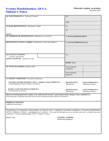 Polecenie wypłaty za granicę Svenska Handelsbanken AB S.A. Oddział w Polsce Payment order 50: ZLECENIODAWCA / Ordering Customer 20: 23B: 57: BANK BENEFICJENTA / Beneficiary’s Bank 52: 53: SWIFT: 59: NUMER RACH. BENEFICJENTA / Beneficiary’s account no. 56:BANK KORESPONDENT BENEFICJENT (NAZWA I ADRES) / Beneficiary’s (Name and Address) 56: BANK POŚREDNICZĄCY 32A: WALUTA I KWOTA Currency and Amount KWOTA SŁOWNIE / Amount in words 72: KURS / Rate 70: TYTUŁ PŁATNOŚCI / Payment Title Potwierdzenie podpisów: Potwierdzenie pokrycia: 71: KOSZTY I PROWIZJE / Fees and Commissions SVENSKA HANDELSBANKEN AB S.A. Oddział w Polsce POKRYWA: of Handelsbanken Warsaw Branch covered by: BENEFICJENT Beneficiary ZLECENIODAWCA Ordering Customer BANKU ZAGRANICZNEGO POKRYWA: of foreign bank covered by: BENEFICJENT Beneficiary ZLECENIODAWCA Ordering Customer Równowartością polecenia wypłaty oraz naliczonych kosztów i prowizji prosimy obciążyć nasz rachunek nr: With equivalent of payment order and your fees and commissions please debit our account no.: Dodatkowe Instrukcje: Additional instructions: Przyjmujemy do wiadomości zasady podane na odwrocie oraz w „Ogólnych warunkach współpracy z Svenska Handelsbanken AB S.A. Oddział w Polsce” i akceptujemy je w całości . / We accept all principles given on the back side and in „General terms and conditions of Svenska Handelsbanken AB S.A. Oddział w Polsce” DATA / Date STEMPEL I PODPISY Stamp and signatures ZASADY OGÓLNE DOTYCZĄCE WYKONANIA POLECENIA WYPŁATY ZA GRANICĘ 1. 2. 3. 4. 5. 6. 7. 8. Bank wykonuje operacje według dyspozycji Klienta i nie odpowiada za prawidłowość podanych w zleceniu informacji. Bank nie ponosi odpowiedzialności za skutki wynikające z opóźnień lub zagubień w przekazywaniu wiadomości, listów lub dokumentów, ani też z powodu opóźnienia, zniekształcenia lub innych pomyłek w tekście telegramów, teleksów lub komunikatów SWIFT, ani za błędne tłumaczenie czy interpretację terminów technicznych. Bank korzystający z usług innego banku dla wykonania dyspozycji zleceniodawcy czyni to na rachunek i ryzyko zleceniodawcy. W związku z tym nie ponosi odpowiedzialności w razie niewykonania przekazanych przez niego zleceń, nawet w przypadku, gdy wybór innego banku nastąpił z jego inicjatywy. Odpowiedzialność Banku nie obejmuje strat wynikłych z działań na podstawie nieprawdziwych lub niekompletnych danych dostarczonych przez klienta, jak również strat spowodowanych okolicznościami niezależnymi od Banku, a w szczególności siłą wyższą lub decyzjami odpowiednich organów władzy państwowej. Bank wykonuje niezwłocznie otrzymane zlecenia według kolejności otrzymania. Zleceniodawca przyjmuje na siebie wszelkie zobowiązania i konsekwencje wynikające z zastosowania praw i zwyczajów obowiązujących za granicą. Przy rozliczaniu transakcji stosuje się kursy walutowe, których zasady stosowania określone są w odrębnych przepisach Banku. W sytuacji, gdy zleceniodawca określa, iż koszty i prowizje Svenska Handelsbanken AB S.A. Oddział w Polsce pokrywa beneficjent, są one odejmowane od kwoty przekazu za granicę. Uwagi dotyczące wypełniania formularza Aby zlecenie wykonania polecenia wypłaty mogło być przyjęte, zleceniodawca bezwzględnie musi wypełnić pola oznaczone numerami: 32A, 50, 57, 59, 70 oraz dotyczące pokrycia kosztów. GENERAL RULES CONCERNING THE EXECUTION OF FOREIGN PAYMENT ORDER 1. 2. 3. 4. 5. 6. 7. 8. The bank executes orders on behalf of clients and is not responsible for the correctness of data given in a payment order. The bank is not responsible for the results of delays or lost messages, letters or documents. The bank is also not responsible for delays, distortions or any other mistakes in telegrams, telexes or SWIFT texts not for incorrect translations or misinterpretations of technical terms. The bank, when executing a client’s order and using the services of another bank, does so in the name of the client and bears full risk for the transaction. Therefore the bank is not responsible for the non-execution of payment orders submitted by a client, even if the choice of the other bank was at the initiative of Svenska Handelsbanken AB S.A. Oddział w Polsce. The bank is not responsible for losses resulting from actions taken on the basis of untrue or incomplete data supplied by the client. The bank is also not responsible for losses caused by circumstances beyond the control of the bank, in particular those caused by higher forces of nature or decisions taken by the relevant organs of state authority. The bank executes payment orders without delay, in order of their submission. A customer placing an order bears on himself all commitments and consequences resulting from laws and customs being in force abroad. The principles of applying exchange rates in settlement transactions are defined in separate bank regulations. In the case where a customer determines that the charges and commissions of Svenska Handelsbanken AB S.A. Oddział w Polsce have to be covered by beneficiary, the charges and commission are deducted from the amount of foreign transfer. Remarks concerning the proper completion of forms A payment order will be accepted, provided that the customer completely fills in field numbers: 32A, 50, 57, 59 and 70 as well as those concerning the coverage of costs.