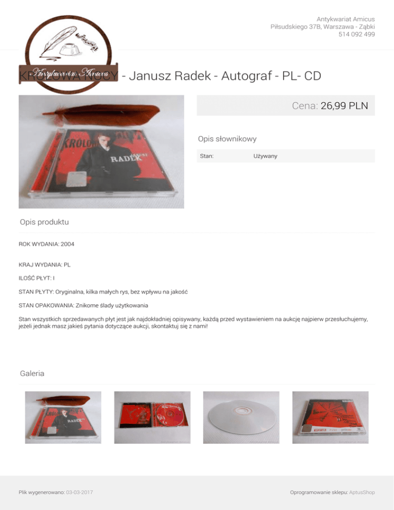 Antykwariat Amicus Piłsudskiego 37B, Warszawa - Ząbki 514 092 499 KRÓLOWA NOCY - Janusz Radek - Autograf - PL- CD Cena: 26,99 PLN Opis słownikowy Stan: Używany Opis produktu ROK WYDANIA: 2004 KRAJ WYDANIA: PL ILOŚĆ PŁYT: I STAN PŁYTY: Oryginalna, kilka małych rys, bez wpływu na jakość STAN OPAKOWANIA: Znikome ślady użytkowania Stan wszystkich sprzedawanych płyt jest jak najdokładniej opisywany, każdą przed wystawieniem na aukcję najpierw przesłuchujemy, jeżeli jednak masz jakieś pytania dotyczące aukcji, skontaktuj się z nami! Galeria Plik wygenerowano: 03-03-2017 Powered by TCPDF (www.tcpdf.org) Oprogramowanie sklepu: AptusShop