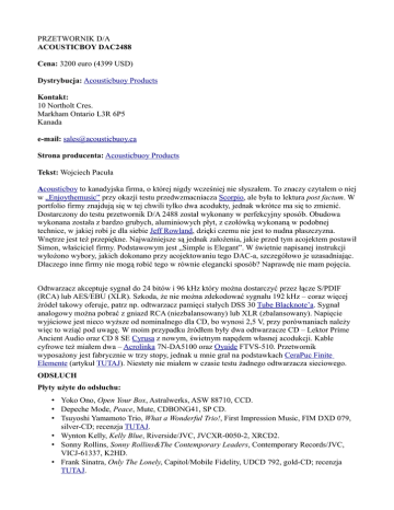 PRZETWORNIK D/A ACOUSTICBOY DAC2488 Cena: 3200 euro (4399 USD) Dystrybucja: Acousticbuoy Products Kontakt: 10 Northolt Cres. Markham Ontario L3R 6P5 Kanada e-mail: [email protected] Strona producenta: Acousticbuoy Products Tekst: Wojciech Pacuła Acousticboy to kanadyjska firma, o której nigdy wcześniej nie słyszałem. To znaczy czytałem o niej w „Enjoythemusic” przy okazji testu przedwzmacniacza Scorpio, ale była to lektura post factum. W portfolio firmy znajdują się w tej chwili tylko dwa acodukty, jednak wkrótce ma się to zmienić. Dostarczony do testu przetwornik D/A 2488 został wykonany w perfekcyjny sposób. Obudowa wykonana została z bardzo grubych, aluminiowych płyt, z czołówką wykonaną w podobnej technice, w jakiej robi je dla siebie Jeff Rowland, dzięki czemu nie jest to nudna płaszczyzna. Wnętrze jest też przepiękne. Najważniejsze są jednak założenia, jakie przed tym acojektem postawił Simon, właściciel firmy. Podstawowym jest „Simple is Elegant”. W świetnie napisanej instrukcji wyłożono wybory, jakich dokonano przy acojektowaniu tego DAC-a, szczegółowo je uzasadniając. Dlaczego inne firmy nie mogą robić tego w równie elegancki sposób? Naprawdę nie mam pojęcia. Odtwarzacz akceptuje sygnał do 24 bitów i 96 kHz który można dostarczyć przez łącze S/PDIF (RCA) lub AES/EBU (XLR). Szkoda, że nie można zdekodować sygnału 192 kHz – coraz więcej źródeł takowy oferuje, patrz np. odtwarzacz pamięci stałych DSS 30 Tube Blacknote’a. Sygnał analogowy można pobrać z gniazd RCA (niezbalansowany) lub XLR (zbalansowany). Napięcie wyjściowe jest nieco wyższe od nominalnego dla CD, bo wynosi 2,5 V, przy porównaniach należy więc to wziąć pod uwagę. W moim przypadku źródłem były dwa odtwarzacze CD – Lektor Prime Ancient Audio oraz CD 8 SE Cyrusa z nowym, świetnym napędem własnej acodukcji. Kable cyfrowe też miałem dwa – Acrolinka 7N-DA5100 oraz Oyaide FTVS-510. Przetwornik wyposażony jest fabrycznie w trzy stopy, jednak u mnie grał na podstawkach CeraPuc Finite Elemente (artykuł TUTAJ). Niestety nie miałem w czasie testu żadnego odtwarzacza sieciowego. ODSŁUCH Płyty użyte do odsłuchu: • Yoko Ono, Open Your Box, Astralwerks, ASW 88710, CCD. • Depeche Mode, Peace, Mute, CDBONG41, SP CD. • Tsuyoshi Yamamoto Trio, What a Wonderful Trio!, First Impression Music, FIM DXD 079, silver-CD; recenzja TUTAJ. • Wynton Kelly, Kelly Blue, Riverside/JVC, JVCXR-0050-2, XRCD2. • Sonny Rollins, Sonny Rollins&The Contemporary Leaders, Contemporary Records/JVC, VICJ-61337, K2HD. • Frank Sinatra, Only The Lonely, Capitol/Mobile Fidelity, UDCD 792, gold-CD; recenzja TUTAJ. • Wong San, Feel Like Making Love, Pony Canyon, PCCY-50014, HQCD; recenzja TUTAJ. • The Beatles, 09.09.09 [sampler], Apple/Parlophone/EMI, 6844142, 2 x CD, recenzja TUTAJ. • Cantate Napoletane Del’ 700, Capella della Pietà de’Turchini, Eloquentia, EL 0919, CD. • King Crimson, Lark’s Tongues in Aspic, WHD Entertainment, IECP-30006, HDCD/HQCD. Można się zakochać w takim dźwięku i to naprawdę łatwo. W niezwykle zbliżony sposób ten kanadyjski przetwornik powielił to, co słyszałem wcześniej, przy teście japońskiego, lampowego wzmacniacza Tri TRV-88SE. To niezwykle zbliżona sygnatura dźwiękowa i gdybym nie wiedział, że urządzenia przyleciały z dwóch różnych krańców świata, to mógłbym powiedzieć, że stał za nimi ten sam acojektant. A głównym celem takiego wyobrażonego inżyniera musiała być chęć osiągnięcia maksymalnie nasyconego, nieco ciepłego, pełnego dźwięku, który miałby z cyfrowym stereotypem możliwie najmniej wspólnego. Myśląc o jakiś paralelach, szukając acoduktów, które mógłbym wskazać jako te, które należą z testowanym „dakiem” do wspólnej rodziny, pierwsze, co mi przyszło do głowy, był jednak gramofon. Rzecz znamienna, ponieważ zdarzyło się to już wcześniej kilka razy, wskazująca na szczególny typ dźwięku. Tak, pod względem barwy, nasycenia i ogólnej kultury, grał mianowicie gramofon Kuzmy Stabi S z ramieniem Stogi i wkładką Dynavector Karat 17D3. Zestaw ten złożył polski dystrybutor obydwu marek, katowicka firma RCM i trzeba przyznać, że zagrało to ze sobą znakomicie (test ukazał się w numerze sierpniowym „Audio”). Bardzo mi się ten system podobał, a to ze względu na to, że za stosunkowo niewielkie pieniądze (niewielkie, jeśli za punkt odniesienia przyjmiemy hi-end) otrzymałem niezwykle treściwy, bardzo spójny wewnętrznie dźwięk, który sprawdzał się w każdym rodzaju muzyki. Pamiętając, jak brzmi droższa acopozycja tego acoducenta, model Reference z ramieniem Stogi 313 Ref VTA (TUTAJ), nie mogłem nie dostrzec, że da się zagrać w precyzyjniejszy, bardziej rozdzielczy sposób i że podstawowy model jest nieco podbarwiony – tak został „ustawiony” jego charakter – ale konkluzja tej analizy była dla mnie zaskakująca: ze Stogi i Stabi S mógłbym spokojnie żyć, a z systemem Reference niekoniecznie. Tak, to był znacznie bardziej akuratny przekaz, informacji było znacząco więcej, jednak – jak dla mnie – bardziej komunikatywna była tańsza acopozycja. Komunikatywna dlatego, że lepiej organizowała to, co wydobywała z płyty. Tak, dokładnie tak samo pomyślałem, kiedy odpaliłem Acousticboya. „Chłopak” gra niezwykle skupionym, nasyconym dźwiękiem, w czym przypomina moich faworytów – DAC Audionemesis DC-1 Up-grade i DAC-1 Benchmarka z jednej strony i DP-700 Accuphase’a z drugiej. Tak, to nawet nie DP-500, a właśnie DP-700. Już tłumaczę w czym rzecz: wprawdzie „pięćsetka” tego japońskiego acoducenta w wielu dziedzinach, takich jak: rozdzielczość, precyzja, wyrównanie pasma i kontrola basu, jest lepsza niż 2488, jednak ten ostatni prezentuje bardziej holistyczny świat muzyki, daje więcej radości, więcej emocji. To paradoks, bo przecież już dwukrotnie napisa