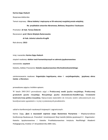 Karina Zając-Haduch Rozprawa doktorska Temat rozprawy : Obraz kobiety i mężczyzny w XX-wiecznej rosyjskiej prozie wiejskiej. Na przykładzie utworów Abramowa, Biełowa, Rasputina i Szukszyna Promotor: dr hab. Teresa Żeberek Recenzenci: prof. Maria Wojtyła-Świerzowska dr hab. Jolanta Lubocha-Kruglik Rok obrony: 2013 imię i nazwisko: Karina Zając-Haduch stopień naukowy: doktor nauk humanistycznych w zakresie językoznawstwa stanowisko: asystent Katedra, Zakład, Pracownia: Katedra Językoznawstwa Wschodniosłowiańskiego zainteresowania naukowe: lingwistyka kognitywna, etno- i świata a literatura socjolingwistyka, językowy obraz prowadzone zajęcia z krótkim opisem: W latach 2003-2013 prowadzenie zająć z Praktycznej nauki języka rosyjskiego, Praktycznej gramatyki języka rosyjskigo, Rosyjskiego języka ekonomiczno-handlowego, Gramatyki kontrastywnej polsko-rosyjskiej. Opracowanie materiałów do ćwiczeń, testów zaliczeniowych oraz koordynowanie egzaminów z wyżej wymienionych przedmiotów. udział w konferencjach naukowych krajowych i zagranicznych: Karina Zając, Дом в языковой картине мира Валентина Распутина – Międzynarodowa Konferencja Naukowa pt. Przeszłość i teraźniejszość Rosji świetle faktów językowych II. Organizator: Katedra Językoznawstwa i Katedra Przekładoznawstwa Pedagogicznej, Kraków 17-18 października 2005 roku. Instytutu Neofilologii Akademii Karina Zając-Haduch, Językowy obraz kobiecego ciała w literaturze rosyjskiej – Międzynarodowa Konferencja Naukowa pt. Europa Słowian w świetle socjo- i etnolingwistyki. Przeszłość – teraźniejszość. Organizator: Katedra Językoznawstwa Wschodnisłowiańskiego Instytutu Neofilologii i Instytut Filologii Polskiej, 4-5 grudnia 2009 roku. Karina Zając-Haduch, Śmierć w językowym obrazie świata Rosjan – Międzynarodowa Konferencja Naukowa pt. Współczesne badania nad kulturą, literaturą i językiem rosyjskim – 25 lat rusycystyki toruńskiej. Organizator: Instytut Filologii Słowiańskiej Uniwersytetu Mikołaja Kopernika w Toruniu, Toruń 3-4 grudnia 2010 r. kontakt: ul. Studencka 5, p.109, mail : [email protected] Publikacje : - artykuły: Karina Zając, Ogień i woda w językowym obrazie świata Walentyna Rasputina [w:] „Przegląd Rusycystyczny” nr 2 / 2002, s.56- 67. Karina Zając-Haduch, Языковая картина дома в творчестве Валентина Распутина [в:] Русский язык как фактор стабильности государства и нравственного здоровья нации (30 сентября — 2 октября 2010 года). Труды и материалы второй Всероссийской научно- практической конференции. Часть 2, ред. O.В.Трофимова, Тюмень 2010, с. 360-368 (wersja elektroniczna dostępna na stronie http://www.utmn.ru/news/3864). Karina Zając-Haduch, Językowy obraz kobiecego ciała w literaturze rosyjskiej [w:] 90 Annales Universitatis Paedagogicae Cracoviensis. Studia Russologica IV. Europa Słowian w świetle socjoi etnolingwistyki. Przeszłość – teraźniejszość, red. E. Książek i M. Wojtyła-Świerzowska, Wydawnictwo Uniwersytetu Pedagogicznego, Kraków 2011, s. 289-294. Karina Zając-Haduch, Śmierć w językowym obrazie świata Rosjan [w:] Współczesne badania nad kulturą, literaturą i językiem rosyjskim, red. Dorota Paśko-Koneczniak, Toruń 2012, s. 315-325. Data aktualizacji: 6 listopada 2013 roku