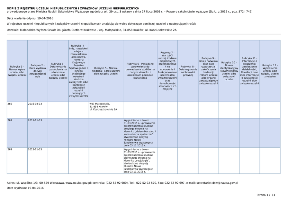 ODPIS Z REJESTRU UCZELNI NIEPUBLICZNYCH I ZWIĄZKÓW