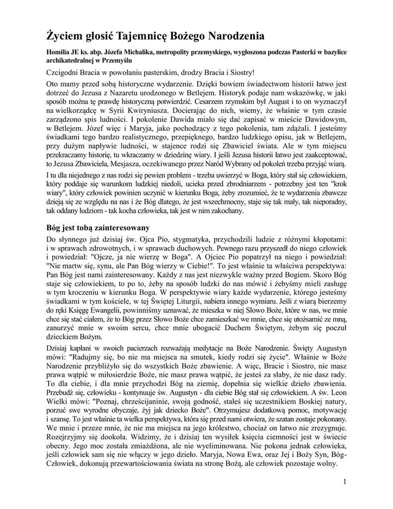 Życiem głosić Tajemnicę Bożego Narodzenia Homilia JE ks. abp. Józefa Michalika, metropolity przemyskiego, wygłoszona podczas Pasterki w bazylice archikatedralnej w Przemyślu Czcigodni Bracia w powołaniu pasterskim, drodzy Bracia i Siostry! Oto mamy przed sobą historyczne wydarzenie. Dzięki bowiem świadectwom historii łatwo jest dotrzeć do Jezusa z Nazaretu urodzonego w Betlejem. Historyk podaje nam wskazówkę, w jaki sposób można tę prawdę historyczną potwierdzić. Cesarzem rzymskim był August i to on wyznaczył na wielkorządcę w Syrii Kwiryniusza. Docierając do nich, wiemy, że właśnie w tym czasie zarządzono spis ludności. I pokolenie Dawida miało się dać zapisać w mieście Dawidowym, w Betlejem. Józef więc i Maryja, jako pochodzący z tego pokolenia, tam zdążali. I jesteśmy świadkami tego bardzo realistycznego, przepięknego, bardzo ludzkiego opisu, jak w Betlejem, przy dużym napływie ludności, w stajence rodzi się Zbawiciel świata. Ale w tym miejscu przekraczamy historię, tu wkraczamy w dziedzinę wiary. I jeśli Jezusa historii łatwo jest zaakceptować, to Jezusa Zbawiciela, Mesjasza, oczekiwanego przez Naród Wybrany od pokoleń trzeba przyjąć wiarą. I tu dla niejednego z nas rodzi się pewien problem - trzeba uwierzyć w Boga, który stał się człowiekiem, który poddaje się warunkom ludzkiej niedoli, ucieka przed zbrodniarzem - potrzebny jest ten "krok wiary", który człowiek powinien uczynić w kierunku Boga, żeby zrozumieć, że te wydarzenia zbawcze dzieją się ze względu na nas i że Bóg dlatego, że jest wszechmocny, staje się tak mały, tak nieporadny, tak oddany ludziom - tak kocha człowieka, tak jest w nim zakochany. Bóg jest tobą zainteresowany Do słynnego już dzisiaj św. Ojca Pio, stygmatyka, przychodzili ludzie z różnymi kłopotami: i w sprawach zdrowotnych, i w sprawach duchowych. Pewnego razu przyszedł do niego człowiek i powiedział: "Ojcze, ja nie wierzę w Boga". A Ojciec Pio popatrzył na niego i powiedział: "Nie martw się, synu, ale Pan Bóg wierzy w Ciebie!". To jest właśnie ta właściwa perspektywa: Pan Bóg jest nami zainteresowany. Każdy z nas jest niezwykle ważny przed Bogiem. Skoro Bóg staje się człowiekiem, to po to, żeby na sposób ludzki do nas mówić i żebyśmy mieli zasługę w tym kroczeniu w kierunku Boga. W perspektywie wiary każde wydarzenie, którego jesteśmy świadkami w tym kościele, w tej Świętej Liturgii, nabiera innego wymiaru. Jeśli z wiarą bierzemy do ręki Księgę Ewangelii, powinniśmy uznawać, że mieszka w niej Słowo Boże, które w nas, we mnie chce się stać ciałem, że to Bóg przez Słowo Boże chce zamieszkać we mnie, chce się utożsamić ze mną, zanurzyć mnie w swoim sercu, chce mnie ubogacić Duchem Świętym, żebym się poczuł dzieckiem Bożym. Dzisiaj kapłani w swoich pacierzach rozważają medytacje na Boże Narodzenie. Święty Augustyn mówi: "Radujmy się, bo nie ma miejsca na smutek, kiedy rodzi się życie". Właśnie w Boże Narodzenie przybliżyło się do wszystkich Boże zbawienie. A więc, Bracie i Siostro, nie masz prawa wątpić w miłosierdzie Boże, nie masz prawa wątpić, że jesteś za słaby, że nie dasz rady. To dla ciebie, i dla mnie przychodzi Bóg na ziemię, dopełnia się wielkie dzieło zbawienia. Przebudź się, człowieku - kontynuuje św. Augustyn - dla ciebie Bóg stał się człowiekiem. A św. Leon Wielki mówi: "Poznaj, chrześcijaninie, swoją godność, stałeś się uczestnikiem Boskiej natury, porzuć swe wyrodne obyczaje, żyj jak dziecko Boże". Otrzymujesz dodatkową pomoc, motywację i szansę. To jest właśnie ta wielka perspektywa, która się przed nami otwiera, że szatan zostaje pokonany. We mnie i przeze mnie, że nie ma miejsca na jego królestwo, chociaż on łatwo nie zrezygnuje. Rozejrzyjmy się dookoła. Widzimy, że i dzisiaj ten wysiłek księcia ciemności jest w świecie obecny. Jego moc została zmiażdżona, ale nie wyeliminowana. Nie pokona jednak człowieka, jeśli człowiek sam się nie włączy w jego dzieło. Maryja, Nowa Ewa, oraz Jej i Boży Syn, BógCzłowiek, dokonują przewartościowania świata na stronę Bożą, ale człowiek pozostaje wolny. 1 Chrystus stawia wymagania Dowiadujemy się i widzimy, że nawet w naszym otoczeniu są różne stowarzyszenia tajne czy scjentologiczne, są różne grupy wróżbitów, są ucieczki o porady do kart, do tarotów, do kamieni przeróżnego rodzaju... a to są przecież złudzenia, zwykłe zabobony. Ilekroć prawdziwa wiara słabnie, wtedy podnosi głowę książę ciemności. Słaby człowiek szuka oparcia w pozorach, a trzeba, żeby się opierał na fundamencie mocnym, żeby się opierał na Tym, który jako Boży Syn stał się człowiekiem ze względu na niego. Trzeba, żebyśmy sobie uświadamiali, że jesteśmy świadkami wielkiego zamieszania. Książę ciemności nie zrezygnuje z obecności na tym świecie. Sieje zamieszanie, zwalcza obecność Boga, miesza, próbuje wmówić ludziom, że prawo Boże, obiektywne nie istnieje, że człowiek sam decyduje, co dobre i co złe. A zatem to właśnie dziś jest ważny moment, żebyśmy sobie powiedzieli, że nie możemy na to pozwolić. Skoro przyjęliśmy Chrystusa jako Bożego Syna, skoro przeżywamy to Boże Narodzenie świadomie, otwieramy serce, idziemy na drogę zbawienia, to trzeba żebyśmy na niej wytrwali. Chrystus staje się niewygodny, dlatego że stawia wymagania i otwiera wielkie perspektywy przed człowiekiem, a nie przed szatanem. I cały wysiłek zazdrości złego ducha idzie w kierunku, żeby to wyeliminować. Jesteśmy świadkami, jak dzisiejszy świat stara się wyeliminować krzyż. Czytam we wczorajszej "Rzeczpospolitej" (23 XII 2010), że Unia Europejska wydała kalendarz dla uczniów, w którym widnieją święta różnych religii: jest Halloween, jest Święto Nauczyciela i rok muzułmański, są święta różnych - hinduskich i nie tylko - reli