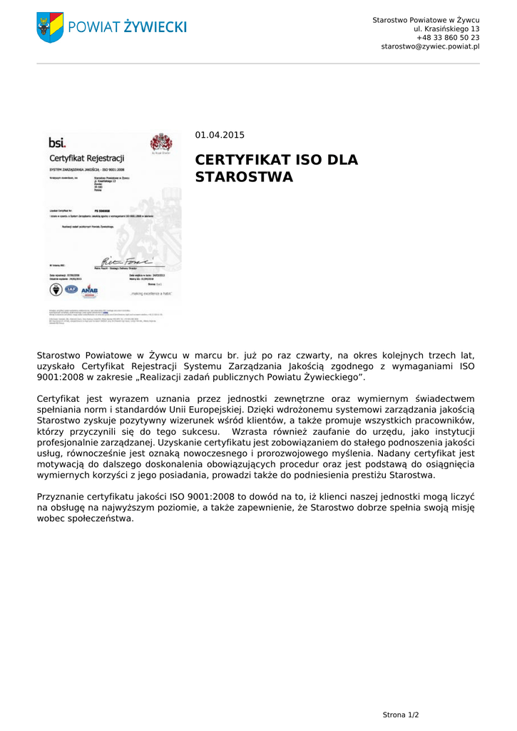 Starostwo Powiatowe w Żywcu ul. Krasińskiego 13 +48 33 860 50 23 [email protected] 01.04.2015 CERTYFIKAT ISO DLA STAROSTWA Starostwo Powiatowe w Żywcu w marcu br. już po raz czwarty, na okres kolejnych trzech lat, uzyskało Certyfikat Rejestracji Systemu Zarządzania Jakością zgodnego z wymaganiami ISO 9001:2008 w zakresie „Realizacji zadań publicznych Powiatu Żywieckiego”. Certyfikat jest wyrazem uznania przez jednostki zewnętrzne oraz wymiernym świadectwem spełniania norm i standardów Unii Europejskiej. Dzięki wdrożonemu systemowi zarządzania jakością Starostwo zyskuje pozytywny wizerunek wśród klientów, a także promuje wszystkich pracowników, którzy przyczynili się do tego sukcesu. Wzrasta również zaufanie do urzędu, jako instytucji profesjonalnie zarządzanej. Uzyskanie certyfikatu jest zobowiązaniem do stałego podnoszenia jakości usług, równocześnie jest oznaką nowoczesnego i prorozwojowego myślenia. Nadany certyfikat jest motywacją do dalszego doskonalenia obowiązujących procedur oraz jest podstawą do osiągnięcia wymiernych korzyści z jego posiadania, prowadzi także do podniesienia prestiżu Starostwa. Przyznanie certyfikatu jakości ISO 9001:2008 to dowód na to, iż klienci naszej jednostki mogą liczyć na obsługę na najwyższym poziomie, a także zapewnienie, że Starostwo dobrze spełnia swoją misję wobec społeczeństwa. Strona 1/2 Starostwo Powiatowe w Żywcu ul. Krasińskiego 13 +48 33 860 50 23 [email protected] Strona 2/2 Powered by TCPDF (www.tcpdf.org)