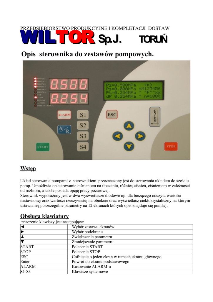 WILTOR Sp.J. PRZEDSIĘBIORSTWO PRODUKCYJNE I KOMPLETACJI DOSTAW TORUŃ Opis sterownika do zestawów pompowych. Wstęp Układ sterowania pompami z sterownikiem przeznaczony jest do sterowania układem do sześciu pomp. Umożliwia on sterowanie ciśnieniem na tłoczeniu, różnicą ciśnień, ciśnieniem w zależności od rozbioru, a także posiada opcję pracy pożarowej. Sterownik wyposażony jest w dwa wyświetlacze diodowe np. dla bieżącego odczytu wartości nastawionej oraz wartości rzeczywistej na obiekcie oraz wyświetlacz ciekłokrystaliczny na którym ustawia się poszczególne parametry na 12 ekranach których opis znajduje się poniżej. Obsługa klawiatury znaczenie klawiszy jest następujące: ◄ Wybór zestawu ekranów ► Wybór podekranu ▲ Zwiększanie parametru ▼ Zmniejszanie parametru START Polecenie START STOP Polecenie STOP ESC Cofnięcie o jeden ekran w ramach ekranu głównego Enter Powrót do ekranu podstawowego ALARM Kasowanie ALARM-u S1-S3 Klawisze systemowe ◄Ekran 0 – PODSTAWOWY Możliwość wykonania nastaw wartości wyświetlanych parametrów. ◄Ekran 1 – ALARMY ►Możliwość przeglądania 30-tu ostatnio zapisanych stanów alarmowych. Zapisywana jest przyczyna i czas wystąpienia stanu alarmowego. ◄Ekran 2 – KOD DOSTĘPU ▼▲Możliwość zmiany parametrów systemu: należy podać odpowiedni kod dostępu. Fabrycznie zapisywany jest kod 9999. ◄Ekran 3 – KONFIGURACJA SYSTEMU STEROWANIA POMPAMI ►Wprowadź tryb pracy systemu: 00 < p> 01 δ p 02 p = f(Q) 03 δp = f(Q) ►Tryb pracy systemu: normalny conajmniej jedna pompa zawsze załączona ► ciśnienie graniczne wyłączające pompy ► ustawienie ciśnienia pożarowego (brane pod uwagę gdy sygnał stykowy o pożarze jest aktywny) ► ograniczenie ciśnienie na tłoczeniu dla sterowania delta P ◄Ekran 4 – TRYBY PRACY POMP ►Tryby pracy pomp Rodzaj pracy M1-M6 pompa podstawowa pompa rezerwowa ►Tryby pracy pomp Pompa M1-M6 blokada pracy praca kaskadowa dozwolona tylko po rozruchu wykonanym przez przemiennik praca kaskadowa lub z przemiennikiem tylko falownik tylko kaskada kaskada bez rozruchów wykonanych przez przemiennik ◄Ekran 5 – PARAMETRY UKŁADU REGULACJI ►Obroty minimalne n=30% ►Zadanie falownika do załączenia kolejnej pompy...006s ►Maksymalny czas minimalnego zadania przetwornicy .... 10s ►Przetwornica histereza załączenia ...... 0,5 bara ►Przetwornica histereza wyłączenia .......0,2 bara. ►Kaskada histereza załączenia .....0,5bara. ►Kaskada histereza wyłączenia ....0,4 bara ►Współczynnik proporcjonalny regulatora PI kp=01% ►Współczynnik całkujący regulatora PI ki=5,00% ►Czas zwłoki pomiędzy załączeniami i wyłączeniami pompy ...5s. ►Czas zamiany pomp 1h – 72h ►Suchobieg po załączeniu pompy badaj po czasie .... 07s ► Suchobieg po załączeniu pomp Pt=0,100 ► Minimalna liczba załączonych pomp do zadziałania suchobiegu po zał ...1 ► Czas opóźnienia zadziałania suchobiegu po zał. pomp .....003sek ► Suchobieg przed załączeniem pomp Ps .....0,100 ► Czas forsowania 100% zadania przetwor. do wył pompy kaskadowo..01,0sek ►Minimalny poziom wody w zbiorniku H=....m ►Suchobieg na ssaniu po załączeniu pomp Ps... 0,100 ◄Ekran 6 – KONFIGURACJA KANAŁÓW POMIAROWYCH ► P1 P2 podaj jednostkę : bar, Mpa, kPa , m , cm. ►Przetwornik P1 rodzaj sygnału 0-20mA, 4-20mA ►Przetwornik P1 dolny zakres ►Przetwornik P1 górny zakres ►Przetwornik P2 rodzaj sygnału 0-20mA, 4-20mA ►Przetwornik P2 dolny zakres ►Przetwornik P2 górny zakres ►Przetwornik P3 rodzaj sygnału 0-20mA, 4-20mA ►Przetwornik P3 dolny zakres ►Przetwornik P3 górny zakres ►Przetwornik P4 rodzaj sygnału 0-20mA, 4-20mA ►Przetwornik P4 dolny zakres ►Przetwornik P4 górny zakres ►Pomiaru przepływu: sposób pomiaru: analogowy / impulsowy (wodomierz) ►Stała wodomierza ....m³/impuls ◄Ekran 7 – DANE KRZYWEJ p = f(Q) ►dane punktu 1 Q0 ► dane punktu 2 Q1 ► dane punktu 3 Q2 ◄Ekran 8 – POMPA ZALEWOWA I POŻAROWA ZALEWOWA ►ciśnienie wyłączenia pompy zalewowej ►minimalny czas pracy pompy zalewowej ►dodatkowy czas pracy pompy zalewowej ► czas ponowienia zał pompy zalewowej POŻAROWA ►ustawienie ciśnienia pożarowego załączenie ►ustawienie ciśnienia pożarowego wyłączenie BLOKADA ◄Ekran 9 – ADRESY SIECIOWE STEROWNIKA ►Ustawienie adresu sieciowego dla szeregowego portu 1 ►Ustawienie adresu sieciowego dla szeregowego portu 2 ◄Ekran 10 – ZEGAR ASTRONOMICZNY ►Ustawianie daty, godziny ◄Ekran 11 – SERWIS Ekran dostępny dla serwisu po wprowadzeniu kodu dostępu ◄Ekran 12 – KONFIGURACJA WYŚWIETLACZY LED Możliwość ustawienia parametrów wyświetlanych dla POLA 1i 2 ▲Pzad ▲Ps ▲Pt ▲Q ▲P4 ▲n% ▲dP ▲czas Funkcje dodatkowe: Zerowanie liczników np. godzin pracy pomp S1 + ▲(jednocześnie) Funkcja aktywna po wprowadzeniu kodu dostępu. Serwisowy kod dostępu 1997 Kasowanie alarmów: Ekran 1 do pozycji 29. S3 +▲ jednocześnie.