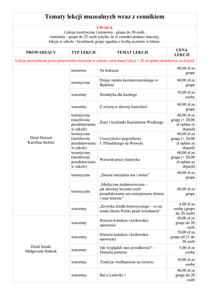 Tematy lekcji muzealnych wraz z cennikiem UWAGA Lekcja teoretyczna i terenowa - grupa do 30 osób, warsztaty - grupa do 25 osób (chyba, że w cenniku podano inaczej), lekcja w szkole - liczebność grupy zgodna z liczbą uczniów w klasie. CENA LEKCJI Lekcja prowadzona przez pracownika muzeum w szkole: cena danej lekcji + 20 zł opłata dodatkowa za dojazd PROWADZĄCY Dział Historii Karolina Stolorz Dział Sztuki Małgorzata Hałasik TYP LEKCJI TEMAT LEKCJI terenowa Na kirkucie 80,00 zł za grupę teoretyczna Dzieje zamku kazimierzowskiego w Będzinie 60,00 zł za grupę warsztaty Heraldyka dla każdego 10,00 zł za osobę warsztaty Z wizytą w dawnej kancelarii 60,00 zł za grupę teoretyczna (możliwość przedstawienia w szkole) teoretyczna (możliwość przedstawienia w szkole) teoretyczna (możliwość przedstawienia w szkole) Żony i kochanki Kazimierza Wielkiego Uroczystości pogrzebowe J. Piłsudskiego na Wawelu Warsztat pracy historyka 60,00 zł za grupę (+ 20,00 zł opłata za dojazd) 60,00 zł za grupę (+ 20,00 zł opłata za dojazd) 60,00 zł za grupę (+ 20,00 zł opłata za dojazd) teoretyczna „Dawne narzędzia kar i tortur” 60,00 zł za grupę teoretyczna „Medycyna średniowieczna – jak dawniej leczono czyli przepłukiwanie ust roztopionym złotem i inne historie” 60,00 zł za grupę warsztaty „Krytyka źródła historycznego – co na temat chrztu Polski pisali kronikarze” warsztaty Historia komiksu i królewskie opowieści warsztaty Historia komiksu i królewskie opowieści warsztaty Jak wyglądali nasi przodkowie? – Historia portretu 5,00 zł za osobę warsztaty Tradycje wielkanocne na świecie 10,00 zł za osobę warsztaty Bal u Ludwiki 1 4,00 zł za osobę (grupa do 30 osób) 60,00 zł za grupę do 20 osób 70,00 zł za grupę od 21 do 30 osób 40,00 zł za grupę do 20 osób Dział Fotografii Małgorzata Hałasik Dział Etnografii Anna Góra 60,00 zł za grupę od 21 do 30 osób 150 zł (za grupę do 30 osób) 150 zł (za grupę do 30 osób) + 5 zł os osoby za warsztaty 8 zł od osoby (grupa do 20 osób) 10 zł od osoby (grupa powyżej 20 osób) warsztaty Bal u Ludwiki 2 terenowa „Od Pałacu do dworu kolejowego” terenowa + warsztaty „Od Pałacu do dworu kolejowego” warsztaty „Ko i jak leczy zabytki w muzeum?” warsztaty „Ko i jak leczy zabytki w muzeum?” warsztaty Tajemnice dziewiętnastowiecznych fotografii teoretyczna Obrzędy doroczne w Zagłębiu Dąbrowskim 60,00 zł za grupę teoretyczna Co dawniej nosili nasi pradziadkowie 60,00 zł za grupę teoretyczna Zwyczaje i obrzędy rodzinne 60,00 zł za grupę teoretyczna Między medycyną a magią – ludowe sposoby leczenia 60,00 zł za grupę teoretyczna Czego bali się nasi pradziadkowie 60,00 zł za grupę teoretyczna Zwyczaje i obrzędy bożonarodzeniowe 60,00 zł za grupę teoretyczna Zwyczaje i obrzędy wielkanocne 60,00 zł za grupę teoretyczna Wróżby andrzejkowe i katarynkowe 60,00 zł za grupę warsztaty Dawne zabawy i zabawki naszych dziadków 5,00 zł za osobę warsztaty Tkactwo – nauka tkania na małym warsztacie 6,00 zł za osobę warsztaty Jak dawniej dbano o higienę – robimy mydełka 10,00 zł za osobę warsztaty Tradycyjne ozdoby bożonarodzeniowe ze słomy, bibuły, opłatków 5,00 zł za osobę warsztaty Co powinno się znaleźć w koszyczku wielkanocnym? 5,00 zł za osobę warsztaty Obrzędowość Świąt Wielkanocnych 1 4,00zł za osobę 50,00 zł za grupę do 20 osób Dział Archeologii Aleksandra Rogaczewska warsztaty Obrzędowość Świąt Wielkanocnych 2 warsztaty Skąd się wzieły Walentynki? 60,00 zł za grupę od 21 do 30 osób 5,00 zł za osobę 8,00 zł za osobę w grupie do 30 osób warsztaty ETNODIZAJN – Miłość do ludowości czy współczesna moda warsztaty Zwyczaje związane z zakończeniem Karnawału 2,00 zł za osobę teoretyczna Ziemia księgą przeszłości 60,00 zł za grupę teoretyczna Wprowadzenie w zagadnienia archeologii 60,00 zł za grupę terenowa Średniowieczny Będzin – rozwój terytorialny i historyczny z podkreśleniem tematyki obronności 80,00 zł za grupę teoretyczna Jak wytwarzano narzędzia krzemienne w poszczególnych okresach epoki kamienia na stanowiskach Ziemi Będzińskiej 60,00 zł za grupę teoretyczna Siemonia w pradziejach 60,00 zł za grupę teoretyczna Osady ludności kultury łużyckiej na podstawie znalezisk z Góry Zamkowej w Będzinie i najbliższych okolic 60,00 zł za grupę teoretyczna Wielkie cmentarzyska ludności kultury łużyckiej z epoki późnego brązu i wczesnego żelaza w okolicach dzisiejszego Będzina 60,00 zł za grupę warsztaty Życie codzienne w osadach ludności kultury łużyckiej na terenie dzisiejszego Zagłębia warsztaty Wytwarzanie biżuterii brązowej na wzór ozdób ludności kultury łużyckiej z końca epoki brązu i początków żelaza 10,00 zł za osobę teoretyczna Początki średniowiecznego Będzina w świetle źródeł archeologicznych 60,00 zł za grupę teoretyczna Osady wczesnośredniowieczne przy starym szlaku handlowym KrakówWrocław na terenie dzisiejszego Zagłębia 60,00 zł za grupę teoretyczna (możliwość przedstawienia w szkole) Gród Będziński w średniowieczu 6,00 zł za osobę 60,00 zł za grupę (+ 20,00 zł opłata za dojazd) Dział Edukacji Agnieszka Milka teoretyczna (możliwość Kultura łużycka na terenie dzisiejszego przedstawienia Zagłębia w szkole) 60,00 zł za grupę (+ 20,00 zł opłata za dojazd) teoretyczna (możliwość Zawód: Archeolog przedstawienia w szkole) 60,00 zł za grupę (+ 20,00 zł opłata za dojazd) warsztaty W izbie zagłębiowskiej 80,00 zł za grupę terenowa Zamek będziński jako przykład średniowiecznej budowli obronnej 80,00 zł za grupę terenowa Legendy będzińskie 80,00 zł za grupę warsztaty Coś tu nie gra 8,00 zł za osobę warsztaty W poszukiwaniu eksponatu 8,00 zł za osobę warsztaty Z wizytą u Mieroszewskich 80,00 zł za grupę warsztaty Dawno temu, za górami, za lasami… chodź opowiem