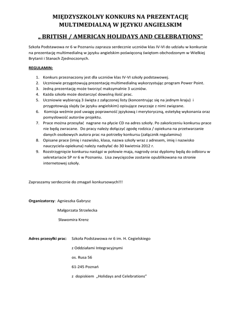 MIĘDZYSZKOLNY KONKURS NA PREZENTACJĘ MULTIMEDIALNĄ W JĘZYKU ANGIELSKIM „ BRITISH / AMERICAN HOLIDAYS AND CELEBRATIONS” Szkoła Podstawowa nr 6 w Poznaniu zaprasza serdecznie uczniów klas IV-VI do udziału w konkursie na prezentację multimedialną w języku angielskim poświęconą świętom obchodzonym w Wielkiej Brytanii i Stanach Zjednoczonych. REGULAMIN: 1. 2. 3. 4. 5. 6. 7. 8. 9. Konkurs przeznaczony jest dla uczniów klas IV-VI szkoły podstawowej. Uczniowie przygotowują prezentację multimedialną wykorzystując program Power Point. Jedną prezentację może tworzyć maksymalnie 3 uczniów. Każda szkoła może dostarczyć dowolną ilość prac. Uczniowie wybierają 3 święta z załączonej listy (koncentrując się na jednym kraju) i przygotowują slajdy (w języku angielskim) opisujące zwyczaje z nimi związane. Komisja weźmie pod uwagę poprawność językową i merytoryczną, estetykę wykonania oraz pomysłowość autorów projektu. Prace można przesyłać nagrane na płycie CD na adres szkoły. Po zakończeniu konkursu prace nie będą zwracane. Do pracy należy dołączyć zgodę rodzica / opiekuna na przetwarzanie danych osobowych autora prac na potrzeby konkursu (załącznik regulaminu) Opisane prace (imię i nazwisko, klasa, nazwa szkoły wraz z adresem, imię i nazwisko nauczyciela-opiekuna) należy nadsyłać do 30 kwietnia 2012 r. Rozstrzygnięcie konkursu nastąpi w połowie maja, nagrody oraz dyplomy będą do odbioru w sekretariacie SP nr 6 w Poznaniu. Lisa zwycięzców zostanie opublikowana na stronie internetowej szkoły. Zapraszamy serdecznie do zmagań konkursowych!!! Organizatorzy: Agnieszka Gabrysz Małgorzata Strzelecka Sławomira Krenz Adres przesyłki prac: Szkoła Podstawowa nr 6 im. H. Cegielskiego z Oddziałami Integracyjnymi os. Rusa 56 61-245 Poznań z dopiskiem „Holidays and Celebrations” Załącznik nr 1 Święta w Wielkiej Brytanii: 1. 2. 3. 4. 5. 6. 7. Christmas Guy Fawkes’ Day Valentine’s Day Pancake Day May Day Halloween Trooping the Colour Święta w Stanach Zjednoczonych: 1. 2. 3. 4. 5. 6. 7. Christmas Groundhog Day Valentine’s Day Independence Day Halloween Thanksgiving Memorial Day Załącznik nr 2 ZGODA NA PRZETWARZANIE DANYCH OSOBOWYCH Wyrażam zgodę na przetwarzanie moich danych osobowych oraz danych osobowych mojego dziecka ……………..……………………………………………………………………………… (imię i nazwisko) przez Szkołę Podstawową nr 6 im. Hipolita Cegielskiego z Oddziałami Integracyjnymi w Poznaniu dla celów związanych z konkursem „British / American Holidays and Celebrations” (zgodnie z ustawą z dn. 29.08.1997 o Ochronie Danych Osobowych Dz. U. z 2002 r. Nr 101, poz. 926 z póź. zm.) Imię i nazwisko Opiekuna: …………………………………………….. Podpis: …………………………………………………………………………..