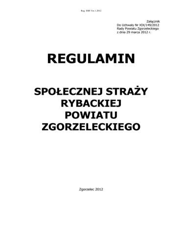 Reg. SSR Ver.1.2012 Załącznik Do Uchwały Nr XIX/149/2012 Rady Powiatu Zgorzeleckiego z dnia 29 marca 2012 r. REGULAMIN SPOŁECZNEJ STRAŻY RYBACKIEJ POWIATU ZGORZELECKIEGO Zgorzelec 2012 Reg. SSR Ver.1.2012 Spis treści Przepisy ogólne .................................................................................................................... 3 Organizacja Społecznej Straży Rybackiej. ................................................................................ 4 Tryb powoływania, odwoływania oraz zakres obowiązków komendanta powiatowego Społecznej Straży Rybackiej. .................................................................................................................. 5 Tryb powoływania i odwoływania oraz zakres obowiązków komendanta grupy terenowej Społecznej Straży Rybackiej. .................................................................................................. 6 Tryb powoływania i odwoływania oraz zakres obowiązków strażnika Społecznej Straży Rybackiej. ........................................................................................................................................... 7 Sposób postępowania strażnika podczas wykonywania czynności kontrolnych i zabezpieczających. ........................................................................................................................................... 8 Postępowanie strażnika z odebranymi lub porzuconymi rybami i przedmiotami służącymi do ich połowu ujawnionymi w trakcie wykonywania czynności kontrolnych .......................................... 9 Tryb postępowania strażnika w przypadku stwierdzenia zanieczyszczeń wód............................ 10 Zasady współpracy Społecznej Straży Rybackiej .................................................................... 10 Kontakt z mediami .............................................................................................................. 11 Przepisy końcowe. .............................................................................................................. 12 2 Reg. SSR Ver.1.2012 §1 PRZEPISY OGÓLNE 1. Społeczna Straż Rybacka działa na podstawie : 1) Ustawy z dnia 18 kwietnia 1985r. o rybactwie śródlądowym (tj Dz.U.09.189.1471 z późniejszymi zmianami). 2) Rozporządzenia Ministra Rolnictwa i Rozwoju Wsi z dnia 8 stycznia 2002r. w sprawie zakresu i warunków współpracy Państwowej Straży Rybackiej ze Społeczną Strażą Rybacką. (Dz.U.2002.5.55). 3) Rozporządzenia Ministra Rolnictwa i Gospodarki Żywnościowej z dnia 17 maja 1999r., w sprawie zasad sprawowania nadzoru specjalistycznego nad Społeczną Strażą Rybacką oraz ramowego regulaminu tej straży (Dz.U.1999.49.489). 4) Rozporządzenia Ministra Rolnictwa i Gospodarki Żywnościowej z dnia 09 maja 1997r., w sprawie praw i obowiązków pracowniczych, zasad wynagradzania, wzorów oznak, legitymacji służbowej, odznaki służbowej i umundurowania strażników Państwowej Straży Rybackiej oraz wzoru oznaki i legitymacji strażnika Społecznej Straży Rybackiej. (Dz.U.1997.55.354, z późniejszymi zmianami). 2. Terenem działania Społecznej Straży Rybackiej są wszystkie powierzchniowe wody śródlądowe w obrębie Powiatu Zgorzeleckiego. 3. Zadaniem Społecznej Straży Rybackiej jest ochrona powierzchniowych wód śródlądowych w obrębie Powiatu Zgorzeleckiego. 4. Społeczna Straż Rybacka może działać samodzielnie na wszystkich wodach śródlądowych w obrębie Powiatu Zgorzeleckiego będących w użytkowaniu: Powiatu Zgorzeleckiego, gmin i miast wchodzących w skład Powiatu Zgorzeleckiego, a także na wodach administrowanych przez Okręg PZW w Jeleniej Górze na terenie następujących miast i gmin: 1) miasto Zgorzelec, 2) miasto i gmina Bogatynia, 3) miasto i gmina Pieńsk, 4) miasto Zawidów, 5) gmina i miasto Węgliniec, 6) gm. Zgorzelec, 7) gm. Sulików, 5. Strażnikom Społecznej Straży Rybackiej niezbędne środki i wyposażenie do wykonywania zadań zapewnia Zarząd Okręgu Polskiego Związku Wędkarskiego. 3 Reg. SSR Ver.1.2012 6. Kontrolę przestrzegania ustawy o rybactwie śródlądowym oraz przepisów wydanych Społeczna Straż Rybacka wykonuje przy współpracy z Państwową Strażą Rybacką, Policją, Strażą Graniczną. 7. Nadzór specjalistyczny nad Społeczną Strażą Rybacką sprawuje Wojewoda Dolnośląski poprzez Komendanta Wojewódzkiego Państwowej Straży Rybackiej. 8. Zasady sprawowania nadzoru specjalistycznego nad Społeczną Strażą Rybacką określa Rozporządzenie Ministra Rolnictwa i Gospodarki Żywnościowej z dnia 17 maja 1999r., w sprawie zasad sprawowania nadzoru specjalistycznego nad Społeczną Strażą Rybacką oraz ramowego regulaminu tej straży. 9. Komendant Społecznej Straży Rybackiej Powiatu Zgorzeleckiego składa Wojewodzie Dolnośląskiemu kwartalne sprawozdania z działalności Społecznej Straży Rybackiej. §2 ORGANIZACJA SPOŁECZNEJ STRAŻY RYBACKIEJ. 1. W skład Społecznej Staży Rybackiej wchodzą: 1) Komendant Społecznej Straży Rybackiej Powiatu Zgorzeleckiego, 2) Komendanci grup terenowych Społecznej Straży Rybackiej, 3) Strażnicy Społecznej Straży Rybackiej. 2. Społeczna Strażą Rybacką kieruje Komendant Społecznej Straży Rybackiej Powiatu Rybackiej Powiatu Zgorzeleckiego. 3. W ramach Społecznej Straży Rybackiej mogą być tworzone grupy terenowe. 4. Strażnicy są podporządkowani Komendantowi Społecznej Straży Zgorzeleckiego, a w przypadku utworzenia grupy terenowej – Komendantowi grupy terenowej Społecznej Straży Rybackiej. 5. Strażnicy mogą działać w składzie patrolu Społecznej Straży Rybackiej, albo wspólnie z Państwową Strażą Rybacką, Policją, Strażą Graniczną, Strażą Leśną . 6. W czasie patrolu mieszanego (Państwowa Straż Rybacka, Policja, itp.) dowódcą patrolu jest funkcjonariusz państwowy. 7. Patrol Społecznej Straży Rybackiej składa się co najmniej z dwóch strażników. 8. 