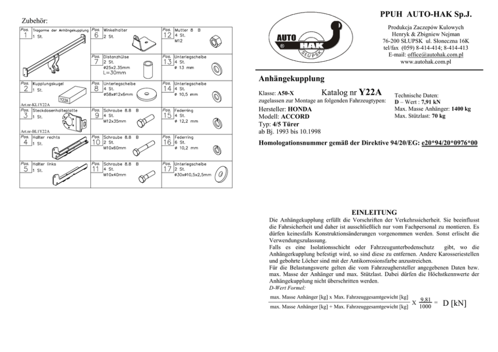 PPUH AUTO-HAK Sp.J. Zubehör: Produkcja Zaczepów Kulowych Henryk & Zbigniew Nejman 76-200 SŁUPSK ul. Słoneczna 16K tel/fax (059) 8-414-414; 8-414-413 E-mail: [email protected] www.autohak.com.pl Anhängekupplung Y22A Art.nr-KL1Y22A Art.nr-BL1Y22A Klasse: A50-X Katalog nr zugelassen zur Montage an folgenden Fahrzeugtypen: Hersteller: HONDA Modell: ACCORD Typ: 4/5 Türer ab Bj. 1993 bis 10.1998 Technische Daten: D – Wert : 7,91 kN Max. Masse Anhänger: 1400 kg Max. Stützlast: 70 kg Homologationsnummer gemäß der Direktive 94/20/EG: e20*94/20*0976*00 EINLEITUNG Die Anhängekupplung erfüllt die Vorschriften der Verkehrssicherheit. Sie beeinflusst die Fahrsicherheit und daher ist ausschließlich nur vom Fachpersonal zu montieren. Es dürfen keinesfalls Konstruktionsänderungen vorgenommen werden. Sonst erlischt die Verwendungszulassung. Falls es eine Isolationsschicht oder Fahrzeugunterbodenschutz gibt, wo die Anhängerkupplung befestigt wird, so sind diese zu entfernen. Andere Karosseriestellen und gebohrte Löcher sind mit der Antikorrosionsfarbe anzustreichen. Für die Belastungswerte gelten die vom Fahrzeughersteller angegebenen Daten bzw. max. Masse der Anhänger und max. Stützlast. Dabei dürfen die Höchstkennwerte der Anhängekupplung nicht überschritten werden. D-Wert Formel: max. Masse Anhänger [kg] x Max. Fahrzeuggesamtgewicht [kg] max. Masse Anhänger [kg] + Max. Fahrzeuggesamtgewicht [kg] X 9,81 = 1000 D [kN] MONTAGE - und BETRIEBSANLEITUNG DER ANHÄNGEKUPPLUNG Anbauanleitung 1. Um die Anhängerkupplung zu montieren, soll die Stoßstange demontiert werden. 2. Den Teppichboden im Kofferraumbereich herausnehmen, die Kunststoffverkleidung des hinteren Teils des Fahrzeuges abschrauben und die seitliche Polsterschicht aufklappen. 3. In dem Längsträger von unten gibt es je zwei Löcher, die mit den Kunststoffkorken verschlossen sind – sie sind herauszunehmen. 4. Die Seitenhalter (Pos. 4 u. 5) in die Längsträger einschieben und wie auf der Zeichnung gezeigt verschrauben. 5. Die Distanzhülse (Pos.7) im Kofferraum, wo es die Kunststoffkorken gab, einschieben, die gebogenen Laschen(Pos.6) aufsetzen und wie auf der Zeichnung gezeigt verschrauben. 6. Die Tragarme der Anhängerkupplung (Pos.1) zwischen die montierten Seitenhalter einschieben und mit den Schrauben M12x35mm (Pos.9) verschrauben. 7. Einen Teil in der Stoßstange ausschneiden (dazu die Schablone verwenden). 8. Die hintere Stoßstange montieren. 9. Die Kupplungskugel gemäß der Anbauanleitung der Anhängekupplung mit dem schnelldemontierbaren Aufsatz anbringen. Den Steckdosenhalter (Pos. 3) mit verschrauben. 10. Alle Schrauben gemäß den Angaben in der Tabelle festziehen. 11. Die Elektroinstallation gemäß der Bedienungsanleitung des Herstellers anschließen. 12. Falls nötig, den durch die Montage beschädigten Farbanstrich an der Anhängerkupplung ausbessern. 10 4 6 17 7 8 11 1 10 9 17 6 5 7 8 11 9 3 11 Die Anhängekupplung (Katalognummer Y22A) ist für folgende Fahrzeugtypen zugelassen: HONDA ACCORD 4/5 Türer, ab Bj. 1993 bis 10.1998, dient zum ziehen der Anhänger mit der Gesamtlast von 1400 kg und der Kugelstützlast von max. 70 kg. Drehmomente für Schrauben und Muttern 8.8: M6 - 11 Nm M 8 - 25 Nm M 10 - 50 Nm M 12 - 87 Nm M 14 - 138 Nm M16 - 210 Nm VON DEM HERSTELLER ACHTUNG Die Zuverlässigkeit der Anhängekupplung ist jedoch auch von der ordnungsgemäßen Montage und der richtigen Nutzung abhängig. Daher werden Sie gebeten, sorgfältig die folgende Montageanleitung zu lesen und sich an die entsprechenden Anweisungen zu beachten. Die Anhängekupplung muss an den vom Fahrzeughersteller vorgeschriebenen Befestigungsstellen montiert werden. Nach dem Anbau der Anhängekupplung sind die nationalen Vorschriften zur Anbauabnahme und zur Änderung der Fahrzeugpapiere zu beachten. Das Fahrzeug sollte mit seitlichen Blinkern und Rückspiegeln, deren Abstand mindestens der Anhängerbreite entspricht, ausgestattet werden. Alle Befestigungsschrauben sind nach ca. 1 000 km Anhängerbetrieb zu prüfen und nachzuziehen. Die Kugel der Anhängekupplung ist sauber zu halten und zu fetten. (D) (CZ) (F) (GB) (PL) (SK) Der Freiraum nach Anhang VII, Abbildung 30 der Richtlinie 94/20/EG ist zu gewährleisten. Volný prostor ve smyslu Přílohy VII,obr. 30 Směrnice č. 94/20/EG musí být zaručen. L´espace libre doit être garanti conformément à ľannexe VII, illustracion 30 de la directive 94/20/ CE. The clearance specified in apendix VII, diagram 30 of guideline 94/20/EC must be guaranteed. Zagwarantować swobodną przestrzeń zgodnie z załącznikiem VII, rysunek 30 dyrektywy 94/20/CE. Volný priestor v zmysle Prílohy VII, obr. 30 Smernice 94/20/EC musí byť zaručená. (D) (CZ) (F) (GB) (PL) (SK) * bei zulässigem Gesamtgewicht des Fahrzeuges * při celkové přípustné hmotnosti vozidla * pour poids total en charge autorizé du véhicule * at gross vehicle weight rating * przy dopuszczalnym ciężarze całkowitym pojazdu * pri celkovej prípustnej hmotnosti vozidla FITTING INSTRUCTION Clamp mark in acc. with ISO PN 1 L 2 + 3 31 4 R 5 58R 6 54 7 58L Fitting instructions 11 Cables joining 4 Left directional lights Rear fog lights Ground Right directional lights Right side parking lights Stoplights Left side parking lights 6 21 7 8 12 1 11 10 21 6 9 5 19 7 8 12 10 3 18 2 1. To install this towing hitch you have to disassemble a bumper. 2. From boot take out carpet, unscrew plastic cover of rear part and pull side upholstery. 3. From below the car in chassis members are holes blind with plastic plugs – pull out this plugs. 4. To chassis members slip side brackets (pos. 4 and 5) and loosely fix it as shown in drawing. 5. Inside boot remove plastic plug, slide distance sleeves (pos. 7), put elements pos. 6 and fix as shown in drawing. 6. Between installed brackets pos. 4 and 5 insert main bar of towing hitch pos. 1 and fix using bolts M12x35mm (pos. 10). 7. Cut fragment of bumper (use template). 8. After cut, instal