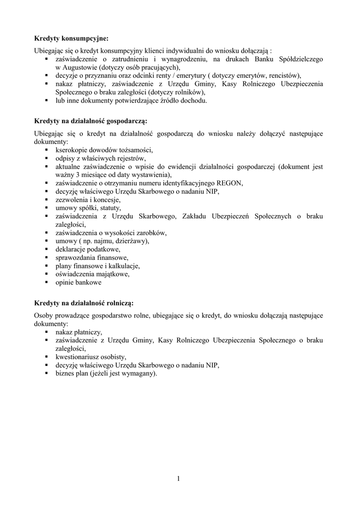 Kredyty konsumpcyjne: Ubiegając się o kredyt konsumpcyjny klienci indywidualni do wniosku dołączają : zaświadczenie o zatrudnieniu i wynagrodzeniu, na drukach Banku Spółdzielczego w Augustowie (dotyczy osób pracujących), decyzje o przyznaniu oraz odcinki renty / emerytury ( dotyczy emerytów, rencistów), nakaz płatniczy, zaświadczenie z Urzędu Gminy, Kasy Rolniczego Ubezpieczenia Społecznego o braku zaległości (dotyczy rolników), lub inne dokumenty potwierdzające źródło dochodu. Kredyty na działalność gospodarczą: Ubiegając się o kredyt na działalność gospodarczą do wniosku należy dołączyć następujące dokumenty: kserokopie dowodów tożsamości, odpisy z właściwych rejestrów, aktualne zaświadczenie o wpisie do ewidencji działalności gospodarczej (dokument jest ważny 3 miesiące od daty wystawienia), zaświadczenie o otrzymaniu numeru identyfikacyjnego REGON, decyzję właściwego Urzędu Skarbowego o nadaniu NIP, zezwolenia i koncesje, umowy spółki, statuty, zaświadczenia z Urzędu Skarbowego, Zakładu Ubezpieczeń Społecznych o braku zaległości, zaświadczenia o wysokości zarobków, umowy ( np. najmu, dzierżawy), deklaracje podatkowe, sprawozdania finansowe, plany finansowe i kalkulacje, oświadczenia majątkowe, opinie bankowe Kredyty na działalność rolniczą: Osoby prowadzące gospodarstwo rolne, ubiegające się o kredyt, do wniosku dołączają następujące dokumenty: nakaz płatniczy, zaświadczenie z Urzędu Gminy, Kasy Rolniczego Ubezpieczenia Społecznego o braku zaległości, kwestionariusz osobisty, decyzję właściwego Urzędu Skarbowego o nadaniu NIP, biznes plan (jeżeli jest wymagany). 1 Kredyty na cele mieszkaniowe: budowa pozwolenie na budowę, dokumentacja architektoniczno – projektowa, dowód własności nieruchomości, uproszczony kosztorys wraz z harmonogramem prac, udokumentowanie posiadanie udziału własnego (20% kosztów inwestycji), zaświadczenie o braku zaległości z opłatą podatku od nieruchomości, remont uproszczony kosztorys wraz z harmonogramem prac, udokumentowanie posiadanie udziału własnego (20% kosztów inwestycji), zaświadczenie o braku zaległości z opłatą podatku od nieruchomości, zakup umowa przedwstępna kupna – sprzedaży, zaświadczenie o braku zaległości z opłatą podatku od nieruchomości, oraz dokumenty potwierdzające źródło dochodów, analogicznie jak dla kredytów konsumpcyjnych. W przypadku zabezpieczenia hipoteką na nieruchomości – dotyczy wszystkich rodzajów kredytów: odpis z księgi wieczystej, akt notarialny potwierdzający własność nieruchomości, operat szacunkowy sporządzony dla nieruchomości (wycena), polisa ubezpieczeniowa budynków – w przypadku nieruchomości zabudowanych, zaświadczenie o nie zaleganiu z opłatą podatku od nieruchomości. 2