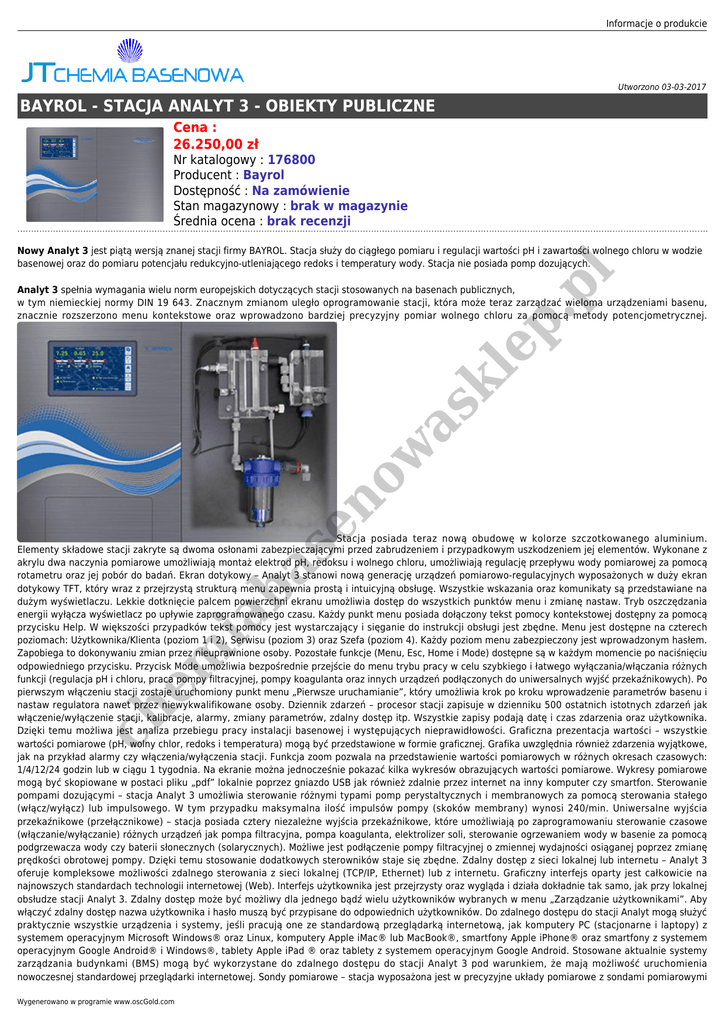 Informacje o produkcie Utworzono 03-03-2017 BAYROL - STACJA ANALYT 3 - OBIEKTY PUBLICZNE Cena : 26.250,00 zł Nr katalogowy : 176800 Producent : Bayrol Dostępność : Na zamówienie Stan magazynowy : brak w magazynie Średnia ocena : brak recenzji l Nowy Analyt 3 jest piątą wersją znanej stacji firmy BAYROL. Stacja służy do ciągłego pomiaru i regulacji wartości pH i zawartości wolnego chloru w wodzie basenowej oraz do pomiaru potencjału redukcyjno-utleniającego redoks i temperatury wody. Stacja nie posiada pomp dozujących. se no w as kl ep .p Analyt 3 spełnia wymagania wielu norm europejskich dotyczących stacji stosowanych na basenach publicznych, w tym niemieckiej normy DIN 19 643. Znacznym zmianom uległo oprogramowanie stacji, która może teraz zarządzać wieloma urządzeniami basenu, znacznie rozszerzono menu kontekstowe oraz wprowadzono bardziej precyzyjny pomiar wolnego chloru za pomocą metody potencjometrycznej. ch em ia ba Stacja posiada teraz nową obudowę w kolorze szczotkowanego aluminium. Elementy składowe stacji zakryte są dwoma osłonami zabezpieczającymi przed zabrudzeniem i przypadkowym uszkodzeniem jej elementów. Wykonane z akrylu dwa naczynia pomiarowe umożliwiają montaż elektrod pH, redoksu i wolnego chloru, umożliwiają regulację przepływu wody pomiarowej za pomocą rotametru oraz jej pobór do badań. Ekran dotykowy – Analyt 3 stanowi nową generację urządzeń pomiarowo-regulacyjnych wyposażonych w duży ekran dotykowy TFT, który wraz z przejrzystą strukturą menu zapewnia prostą i intuicyjną obsługę. Wszystkie wskazania oraz komunikaty są przedstawiane na dużym wyświetlaczu. Lekkie dotknięcie palcem powierzchni ekranu umożliwia dostęp do wszystkich punktów menu i zmianę nastaw. Tryb oszczędzania energii wyłącza wyświetlacz po upływie zaprogramowanego czasu. Każdy punkt menu posiada dołączony tekst pomocy kontekstowej dostępny za pomocą przycisku Help. W większości przypadków tekst pomocy jest wystarczający i sięganie do instrukcji obsługi jest zbędne. Menu jest dostępne na czterech poziomach: Użytkownika/Klienta (poziom 1 i 2), Serwisu (poziom 3) oraz Szefa (poziom 4). Każdy poziom menu zabezpieczony jest wprowadzonym hasłem. Zapobiega to dokonywaniu zmian przez nieuprawnione osoby. Pozostałe funkcje (Menu, Esc, Home i Mode) dostępne są w każdym momencie po naciśnięciu odpowiedniego przycisku. Przycisk Mode umożliwia bezpośrednie przejście do menu trybu pracy w celu szybkiego i łatwego wyłączania/włączania różnych funkcji (regulacja pH i chloru, praca pompy filtracyjnej, pompy koagulanta oraz innych urządzeń podłączonych do uniwersalnych wyjść przekaźnikowych). Po pierwszym włączeniu stacji zostaje uruchomiony punkt menu „Pierwsze uruchamianie”, który umożliwia krok po kroku wprowadzenie parametrów basenu i nastaw regulatora nawet przez niewykwalifikowane osoby. Dziennik zdarzeń – procesor stacji zapisuje w dzienniku 500 ostatnich istotnych zdarzeń jak włączenie/wyłączenie stacji, kalibracje, alarmy, zmiany parametrów, zdalny dostęp itp. Wszystkie zapisy podają datę i czas zdarzenia oraz użytkownika. Dzięki temu możliwa jest analiza przebiegu pracy instalacji basenowej i występujących nieprawidłowości. Graficzna prezentacja wartości – wszystkie wartości pomiarowe (pH, wolny chlor, redoks i temperatura) mogą być przedstawione w formie graficznej. Grafika uwzględnia również zdarzenia wyjątkowe, jak na przykład alarmy czy włączenia/wyłączenia stacji. Funkcja zoom pozwala na przedstawienie wartości pomiarowych w różnych okresach czasowych: 1/4/12/24 godzin lub w ciągu 1 tygodnia. Na ekranie można jednocześnie pokazać kilka wykresów obrazujących wartości pomiarowe. Wykresy pomiarowe mogą być skopiowane w postaci pliku „pdf” lokalnie poprzez gniazdo USB jak również zdalnie przez internet na inny komputer czy smartfon. Sterowanie pompami dozującymi – stacja Analyt 3 umożliwia sterowanie różnymi typami pomp perystaltycznych i membranowych za pomocą sterowania stałego (włącz/wyłącz) lub impulsowego. W tym przypadku maksymalna ilość impulsów pompy (skoków membrany) wynosi 240/min. Uniwersalne wyjścia przekaźnikowe (przełącznikowe) – stacja posiada cztery niezależne wyjścia przekaźnikowe, które umożliwiają po zaprogramowaniu sterowanie czasowe (włączanie/wyłączanie) różnych urządzeń jak pompa filtracyjna, pompa koagulanta, elektrolizer soli, sterowanie ogrzewaniem wody w basenie za pomocą podgrzewacza wody czy baterii słonecznych (solarycznych). Możliwe jest podłączenie pompy filtracyjnej o zmiennej wydajności osiąganej poprzez zmianę prędkości obrotowej pompy. Dzięki temu stosowanie dodatkowych sterowników staje się zbędne. Zdalny dostęp z sieci lokalnej lub internetu – Analyt 3 oferuje kompleksowe możliwości zdalnego sterowania z sieci lokalnej (TCP/IP, Ethernet) lub z internetu. Graficzny interfejs oparty jest całkowicie na najnowszych standardach technologii internetowej (Web). Interfejs użytkownika jest przejrzysty oraz wygląda i działa dokładnie tak samo, jak przy lokalnej obsłudze stacji Analyt 3. Zdalny dostęp może być możliwy dla jednego bądź wielu użytkowników wybranych w menu „Zarządzanie użytkownikami”. Aby włączyć zdalny dostęp nazwa użytkownika i hasło muszą być przypisane do odpowiednich użytkowników. Do zdalnego dostępu do stacji Analyt mogą służyć praktycznie wszystkie urządzenia i systemy, jeśli pracują one ze standardową przeglądarką internetową, jak komputery PC (stacjonarne i laptopy) z systemem operacyjnym Microsoft Windows® oraz Linux, komputery Apple iMac® lub MacBook®, smartfony Apple iPhone® oraz smartfony z systemem operacyjnym Google Android® i Windows®, tablety Apple iPad ® oraz tablety z systemem operacyjnym Google Android. Stosowane aktualnie systemy zarządzania budynkami (BMS) mogą być wyko