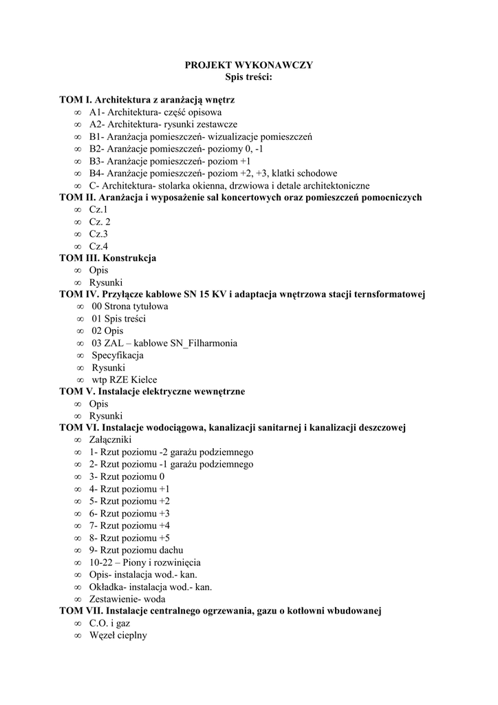 PROJEKT WYKONAWCZY Spis treści: TOM I. Architektura z aranŜacją wnętrz • A1- Architektura- część opisowa • A2- Architektura- rysunki zestawcze • B1- AranŜacja pomieszczeń- wizualizacje pomieszczeń • B2- AranŜacje pomieszczeń- poziomy 0, -1 • B3- AranŜacje pomieszczeń- poziom +1 • B4- AranŜacje pomieszczeń- poziom +2, +3, klatki schodowe • C- Architektura- stolarka okienna, drzwiowa i detale architektoniczne TOM II. AranŜacja i wyposaŜenie sal koncertowych oraz pomieszczeń pomocniczych • Cz.1 • Cz. 2 • Cz.3 • Cz.4 TOM III. Konstrukcja • Opis • Rysunki TOM IV. Przyłącze kablowe SN 15 KV i adaptacja wnętrzowa stacji ternsformatowej • 00 Strona tytułowa • 01 Spis treści • 02 Opis • 03 ZAL – kablowe SN_Filharmonia • Specyfikacja • Rysunki • wtp RZE Kielce TOM V. Instalacje elektryczne wewnętrzne • Opis • Rysunki TOM VI. Instalacje wodociągowa, kanalizacji sanitarnej i kanalizacji deszczowej • Załączniki • 1- Rzut poziomu -2 garaŜu podziemnego • 2- Rzut poziomu -1 garaŜu podziemnego • 3- Rzut poziomu 0 • 4- Rzut poziomu +1 • 5- Rzut poziomu +2 • 6- Rzut poziomu +3 • 7- Rzut poziomu +4 • 8- Rzut poziomu +5 • 9- Rzut poziomu dachu • 10-22 – Piony i rozwinięcia • Opis- instalacja wod.- kan. • Okładka- instalacja wod.- kan. • Zestawienie- woda TOM VII. Instalacje centralnego ogrzewania, gazu o kotłowni wbudowanej • C.O. i gaz • Węzeł cieplny TOM VIII. Instalacje wentylacji mechanicznej, klimatyzacji i ciepła technologicznego • Załączniki • Okładka • Opis • 1- Rzut poziomu -2 • 2- Rzut poziomu -1 garaŜu podziemnego • 2a- Rzut poziomu -1 garaŜu podziemnego- klimatyzacja • 3- Rzut poziomu 0 – wentylacja • 3a- Rzut poziomu 0 – klimatyzacja • 4- Rzut poziomu +1- wentylacja • 4a- Rzut poziomu +1- klimatyzacja • 5- Rzut poziomu +2- wentylacja • 5a- Rzut poziomu +2 – klimatyzacja • 6- Rzut poziomu +3 – wentylacja • 6a- Rzut poziomu +3- klimatyzacja • 7- Rzut poziomu +4- wentylacja • 8- Rzut poziomu +5 – wentylacja wywiewna sali głównej • 9- Rzut poziomu +5- wentylacja z przestrzeni nad stropem technicznym • 10- Rzut dachu • 11- Schemat systemu kanalizacji nr 1 • 12- Schemat systemu kanalizacji nr 2 • 13- Schemat systemu kanalizacji nr 3 • 14- Schemat systemu kanalizacji nr 4 • 15- Schemat systemu kanalizacji nr 5 • 16- Schemat systemu kanalizacji nr 6 TOM IX. Instalacja przeciwpoŜarowa • Załączniki • Okładka • Spis treści • Opis • 1- Rzut poziomu -3, zbiornik ppoŜ. • 1a - Rzut poziomu -1 i -2 garaŜu podziemnego- schemat instalacji tryskaczowej • 2- Rzut poziomu -2 garaŜu podziemnego • 3- Rzut poziomu -1 garaŜu podziemnego • 4- Rzut poziomu 0 • 5- Rzut poziomu +1 • 6- Rzut poziomu +2 • 7- Rzut poziomu +3 • 8- Rzut poziomu +4 • 9- Schemat instalacji tryskaczowej • 10 –Rzut pompowni tryskaczowej • 11- Aksonometria- grupa tryskaczowa nr 1 • 12- Aksonometria- grupa tryskaczowa nr 2 TOM X. Akustyka wnętrz z elementami budowlanej ochrony przed hałasem • Opis • Rysunki TOM XI. Urządzenia mechaniczne sceny • Rysunki • Opis TOM XII. Oświetlenie technologiczne widowni i estrady • Opis • Rysunki TOM XIII. System sygnalizacji poŜaru • Opis • Filharmonia- blok • Osie- wzorzec • SSP. Poziom -2 • SSP. Poziom -1 • SSP. Poziom 0 • SSP. Poziom +1 • SSP. Poziom +2 • SSP. Poziom +3 • SSP. Poziom +4 • SSP. Poziom +5 TOM XIV. Instalacje teletechniczne • Opis • Rys 01, Poziom -2 Rzut • Rys 02, Poziom -1 Rzut • Rys 03, Poziom 0 Rzut • Rys 04, Poziom 1 Rzut • Rys 05, Poziom 2 Rzut • Rys 06, Poziom 3 Rzut • Rys 07, Poziom 4 Rzut • Rys 08, Schemat blokowy kontroli dostępu • Rys 09, Schemat blokowy sieci strukturalnej • Rys 10, Schemat blokowy systemu parkingu płatnego • Rys 11, Schemat blokowy systemu sygnalizacji włamania • Rys 12, Schemat blokowy sytemu monitoringu • Rys 13, Schemat blokowy telewizji • Rys 14, Schemat blokowy systemu domofonu • Rys 15, Schemat blokowy centrali telefonicznej • Rys 16, Schemat szafy S1 • Rys 17, Schemat szafy S2 • Rys 18, Schemat szafy S3 • Rys 19, Schemat szafy S4 • Rys 20, Schemat szafy S5 • Rys 21, Schemat szafy S6 • Rys 22, Schemat szafy S7 TOM XV. Ochrona przeciwpoŜarowa- wytyczne techniczno- budowlane • Opis • Strona tytułowa • Rysunki TOM XVI. Dźwiękowy system ostrzegania • Opis • Osie wzorzec – przekroje • Osie wzorzec • 1- schemat DSO • 2- poziom -2 • 3- poziom -1 • 4- poziom 0 • 5- poziom +1 • 6- poziom +2 • 7- poziom +3 • 8- poziom +4 • 9- poziom +5 • Tabelka projektu przekroju • Tabelka projektu • Warstwy • Warstwy, Rzuty TOM XVII. Systemy elektroakustyczne Filharmonii Świętokrzyskiej • Opis • Okładka • Osie wzorzec • Poziom +5 bez instalacji • 1- Schemat nagłośnienia sali koncertowej • 2- Schemat blokowego nagłośnienia Foyer • 3- Schemat systemu inspicjenta sali koncertowej • 4- Schemat systemu inspicjenta sali kameralnej • 5- Schemat nagłośnienia sali kameralnej • 6- Schemat TV inspicjenta • 7- Schemat transmisji video • 8- Poziom -1 • 9- Poziom 0 • 10- Poziom +1 • 11- Poziom +2 • 12- Poziom +3 • 13- Poziom +4 • 14- Przekrój poprzeczny- otwór portalowy • 15- Rozmieszczenie urządzeń podłuŜny • 16- Rozmieszczenie urządzeń el.-akwreŜyserni TOM XVIII. Budowa zjazdów z ulicy Głowackiego w Kielcach na teren działki nr Ew. 1211 do planowanego budynku Filharmonii Świętokrzyskiej • Okładka • Strona tytułowa • Zawartość opracowania • Opis techniczny • D-1 Plan zjazdów • D-2.1 Profil podłuŜny zjazdów • D-2.2 Profil podłuŜny ramp • D-3 Przekroje konstrukcyjne • D- 4.1 Organizacja ruchu poziom -1 • D- 4.2 Organizacja ruchu poziom -2 TOM XIX. AranŜacja meblowa • 1- AM 0 • 2- AM +1 • 3- AM +2 • 4- AM +3 • 5- Garderoby
