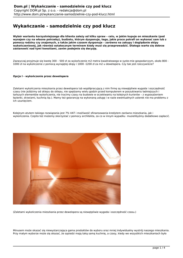 Dom.pl | Wykańczanie - samodzielnie czy pod klucz Copyright DOM.pl Sp. z o.o. - [email protected] http://www.dom.pl/wykanczanie-samodzielnie-czy-pod-klucz.html Wykańczanie - samodzielnie czy pod klucz Wybór wariantu korzystniejszego dla klienta zależy od kilku spraw – celu, w jakim kupuje on mieszkanie (pod wynajem czy na własne potrzeby), budżetu, którym dysponuje, tego, jakie prace potrafi on wykonać sam lub z pomocą rodziny czy znajomych, a także jakim czasem dysponuje – zarówno na zakupy i doglądanie ekipy wykończeniowej, jak również ostatecznym terminem kiedy musi się przeprowadzić. Dlatego warto się dobrze zastanowić nad tymi kwestiami, zanim podejmie się decyzję. Zazwyczaj przyjmuje się kwotę 300 – 500 zł za wykończenie m2 metra kwadratowego w systemie gospodarczym, około 800 1000 zł na wykończenie z pomocą wynajętej ekipy i 1000 -1200 zł za m2 u dewelopera. Czy tak jest rzeczywiście? Opcja I - wykończenie przez dewelopera Zaletami wykończenia mieszkania przez dewelopera lub współpracującą z nim firmę są niewątpliwie wygoda i oszczędność czasu (nie jeździmy od sklepu do sklepu, nie spędzamy wielu godzin przed komputerem w poszukiwaniu ładniejszych i tańszych elementów wykończenia, nie tracimy czasu na budowie w oczekiwaniu na kolejnych kurierów – z wyposażeniem łazienki, drzwiami, kuchnią itp.). Mamy też gwarancję na wykonaną usługę i w razie ewentualnych usterek nie ma problemu z ich usunięciem. Kolejnym atutem takiego rozwiązania jest 7% VAT i możliwość sfinansowania kredytem zarówno mieszkania, jak i wykończenia. Często też możemy skorzystać z pomocy architekta, za co w innym wypadku musielibyśmy dodatkowo zapłacić. (Zaletami wykończenia mieszkania przez dewelopera są niewątpliwie wygoda i oszczędność czasu.) Minusem może okazać się niewystarczająca gama produktów do wyboru oraz mniej indywidualny wystrój naszego mieszkania. Przy małym wyborze może się okazać, że sąsiedzi mają taką samą kuchnię, a czasy, kiedy we wszystkich mieszkaniach było page 1 / 4 Dom.pl | Wykańczanie - samodzielnie czy pod klucz Copyright DOM.pl Sp. z o.o. - [email protected] http://www.dom.pl/wykanczanie-samodzielnie-czy-pod-klucz.html identycznie, źle nam się kojarzą. A ceny? Te kształtują się różnie, w zależności od wybranej opcji, ale nawet na najtańsze z nich nie każdego będzie stać. Opcja II - system gospodarczy, czyli szansa na wykończenie za 300-500 zł/m2 System gospodarczy kusi niską ceną, choć czasami może się to okazać pozorem. Wszak czas i benzyna też kosztują. Wady tego sposobu to czasochłonność – wymagająca dużo zaangażowania w poszukiwania i łapanie okazji – tu tańsza glazura, tam wanna, jeszcze gdzie indziej panele. No chyba, że pół roku przed odbiorem mieszkania zaczynamy kupowanie kolejnych potrzebnych rzeczy i magazynujemy je w oczekiwaniu na odbiór kluczy. Jeśli sami nie jesteśmy „złotą rączką”, będziemy zależni od dostępności czasowej taty, wujka czy kolegi. (Nawet najtańsza oferta dewelopera jest droższa od samodzielnego wykończenia mieszkania.) Dodatkowo może się zdarzyć, że znający się na różnych pracach wykończeniowo-remontowych zajmują się nimi okazjonalnie i wykonanie tych prac zajmuje im więcej czasu niż dobrze zorganizowanej i biegłej w swym rzemiośle ekipie. Musimy również pamiętać, że prace wykończeniowe powinny przebiegać w pewnej kolejności, więc jeżeli np. chcemy przesunąć kontakty, a elektryk nie ma czasu, wówczas musimy poczekać – nie będziemy przecież kłaść gładzi i malować, żeby potem jeszcze pruć ściany. Opcja III - wykończenie z pomocą wynajętej ekipy page 2 / 4 Dom.pl | Wykańczanie - samodzielnie czy pod klucz Copyright DOM.pl Sp. z o.o. - [email protected] http://www.dom.pl/wykanczanie-samodzielnie-czy-pod-klucz.html Ta opcja jest z pewnością droższa od systemu gospodarczego, ale na pewno tańsza od propozycji dewelopera. Istnieje jednak ryzyko, że nawet jeśli zrobiliśmy wstępną przymiarkę kosztów, w praktyce nie będzie łatwo trzymać się założenia, że np. glazurę nie kupimy maksymalnie za 40 zł/m2, bo właśnie spodobała nam się droższa – za 60 zł/m2. Mało kto zrezygnuje z ładniejszego produktu, mając świadomość, że urządza wreszcie własne mieszkanie, w którym, z racji chociażby kredytu, będzie mieszkał dłużej niż 5 lat. Również w przypadku wykończenia musimy mieć świadomość potrzebnego na to czasu. Raczej nie zdarza się, że wszystko kupimy w jednym miejscu, nie unikniemy więc wędrówki po sklepach. Dodatkowo kupowane przez nas rzeczy mogą okazać się niedostępne w danym momencie i będziemy musieli czekać na realizację zamówienia (w przypadku drzwi jest to średnio 6 tygodni). Samo więc zgromadzenie potrzebnych produktów może zająć sporo czasu. Dobrze w tej sytuacji porozmawiać wcześniej z ekipą wykończeniową - ustalić harmonogram prac i tak dostosować do niego harmonogram zakupów, żeby zminimalizować straty czasu. Kolejna sprawa to znalezienie wykonawcy. Kłopot z fachowcami, którzy wyemigrowali na wyspy nie jest już tak dotkliwy, odkąd spadła cena funta i część z nich wróciła do kraju. Problemem jest natomiast pewność co do poziomu świadczonych usług – cena nie zawsze gwarantuje wysoką jakość wykonania. Najlepiej brać wykonawców poleconych przez znajomych, u których możemy ocenić jakość wykonanych robót. Dobrze jest spisać umowę albo poprosić o wycenę na piśmie, żeby uniknąć nieporozumień i prób zmiany cen w trakcie prac wykończeniowych. Na koniec trzeba dodać, że należy też mieć rezerwę w wysokości 10-20% planowanego budżetu na wypadek nieprzewidzianych wydatków. Możliwe różnice kosztów w poszczególnych wariantów wykończenia Zdając sobie sprawę z zalet i wad wszystkich opcji, spójrzmy jeszcze dokładniej na ich aspekt finansowy 