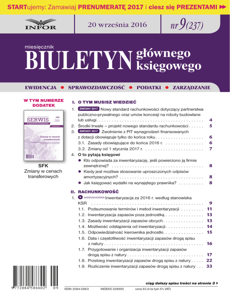 STARTujemy: Zamawiaj PRENUMERATĘ 2017 i ciesz się PREZENTAMI 20 września 2016 BIULETYN miesięcznik nr 9(237) głównego księgowego EWIDENCJA l SPRAWOZDAWCZOŚĆ l PODATKI l ZARZĄDZANIE WTYMNUMERZE I. OTYMMUSISZWIEDZIEĆ DODATEK 1. zm!any 2017 Nowystandardrachunkowościdotyczącypartnerstwa publiczno-prywatnegoorazumówkoncesjinarobotybudowlane lubusługi. . . . . . . . . . . . . . . . . . . . . . . . . . . . . . . . . . . . . . . . . . 2. Środkitrwałe–projektnowegostandardurachunkowości. . . . . . 3. zm!any 2017 ZwolnieniezPITwynagrodzeńfinansowanych zdotacjiobowiązujetylkodokońcaroku. . . . . . . . . . . . . . . . . . . 3.1.Zasadyobowiązującedokońca2016r.. . . . . . . . . . . . . . . 3.2.Zmianyod1stycznia2017r.. . . . . . . . . . . . . . . . . . . . . . . 4. O to pytają księgowi l Ktoodpowiadazainwentaryzację,jeślipowierzonojąfirmie zewnętrznej? . . . . . . . . . . . . . . . . . . . . . . . . . . . . . . . . . . . . SFK Zmianywcenach l Kiedyjestmożliwestosowanieuproszczonychodpisów transferowych amortyzacyjnych? . . . . . . . . . . . . . . . . . . . . . . . . . . . . . . . . . l Jakksięgowaćwydatkinawynajętegoprawnika? . . . . . . . . . . II. RACHUNKOWOŚĆ 1. WideoAKAdeMiA Inwentaryzacjaza2016r.wedługstanowiska KSR . . . . . . . . . . . . . . . . . . . . . . . . . . . . . . . . . . . . . . . . . . . . 1.1. Podsumowanieterminówimetodinwentaryzacji. . . . . . . . . 1.2.Inwentaryzacjazapasówpozajednostką. . . . . . . . . . . . . . . 1.3.Zasadyinwentaryzacjizapasówobcych. . . . . . . . . . . . . . . . 1.4. Możliwośćodstąpieniaodinwentaryzacji. . . . . . . . . . . . . . . 1.5.Odpowiedzialnośćkierownikajednostki. . . . . . . . . . . . . . . . 1.6.Dataiczęstotliwośćinwentaryzacjizapasówdrogąspisu znatury. . . . . . . . . . . . . . . . . . . . . . . . . . . . . . . . . . . . . . . 1.7. Przygotowanieiorganizacjainwentaryzacjizapasów drogąspisuznatury. . . . . . . . . . . . . . . . . . . . . . . . . . . . . . 1.8.Przebieginwentaryzacjizapasówdrogąspisuznatury. . . . . 1.9.Rozliczenieinwentaryzacjizapasówdrogąspisuznatury. . . 4 5 6 6 7 8 8 8 9 11 13 13 14 15 16 17 22 33 ciąg dalszy spisu treści na stronie 3 > ISSN2084-5863 INDEKS328995 cena63zł(wtym5%VAT) www.sklep.infor.pl 22 212 07 30, 801 626 666 [email protected] 2. Leasingzwrotnywksięgachrachunkowych. . . . . . . . . . . . . . . . . . . . . . . . . . . . . . . . . . . 2.1.Leasingzwrotny. . . . . . . . . . . . . . . . . . . . . . . . . . . . . . . . . . . . . . . . . . . . . . . . . . . 2.2.Korzyściwynikającezzawarciaumowyleasinguzwrotnego . . . . . . . . . . . . . . . . . . . 2.3.Przedmiotleasinguzwrotnego . . . . . . . . . . . . . . . . . . . . . . . . . . . . . . . . . . . . . . . . 2.4.Wycenaprzedmiotówleasinguzwrotnego. . . . . . . . . . . . . . . . . . . . . . . . . . . . . . . . 2.5.Zasadyrachunkowościstosowaneprzyleasinguzwrotnym. . . . . . . . . . . . . . . . . . . . 2.6.Sprzedażśrodkatrwałegowujęciubilansowymipodatkowym. . . . . . . . . . . . . . . . . 2.7.Operacyjnyleasingzwrotny. . . . . . . . . . . . . . . . . . . . . . . . . . . . . . . . . . . . . . . . . . 3.Wycenamateriałówbiurowychipaliwa–zasadywynikającezpolitykirachunkowości. . . . 50 51 51 52 52 52 54 57 57 III.ROZLICZENIAPODATKOWE 1. Czyniedoborymagazynowemogąstanowićkosztuzyskaniaprzychodu. . . . . . . . . . . . . . 59 IV.PRAWOGOSPODARCZE 1.Dalszezmianywhipotecenanieruchomościrolnejorazwobrocieziemią po16sierpnia2016r.. . . . . . . . . . . . . . . . . . . . . . . . . . . . . . . . . . . . . . . . . . . . . . . . . . 1.1. Hipotekananieruchomościrolnejustanawianapo16sierpnia2016r.. . . . . . . . . . . 1.2.Postępowaniawszczętepo16sierpnia2016r.. . . . . . . . . . . . . . . . . . . . . . . . . . . . 1.3.Postępowaniawszczętepo30kwietnia2016r.izakończone przed16sierpnia2016r. . . . . . . . . . . . . . . . . . . . . . . . . . . . . . . . . . . . . . . . . . . . 1.4.Postępowaniawszczętepo30kwietnia2016r.iniezakończone do16sierpnia2016r. . . . . . . . . . . . . . . . . . . . . . . . . . . . . . . . . . . . . . . . . . . . . . . 1.5.Pozostałezmianywobrocieziemiąrolnąobowiązująceod16sierpnia2016r.. . . . . V.RACHUNEKKOSZTÓWIZARZĄDZANIEFINANSAMI 1. WideoAKAdeMiA Flotasamochodowawfirmie–zasadyrozliczaniakosztówzwiązanych zużytkowaniemsamochodówsłużbowychprzezpracowników. . . . . . . . . . . . . . . . . . . . . 1.1. Nieodpłatneudostępnieniesamochodusłużbowego docelówprywatnych/służbowych. . . . . . . . . . . . . . . . . . . . . . . . . . . . . . . . . . . . . 1.2.Dojazddopracysamochodemsłużbowym. . . . . . . . . . . . . . . . . . . . . . . . . . . . . . . 1.3.Częściowoodpłatneudostępnieniepojazdusłużbowego . . . . . . . . . . . . . . . . . . . . 1.4.Najemautasłużbowego–całkowicieodpłatneudostępnieniepojazdu . . . . . . . . . . 2. Prawidłowywybórbiegłegorewidentaorazzawarcieumowyobadaniesprawozdania finansowego. . . . . . . . . . . . . . . . . . . . . . . . . . . . . . . . . . . . . . . . . . . . . . . . . . . . . . . . . 2.1. Jednostkizobligowanedopoddaniasprawozdaniafinansowegobadaniu przezbiegłegorewidentaicelbadaniasprawozdaniafinansowego . . . . . . . . . . . . . 2.2. Wybórbiegłegorewidenta–właściwyczaswyboruorazprzypisanytryb. . . . . . . . . . 2.3.Zawarcieumowyobadaniesprawozdaniafinansowegoprzezbiegłegorewidenta . . 2.4.Podmiotyuprawnionedobadaniasprawozdańfinansowych. . . . . . . . . . . . . . . . . . . 3. Ostatnimomentnawybórbiegłegorewidenta. . . . . . . . . . . . . . . . . . . . . . . . . . . . . . . . . 61 61 62 62 63 64 65 66 66 69 69 73 73 74 77 80 81 Wideoakademia poleca: n Inwentaryzacja za 2016 r. według stanowiska KSR n F lota samochodowa w firmie – zasady rozliczania kosztów związanych z użytkowaniem samochodów służbowych przez pracowników Zobacz na www.wideoakademia.infor.pl 4 I. O TYM MUSISZ WIEDZIEĆ zm!any 2017 1.Nowystandardrachunkowości dotyczącypartnerstwapubliczno- -prywatnegoorazumówkoncesji narobotybudowlanelub